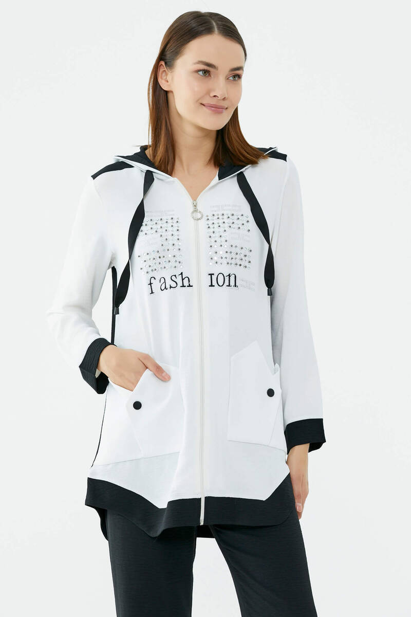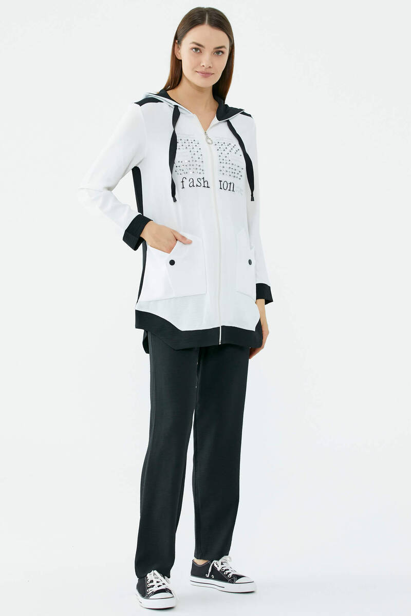 Create impressive looks with the crepe suit consisting of a hooded, long sleeved, zip closure that offers ease of use, a tunic with stone details and an elastic waistband, tube-leg trousers.