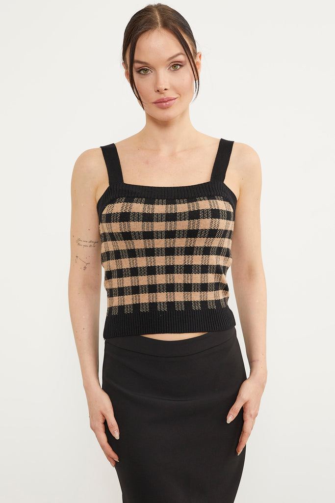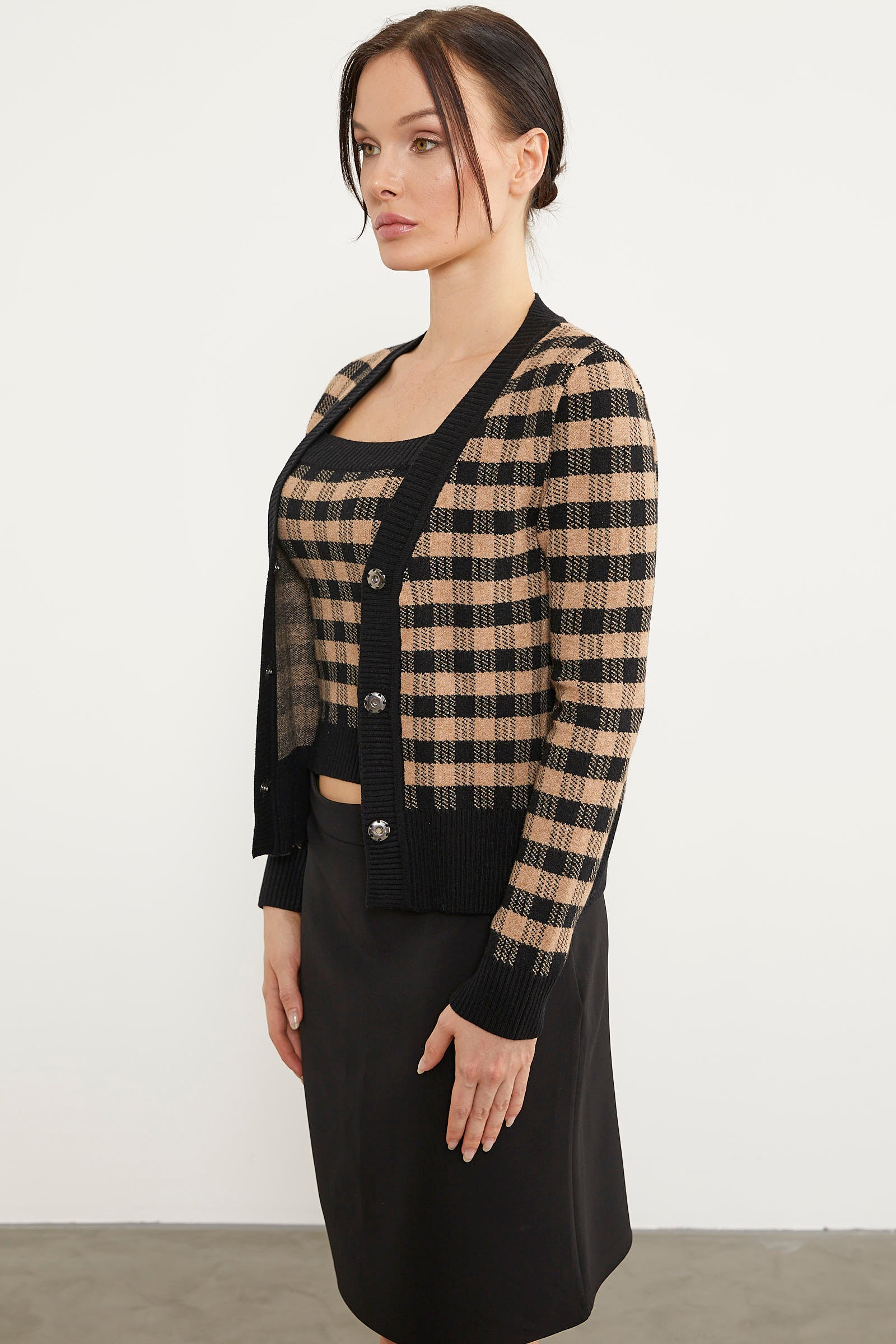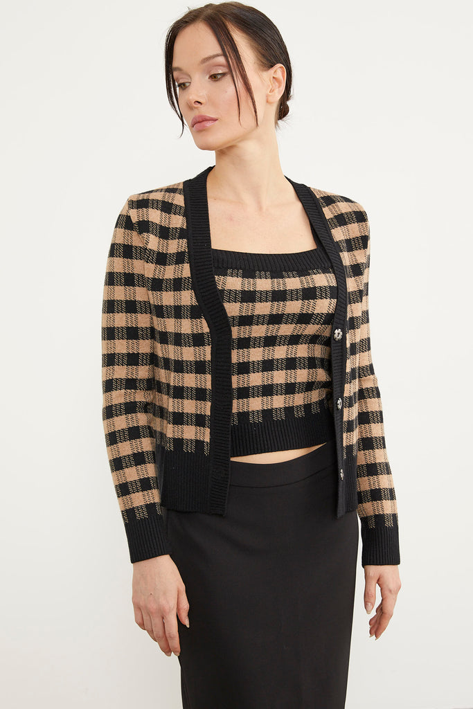 You can achieve a harmonious look thanks to the two-piece knitwear set consisting of a long-sleeved cardigan with front button details and a strappy blouse. It will add movement to even your simplest looks with its striped patterns and save you from the trouble of "what to wear?"