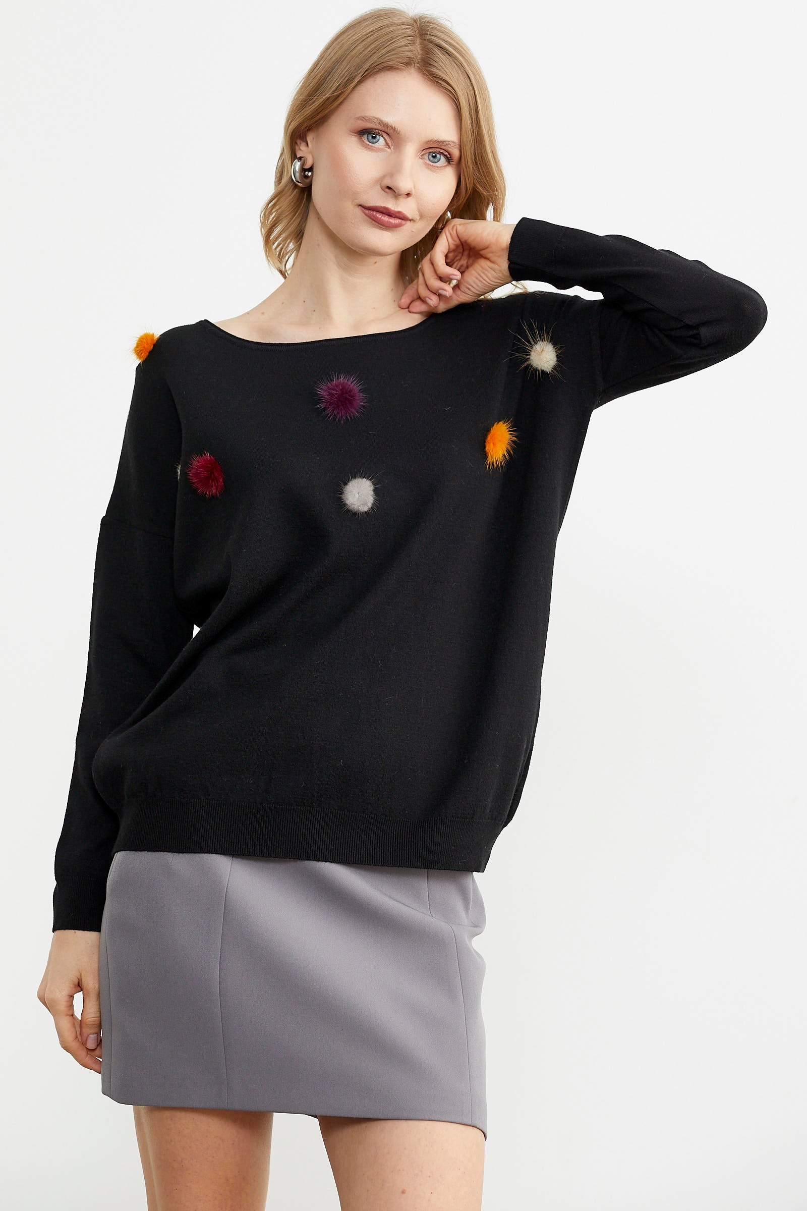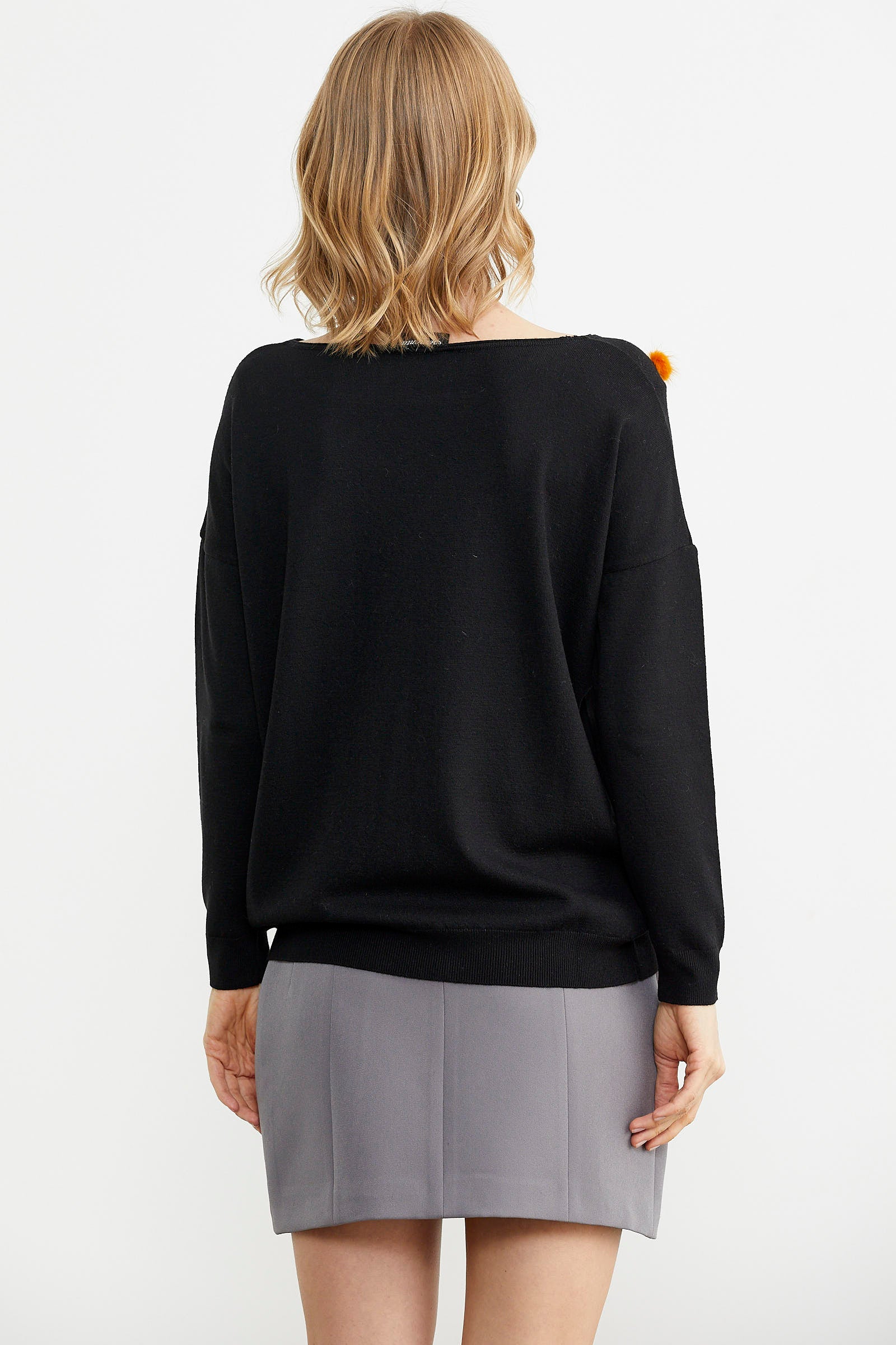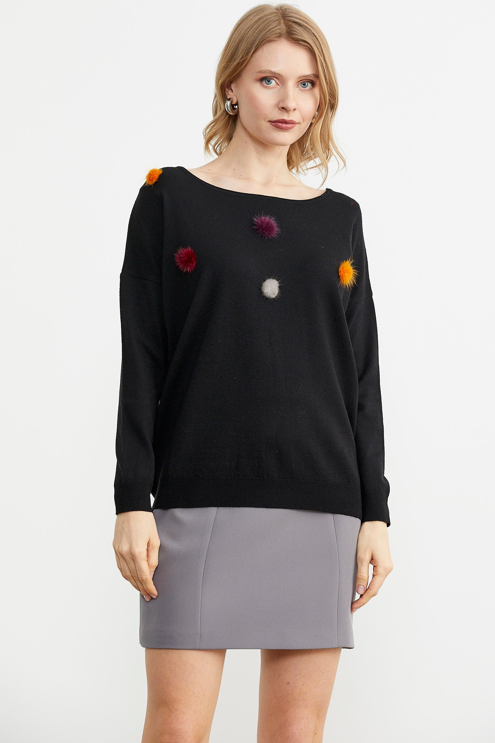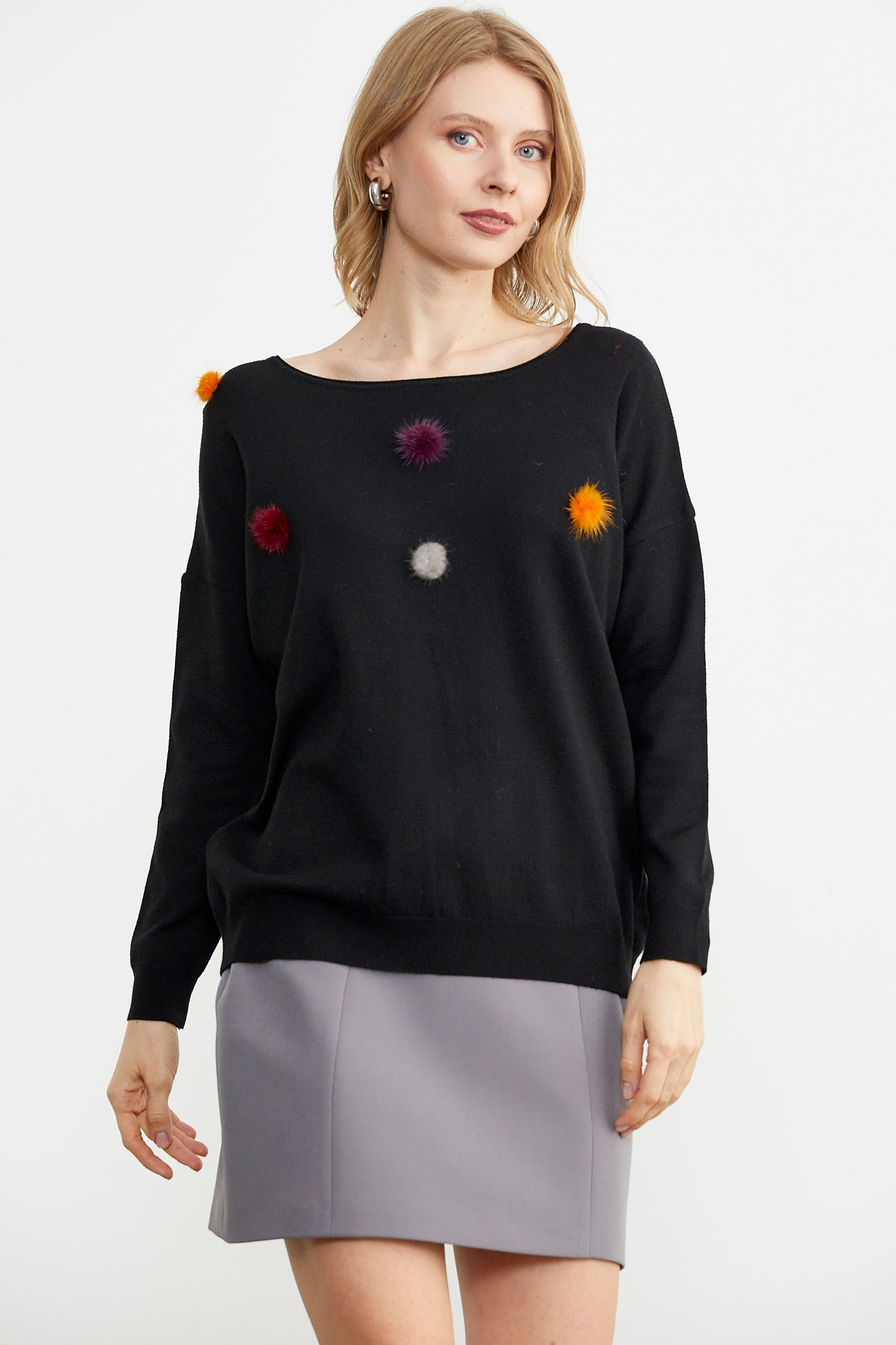 Boat Neck Pompom Detailed Knitwear Sweater - Black
