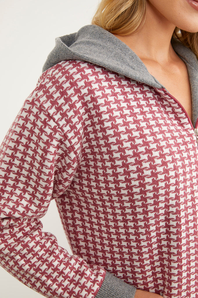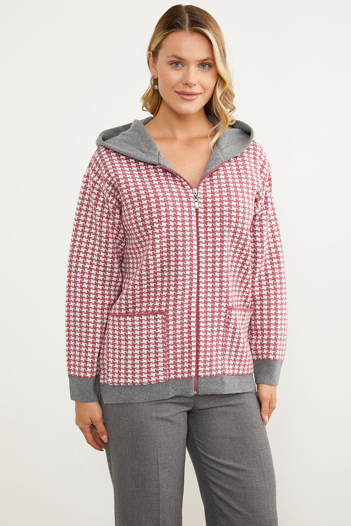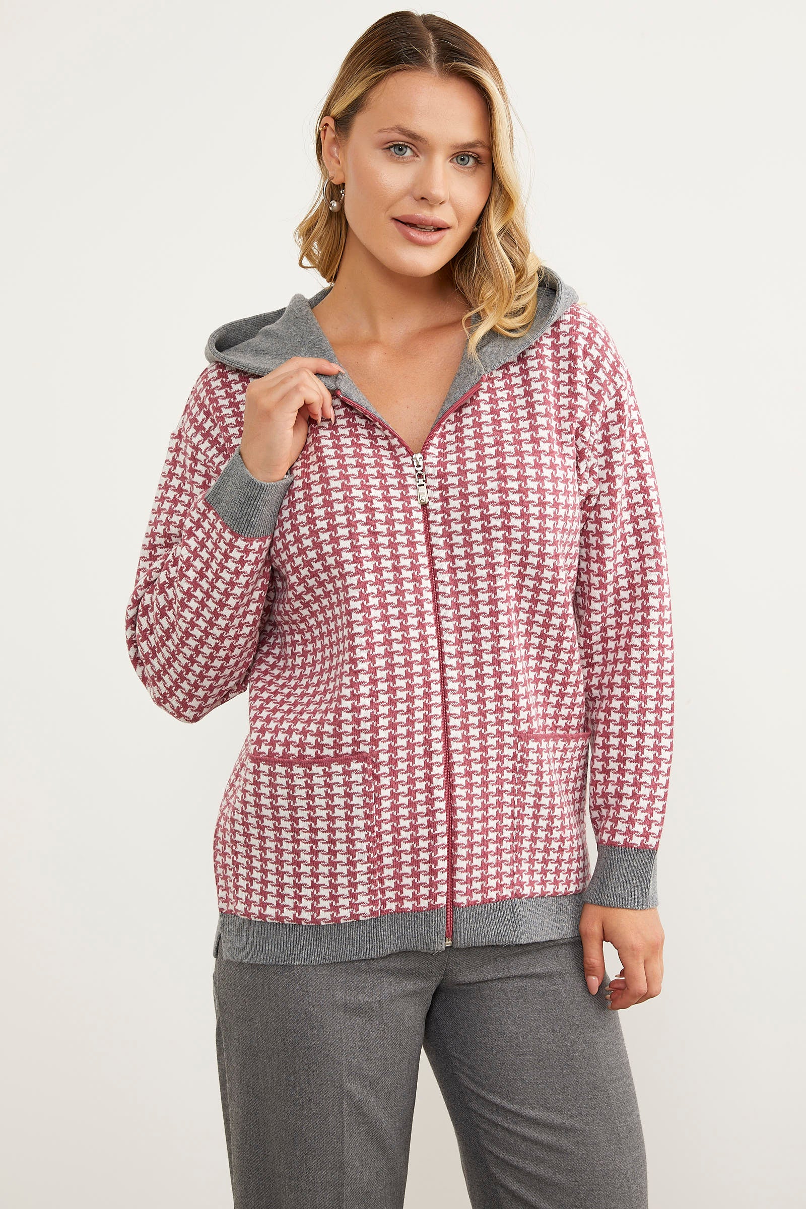 Houndstooth Patterned Pocket Knitted Cardigan - Rose
