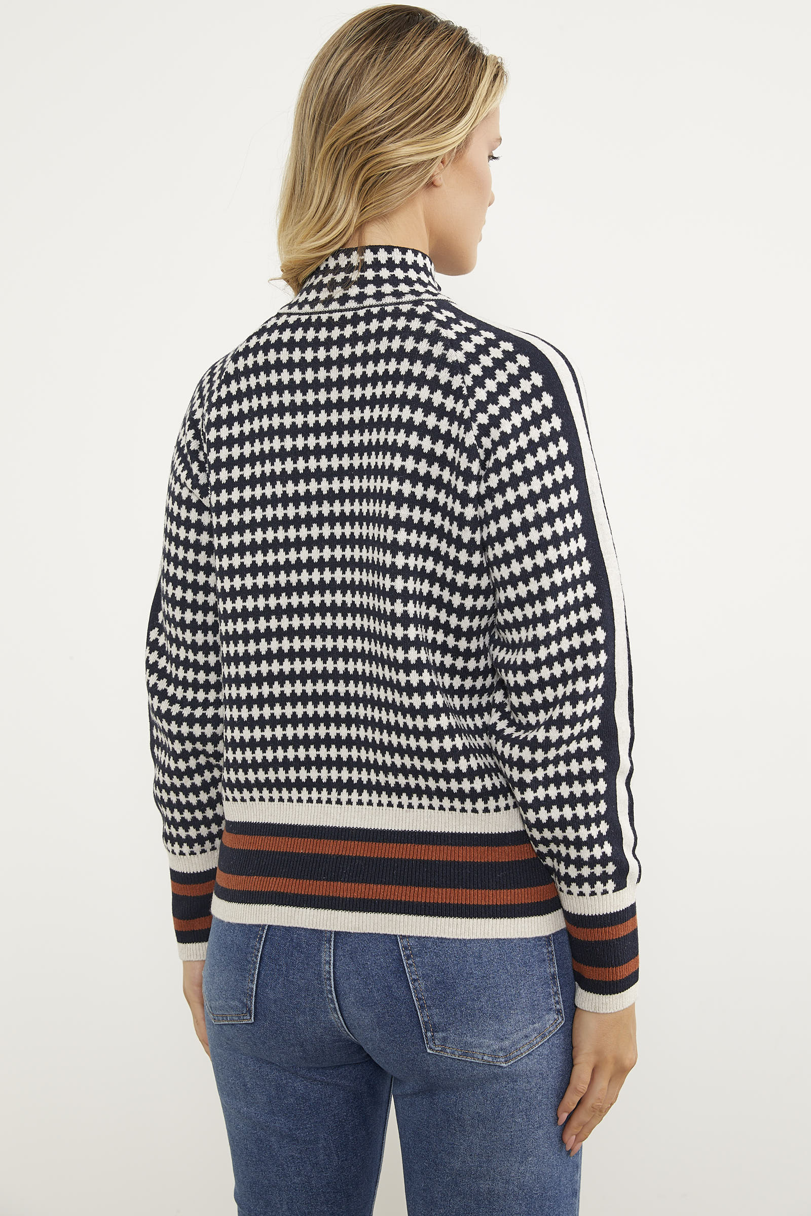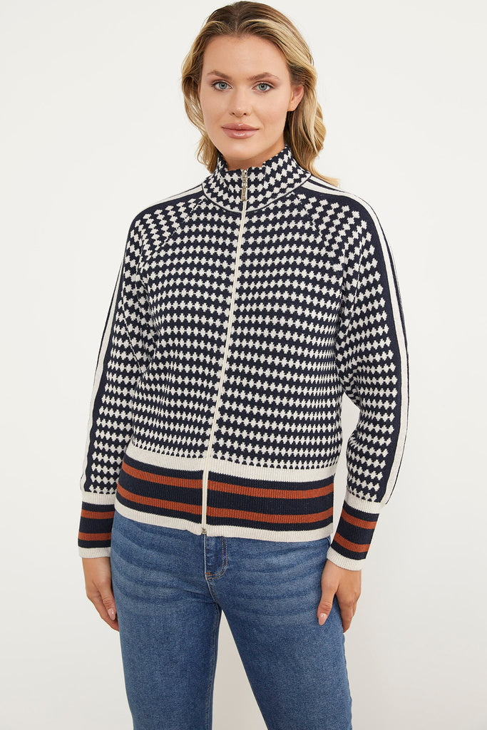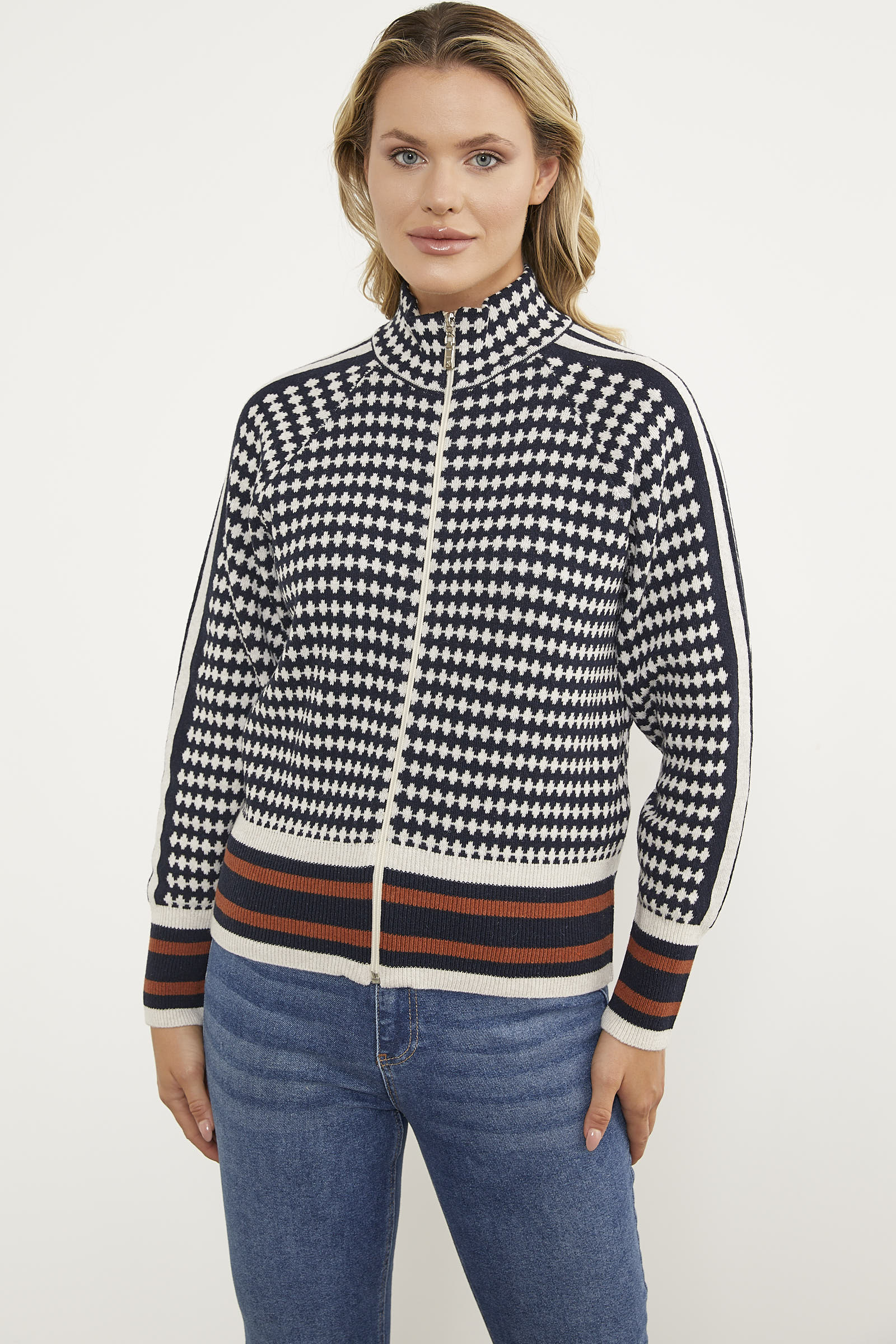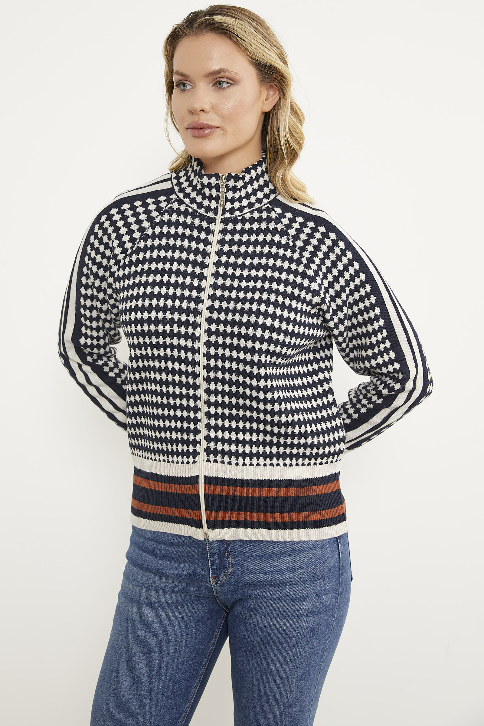 Houndstooth Patterned Zippered Knitted Cardigan - Navy Blue