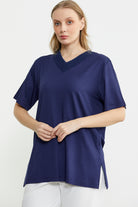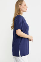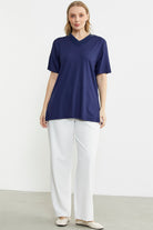 Short Sleeve V Neck Knitted Blouse - Navy Blue