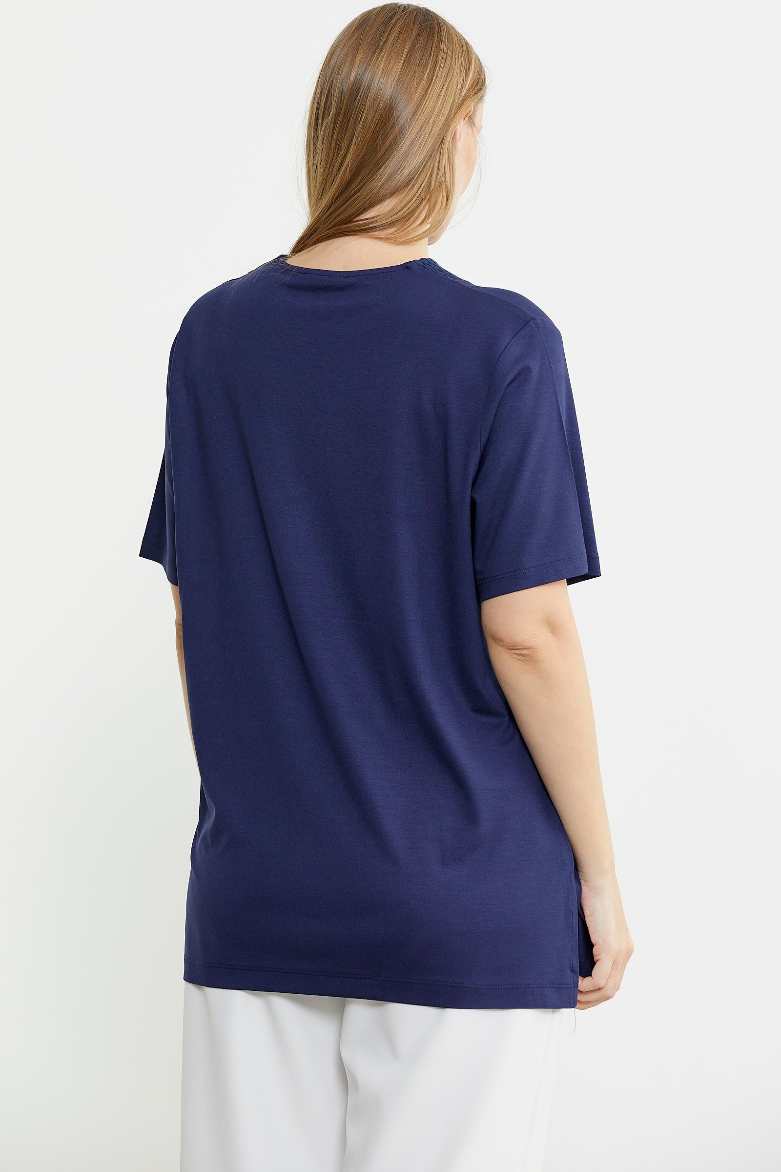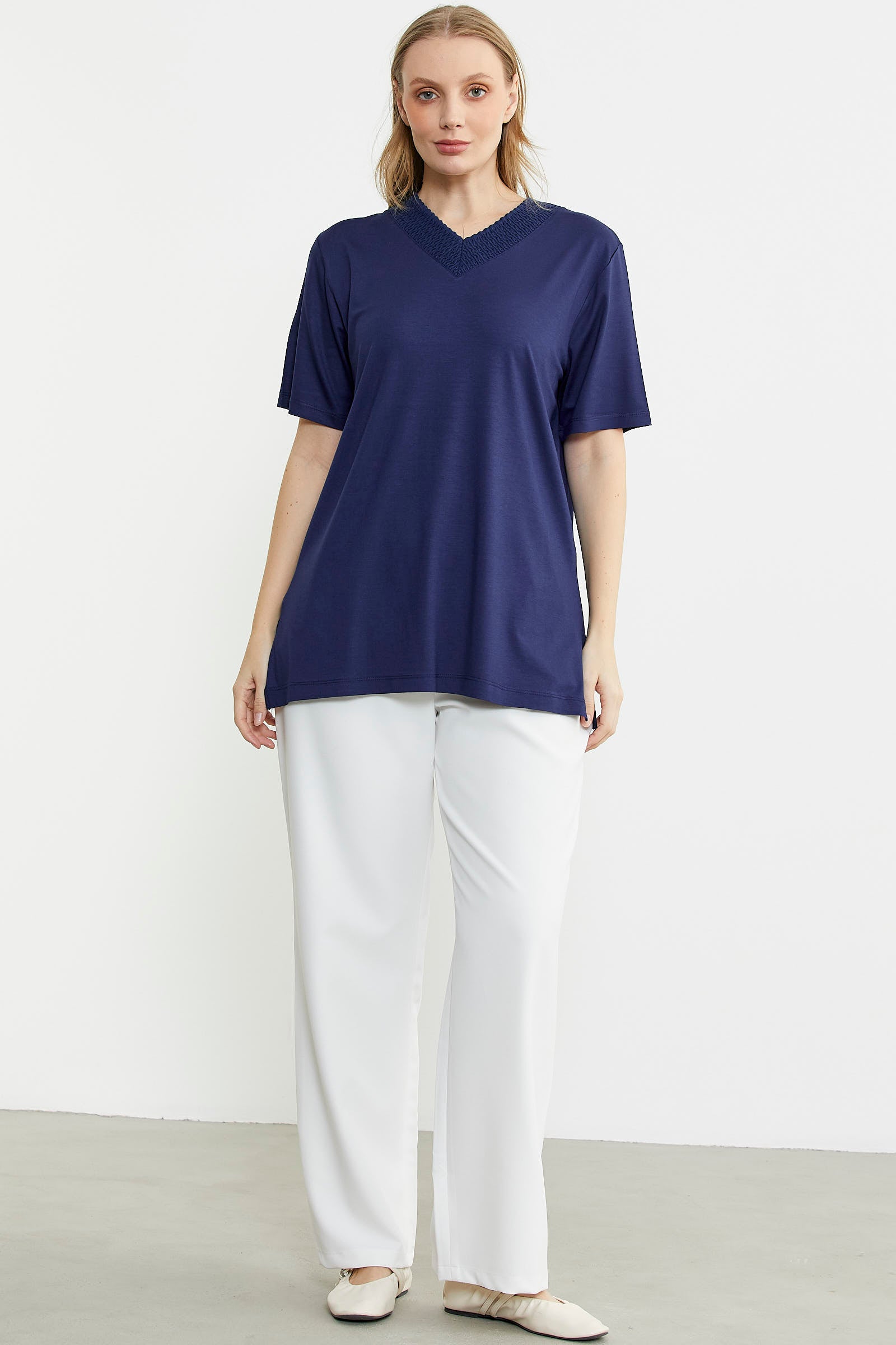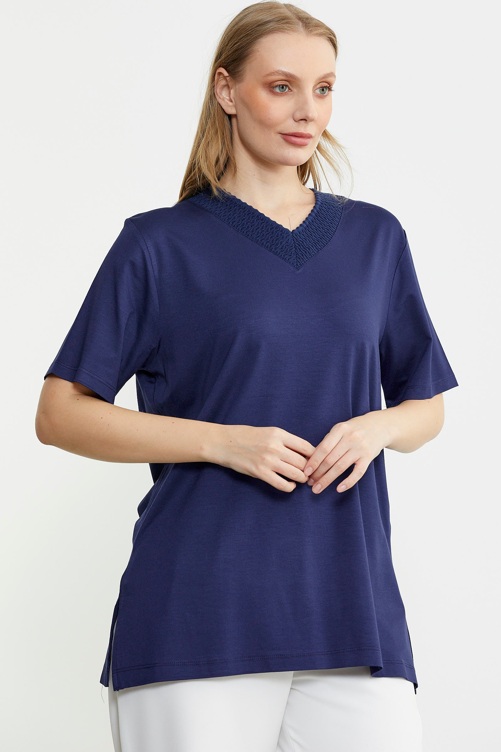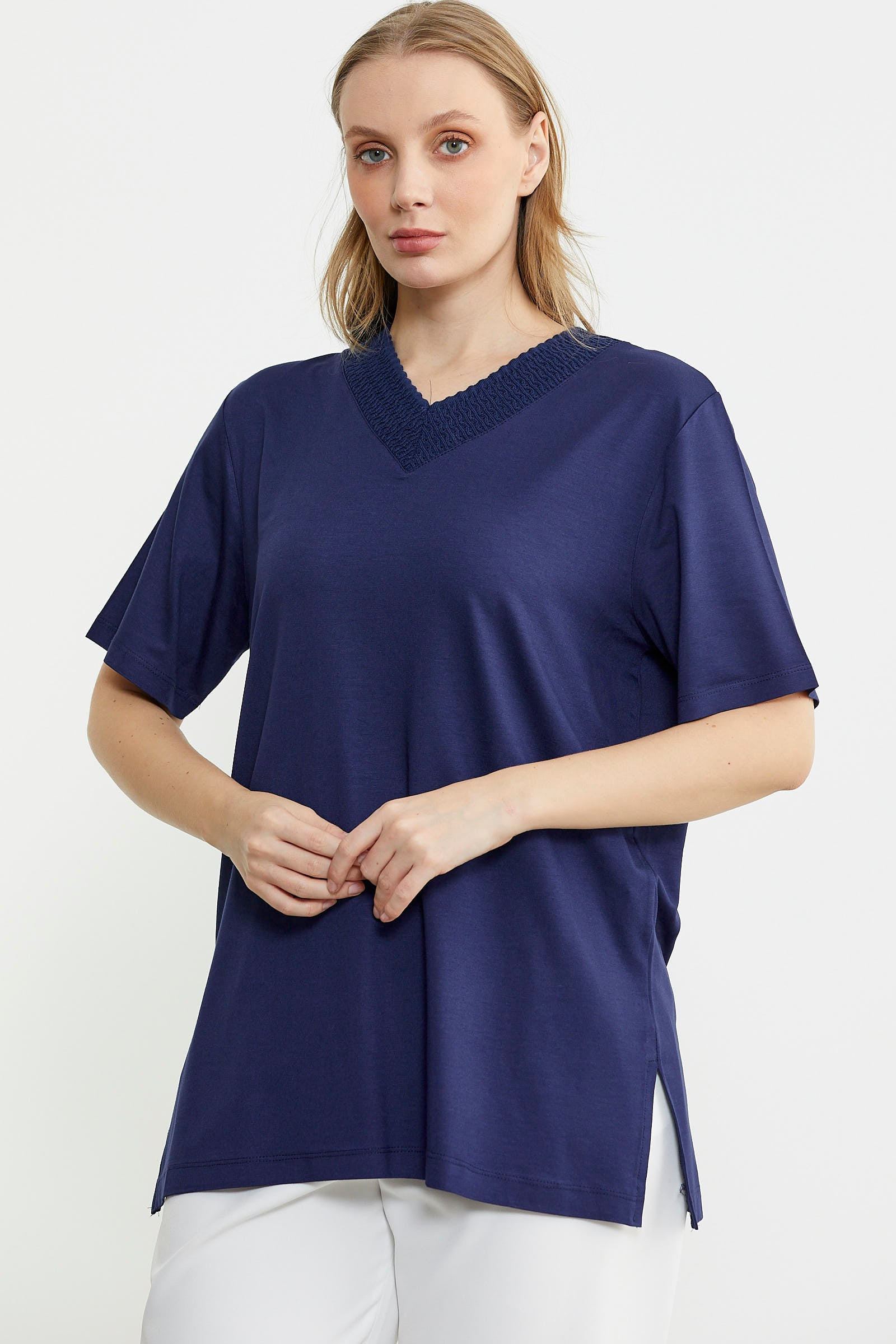 Standing out with its elegant details, the loose-fitting combed cotton blouse has a knitted collar detail in the same color. It provides a light and breathable use with its soft textured fabric.