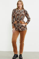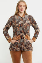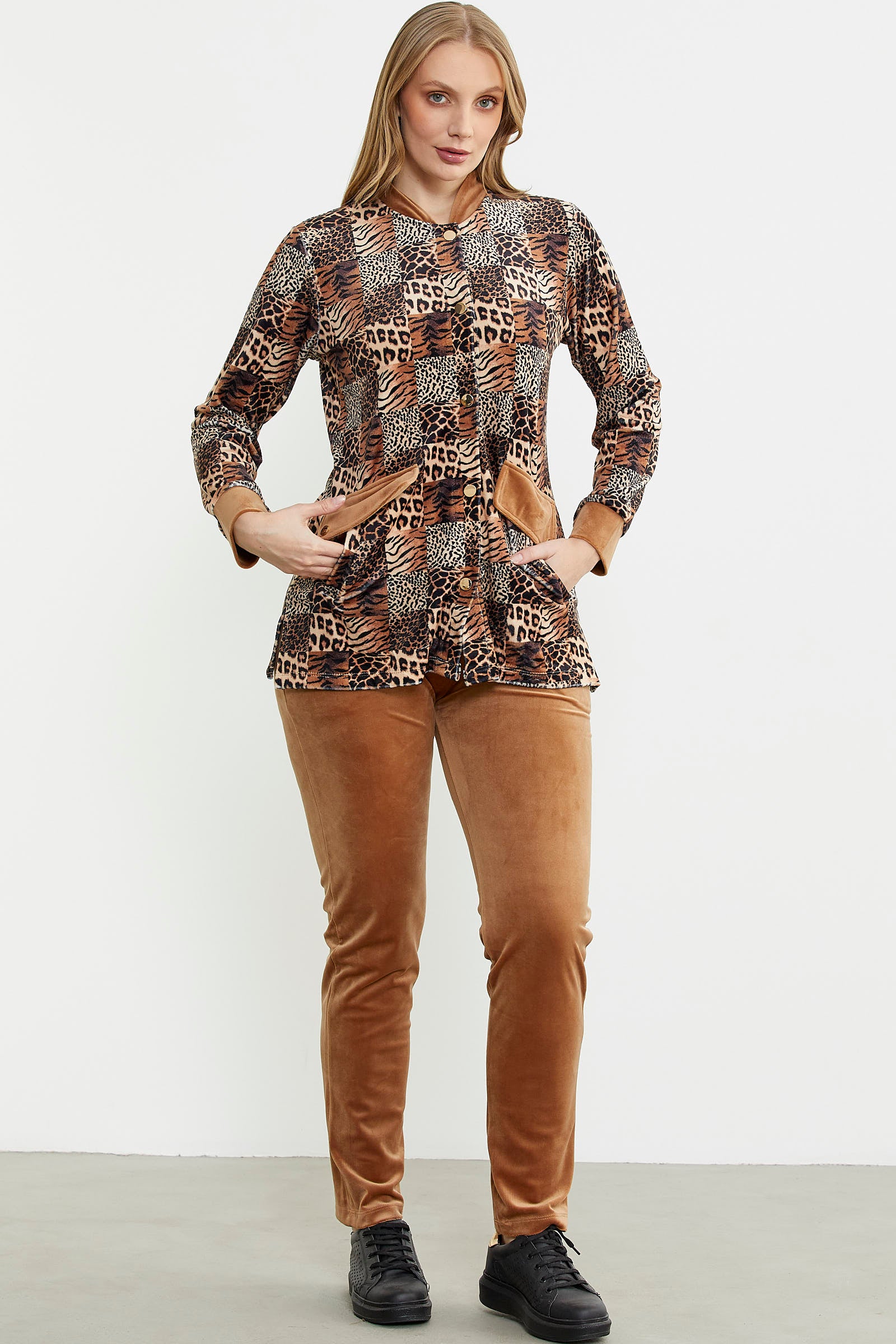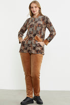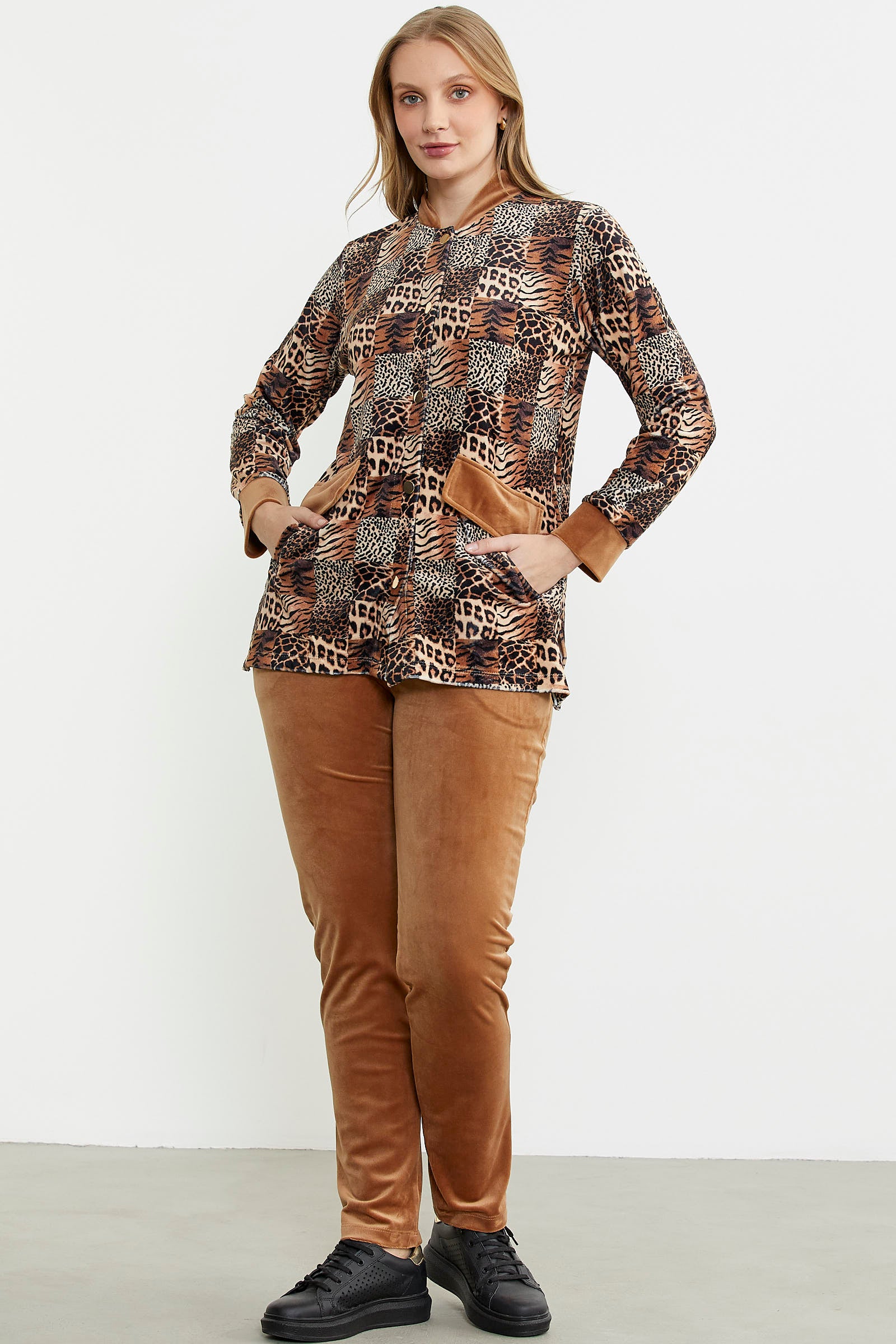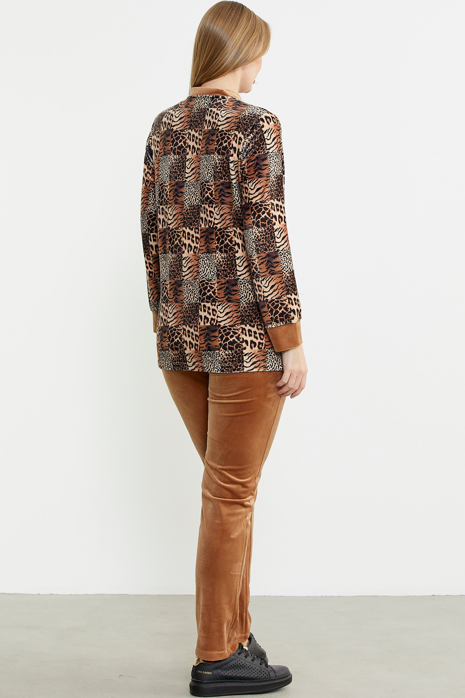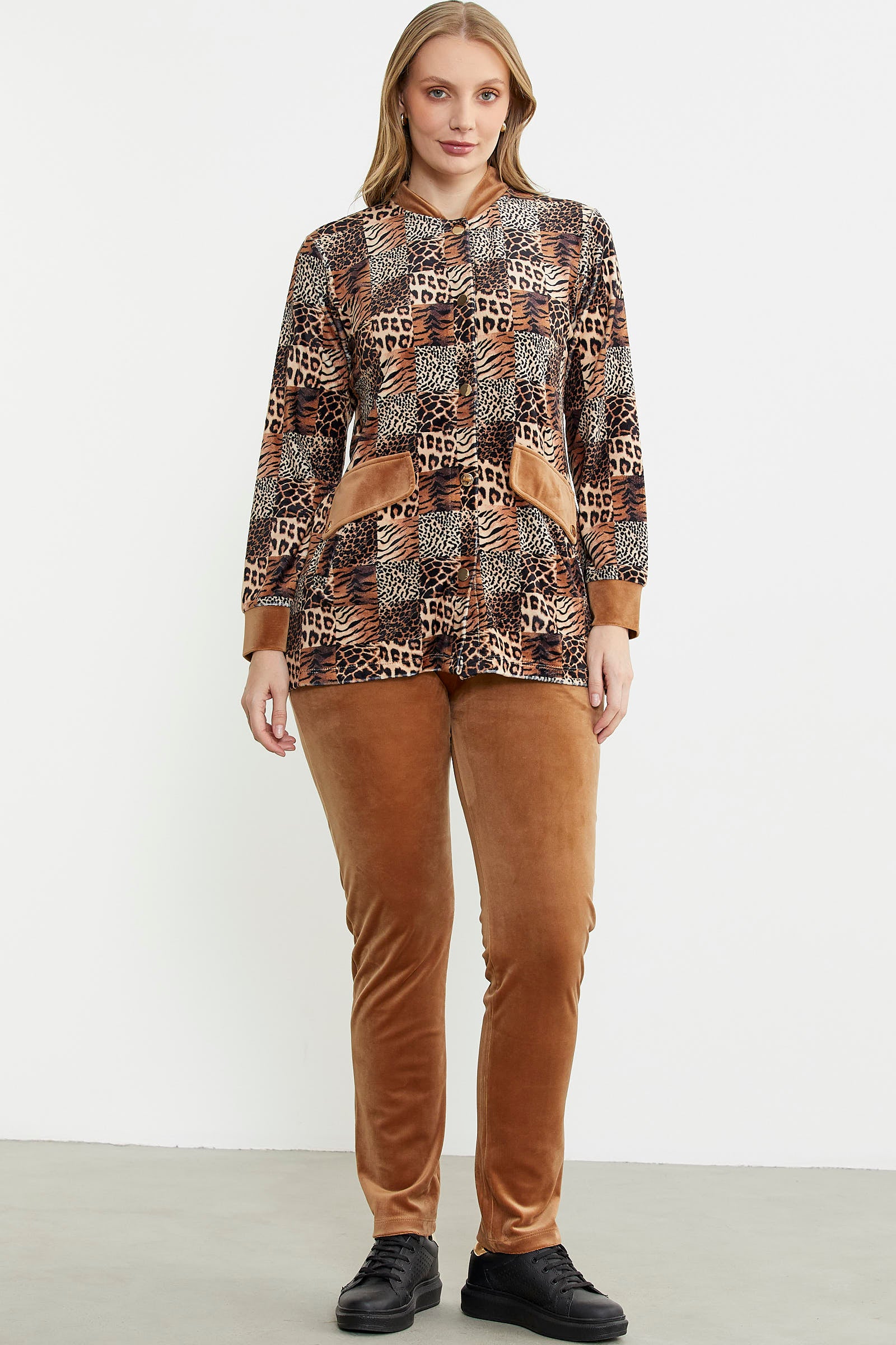 Leopard Patterned Tunic Velvet Set - Camel