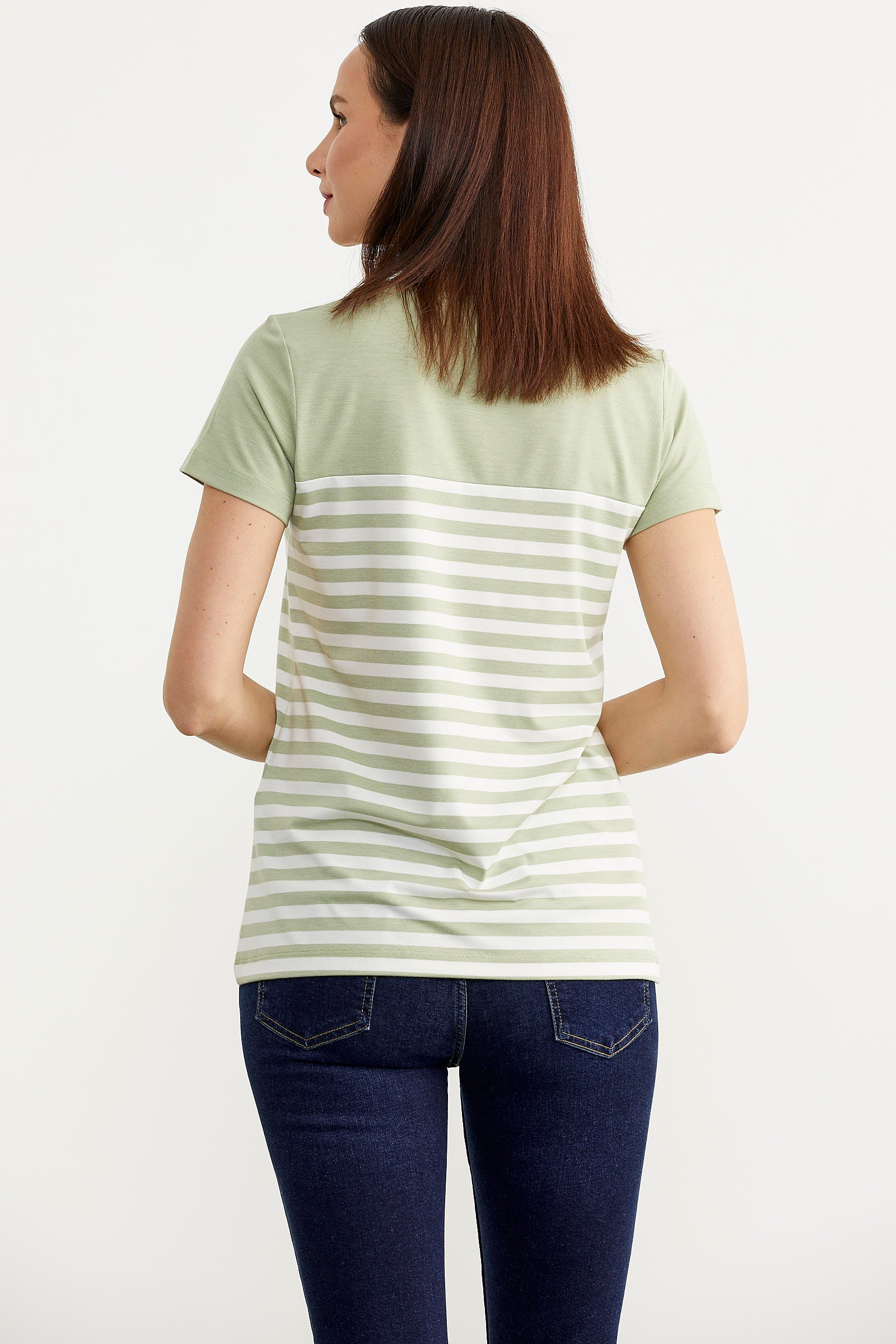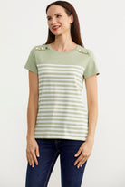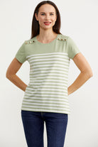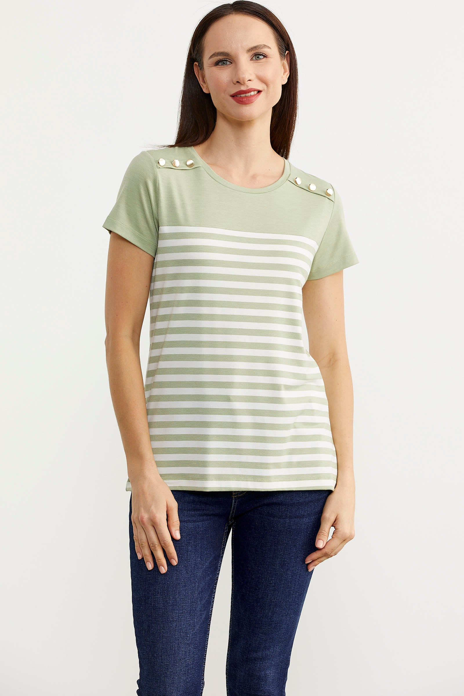 The striped t-shirt with metal button details offers a sporty elegance with its straight shoulder transition.