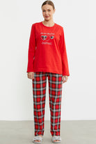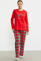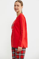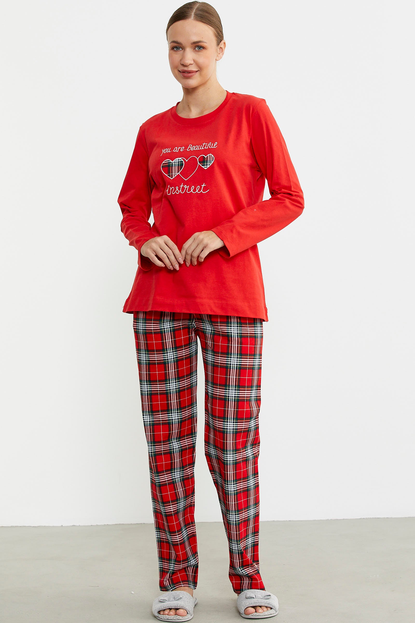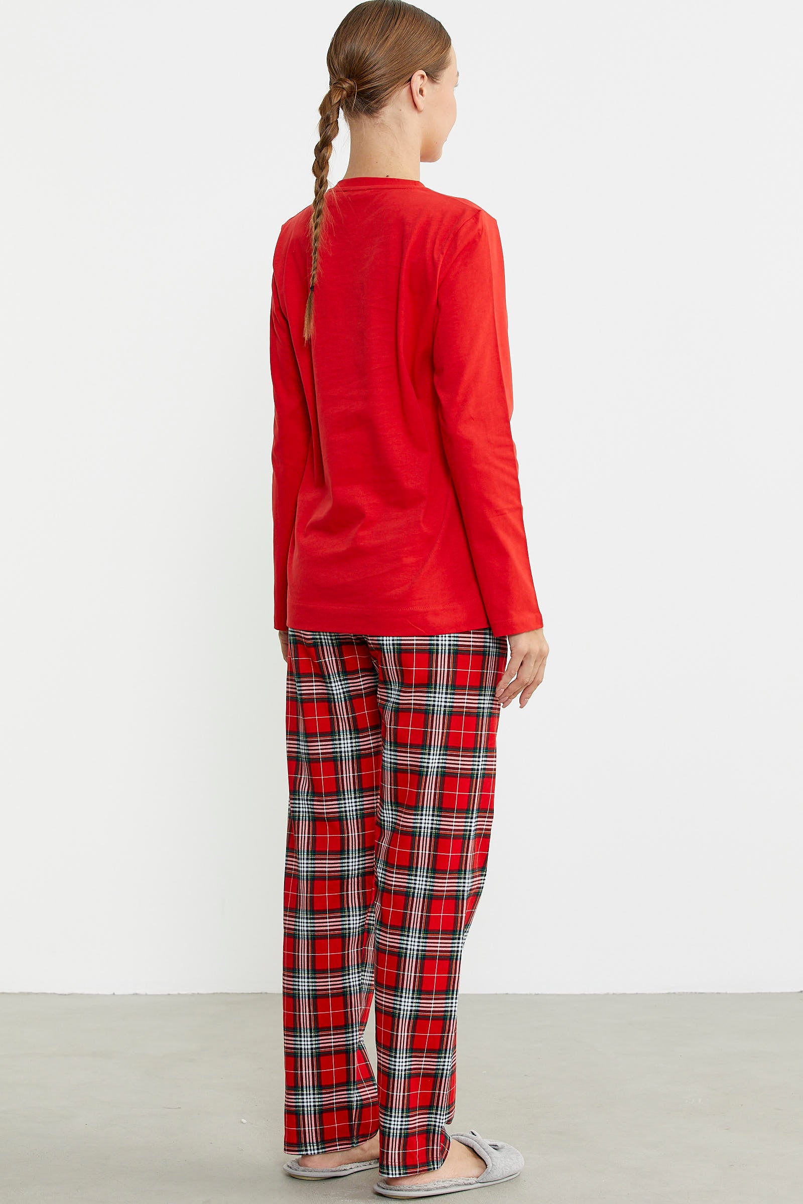 The upper body of the plaid combined pajama set is produced in a plain style. There is an embroidery detail that completes the combination. It is a comfortable fit.