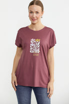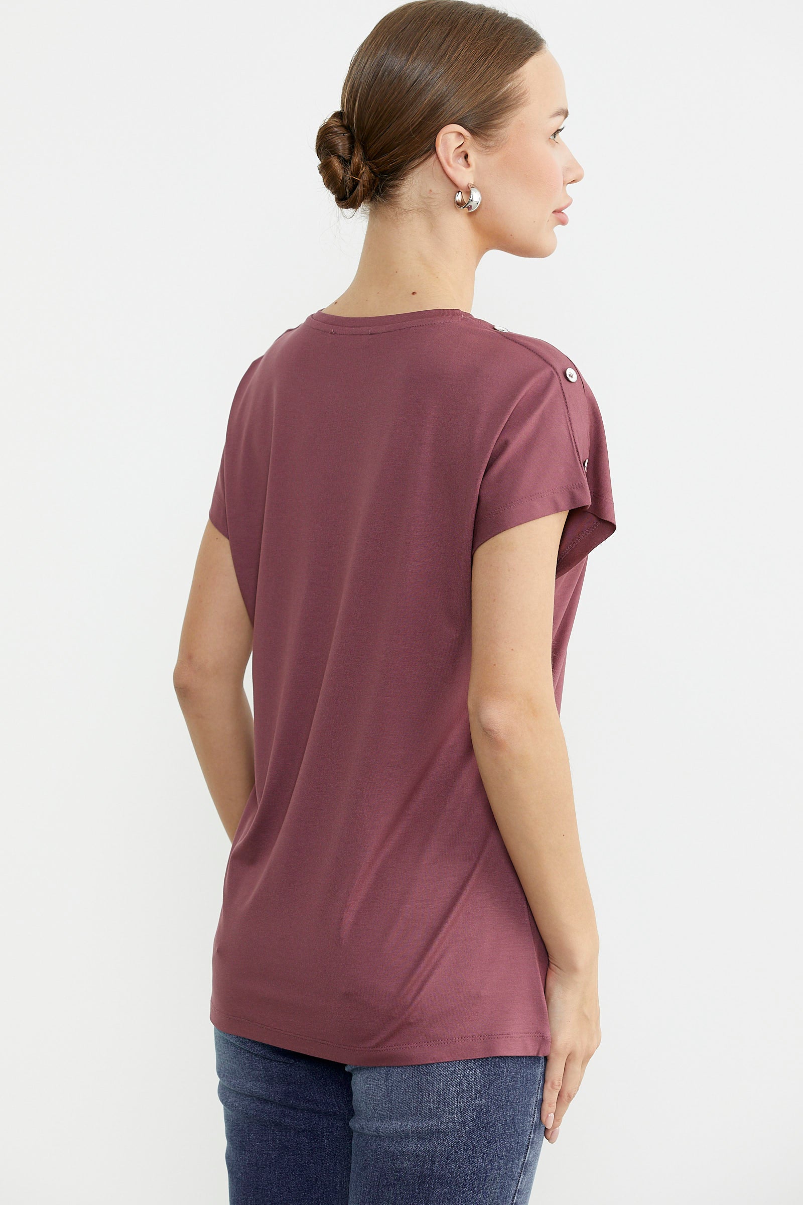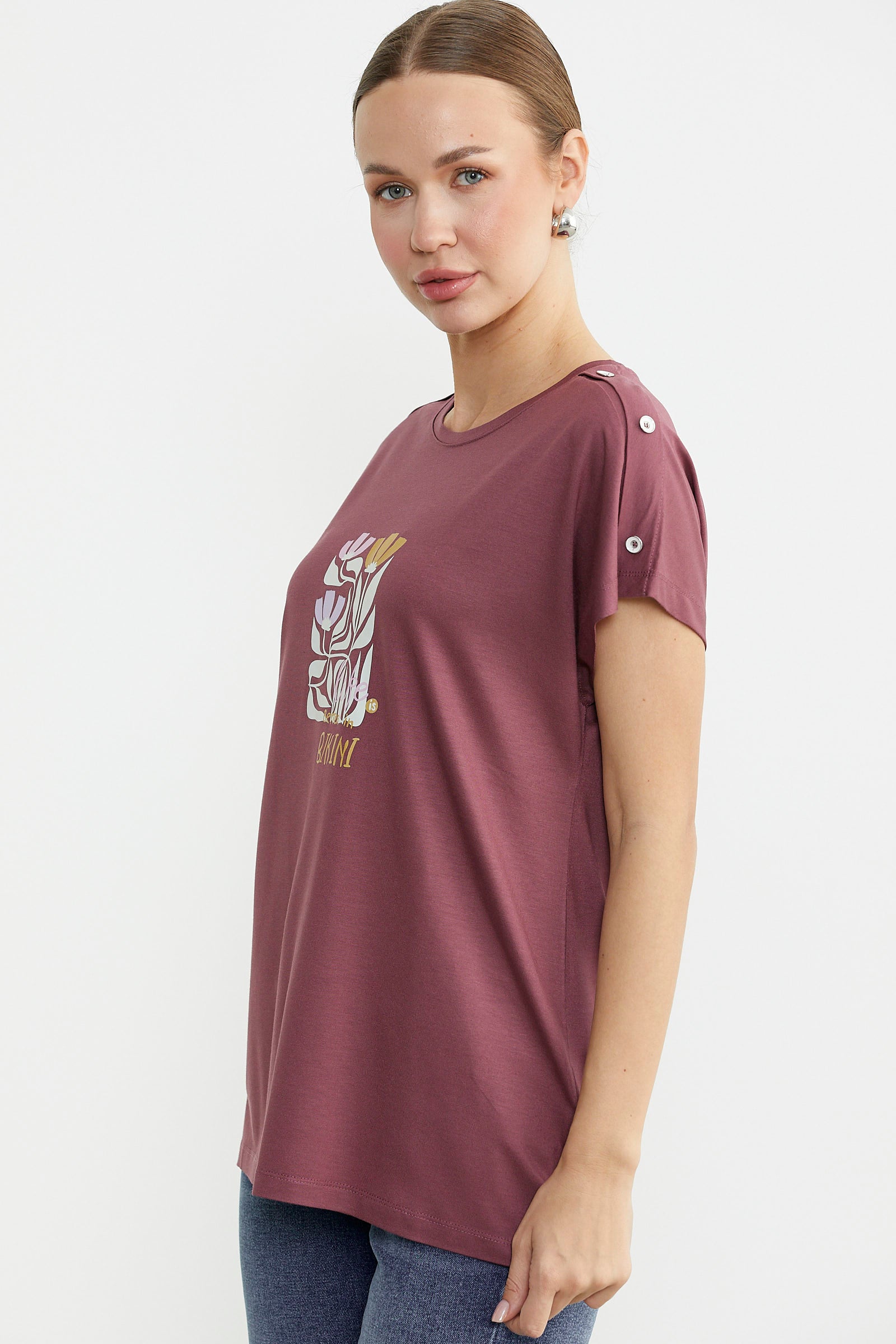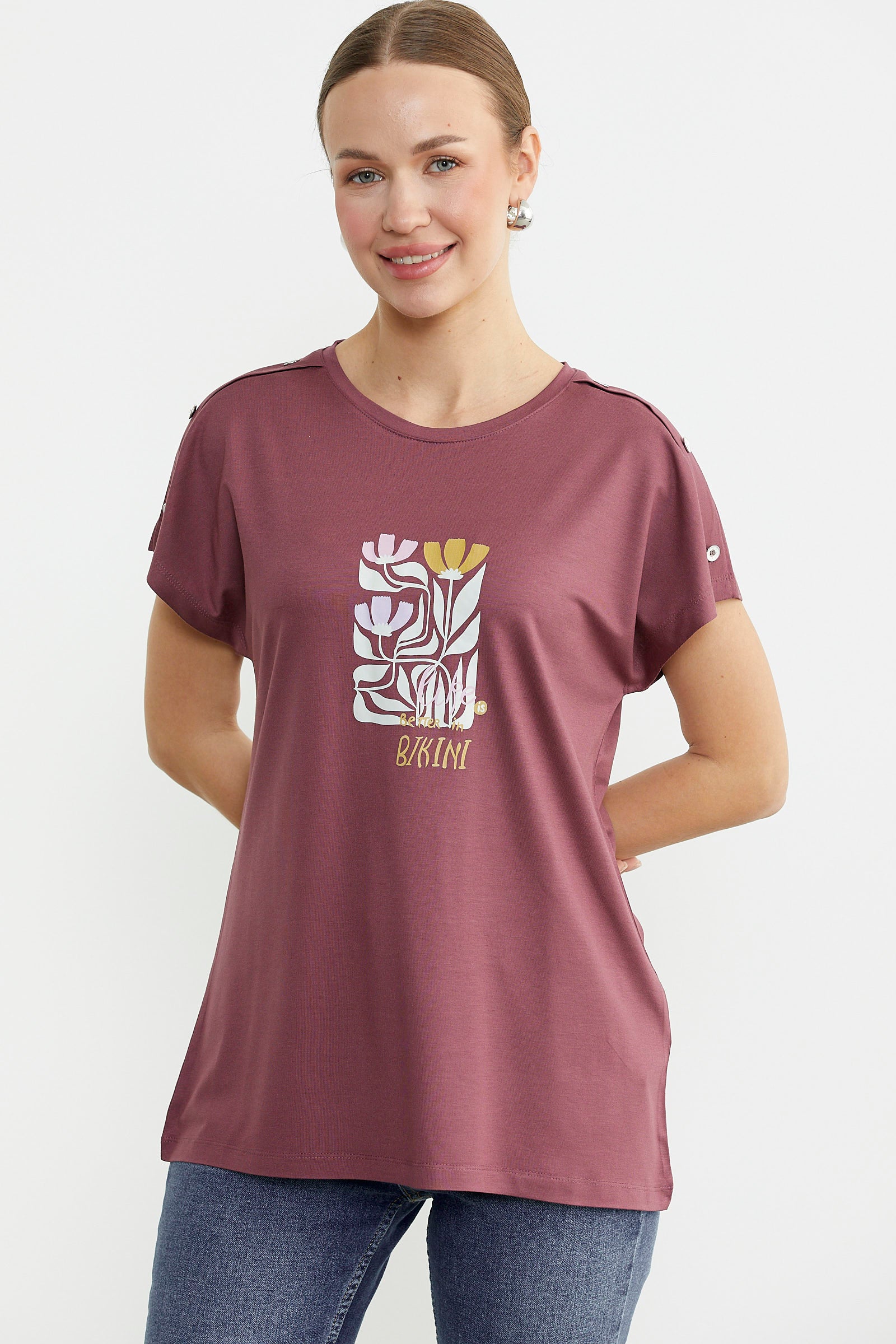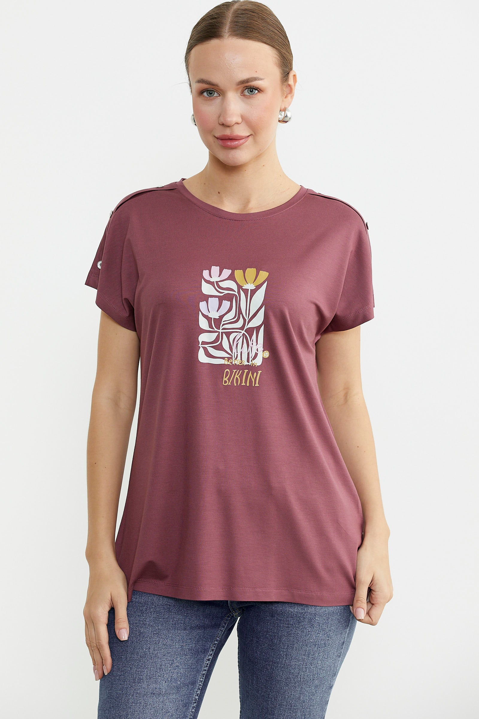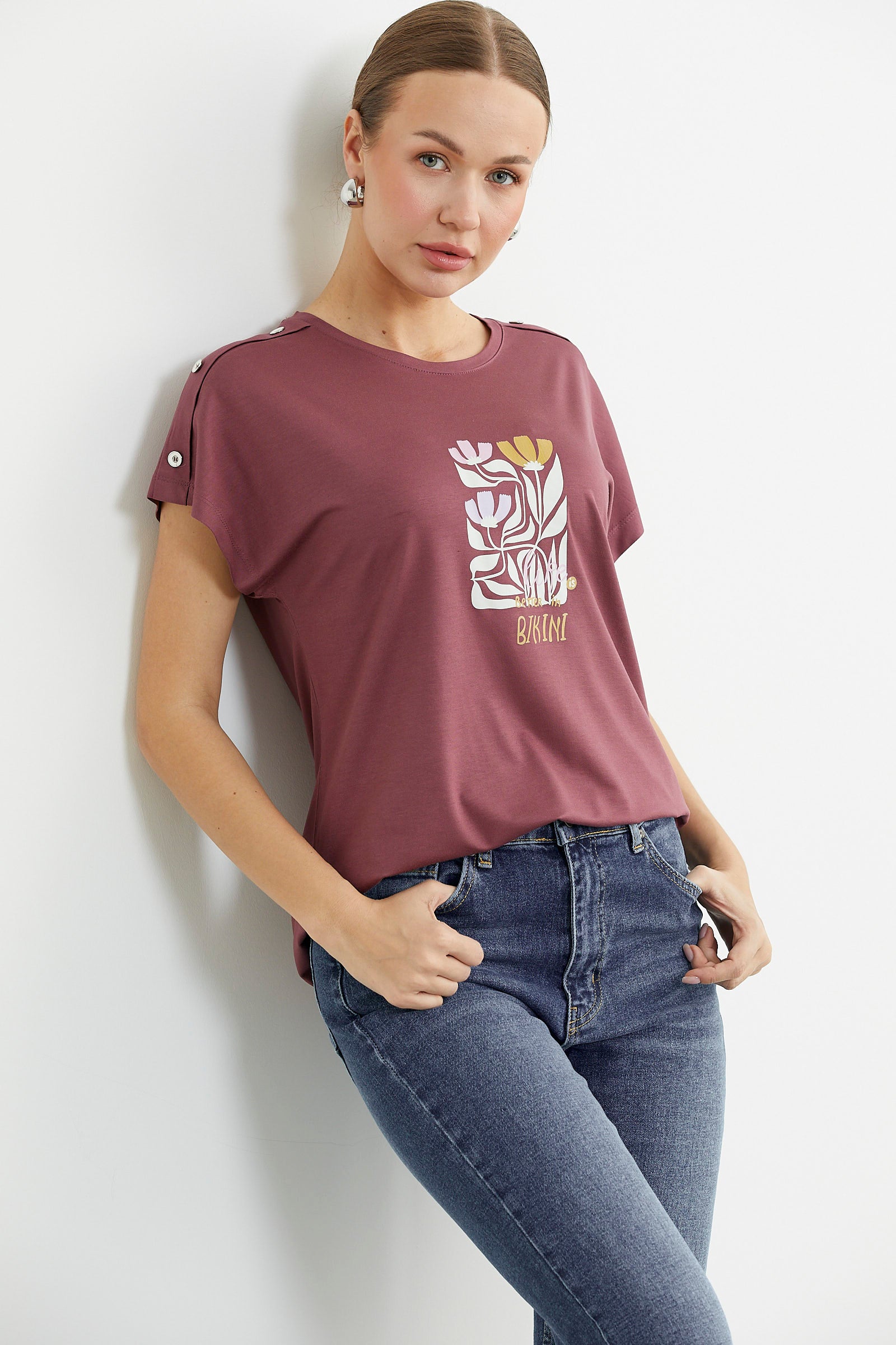 Omuz Detaylı Baskılı Penye Tişört - Gül