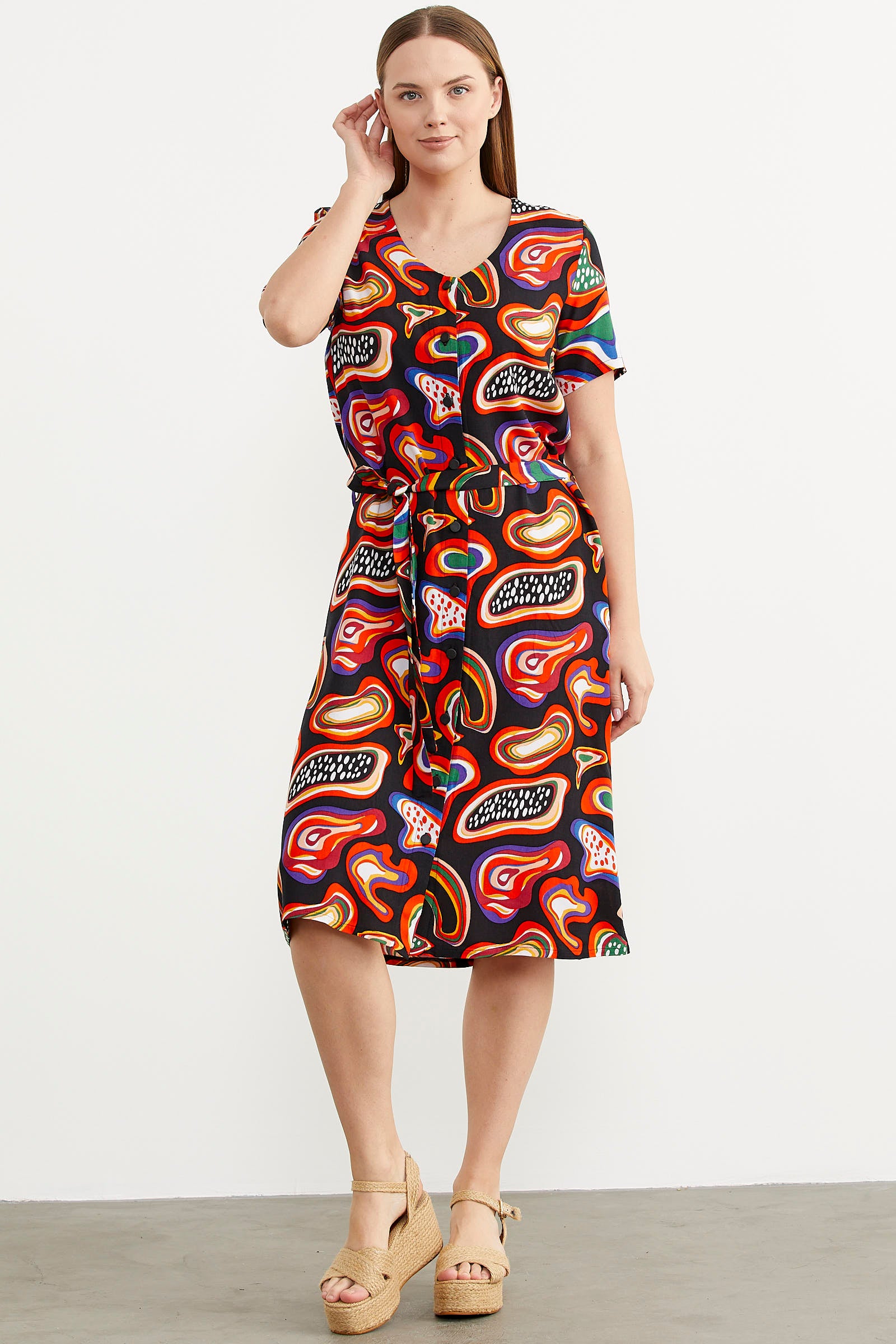 Front Buttoned Patterned Viscose Dress - Black