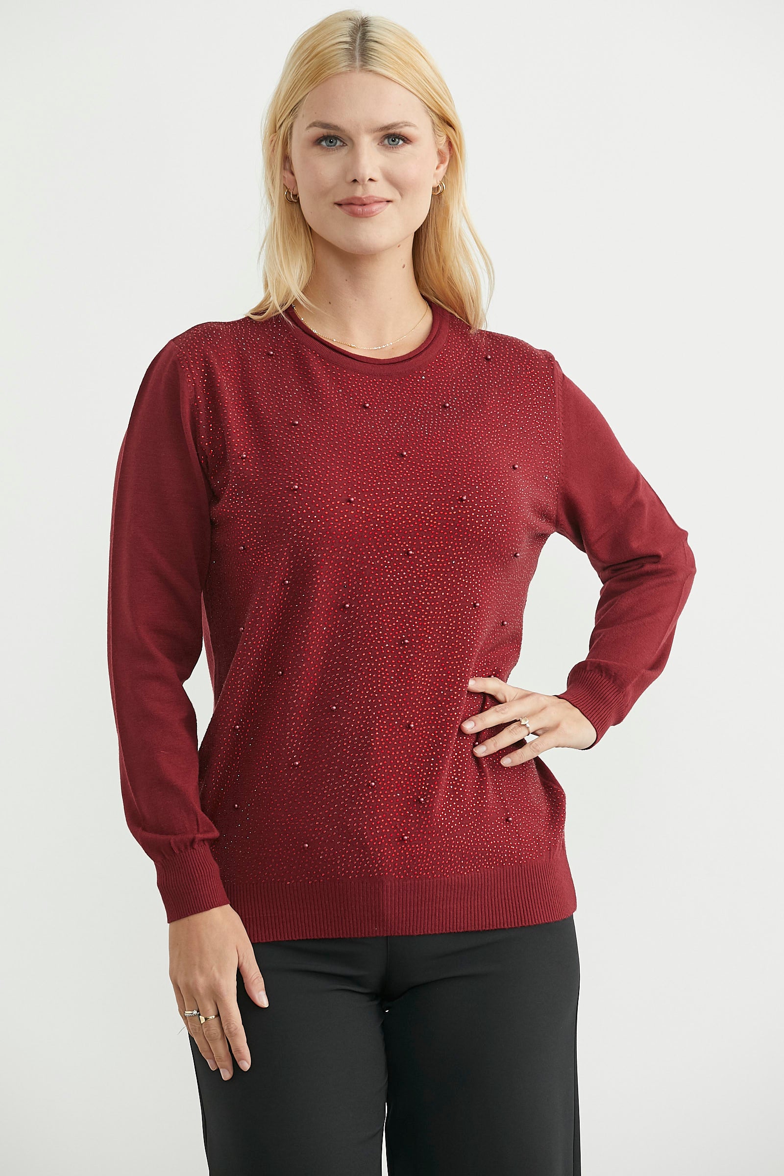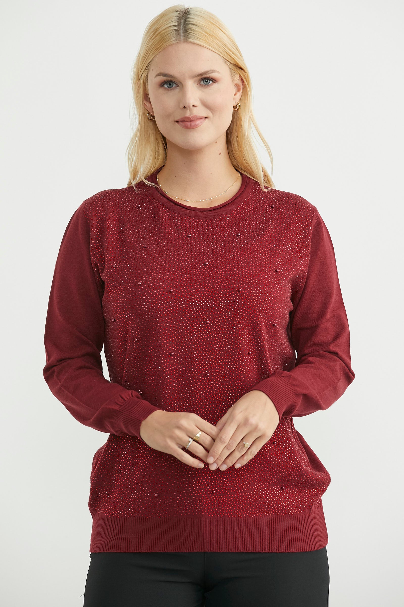 Ön bedeni tamamen taş detaylı, yumuşak dokulu, uzun kol triko kazak standart kalıptır.
