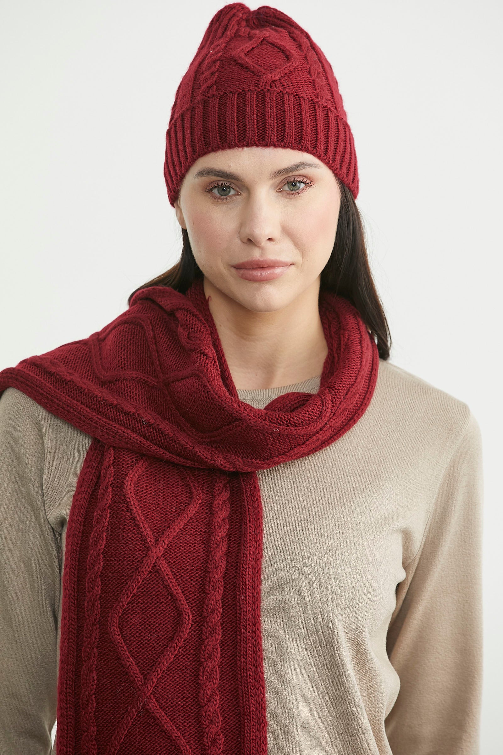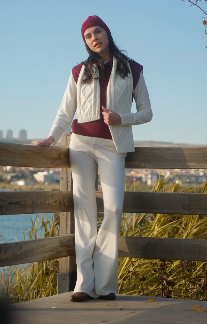 Yün karışımlı iplikten üretilen, kenarı geniş katlı, yumuşak dokulu triko bere.