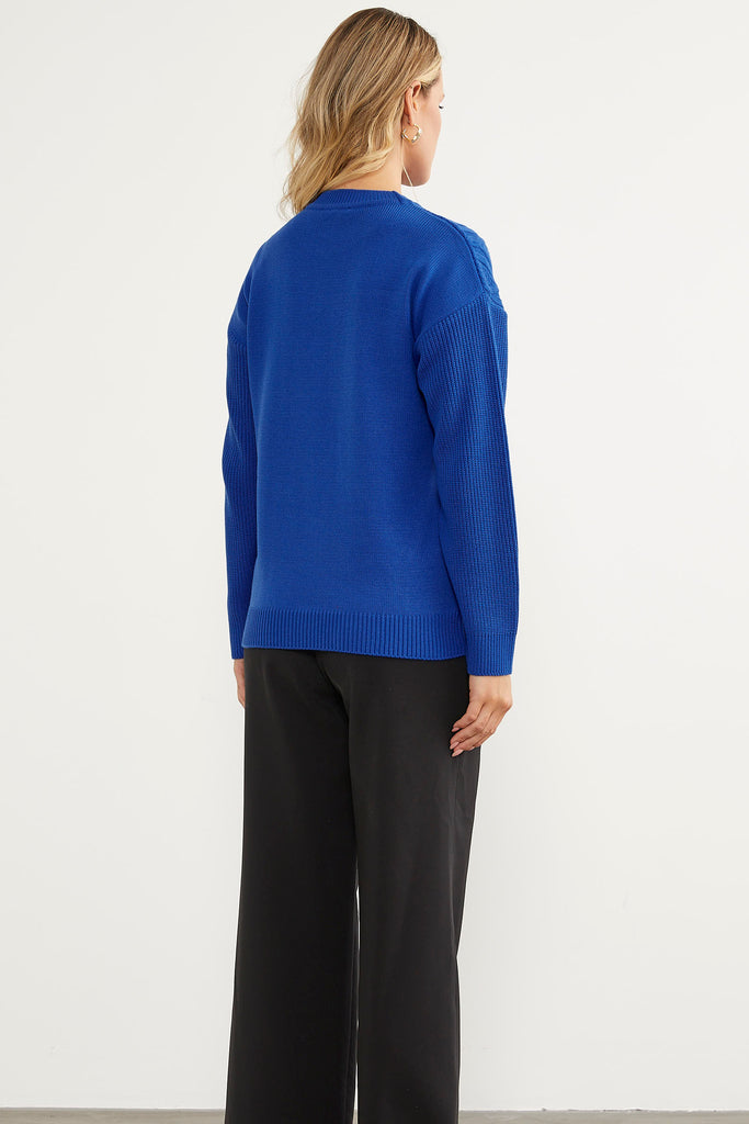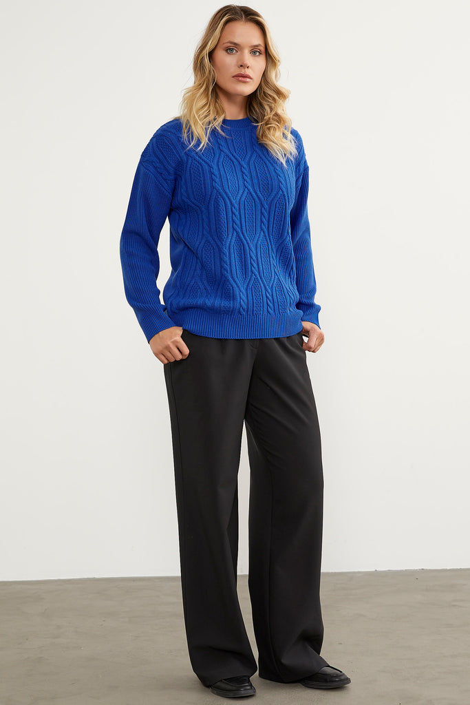 This oversize, knitted sweater with a raised knit pattern on the front, plain on the back, low sleeves, and elastic details on the collar, hem and cuffs will create a harmonious combination with your tights and trousers.
