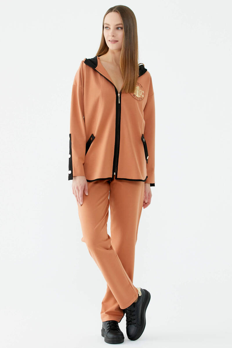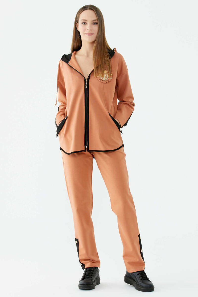 The tracksuit set has a sporty look thanks to its stylish hooded design. With its comfortable fit, cuffs and pockets, the top with button accessories always provides a comfortable wearing experience with its soft texture. Sweatpants, which attract attention with their tube leg, waist elastic and button-leg accessory, are the comfortable complement of sporty looks.