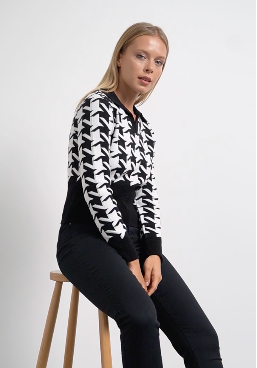 Plaid Polo Neck Crowbar Pattern Knitwear Sweater - Black