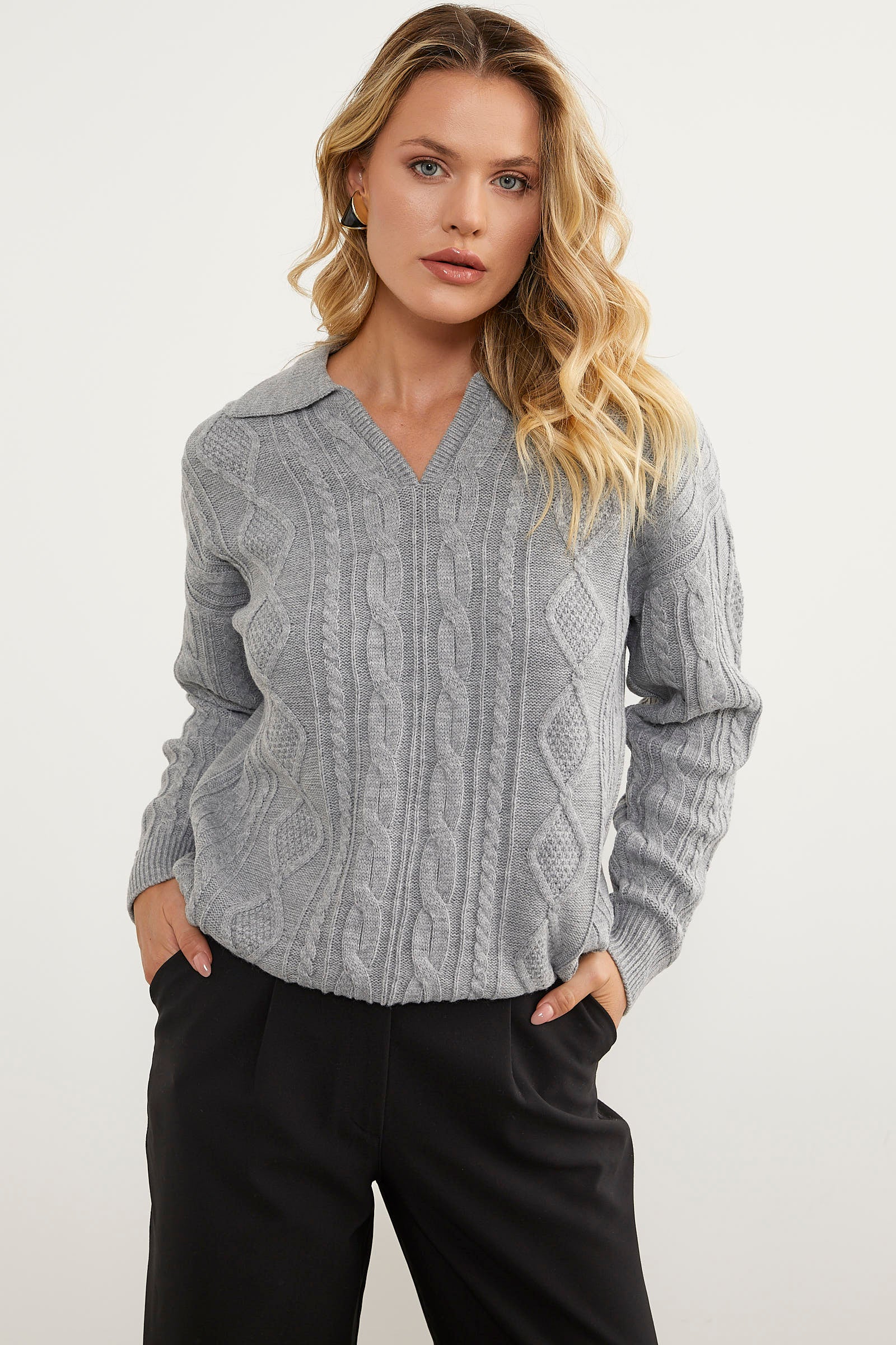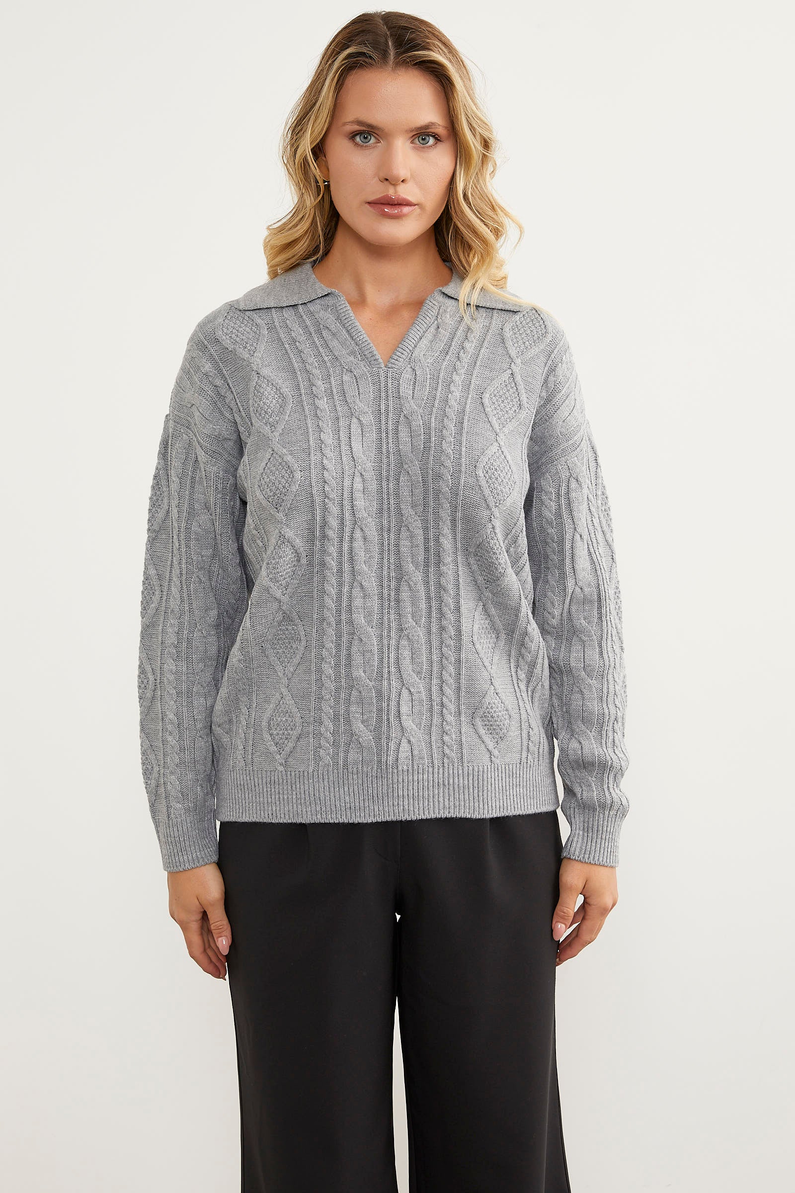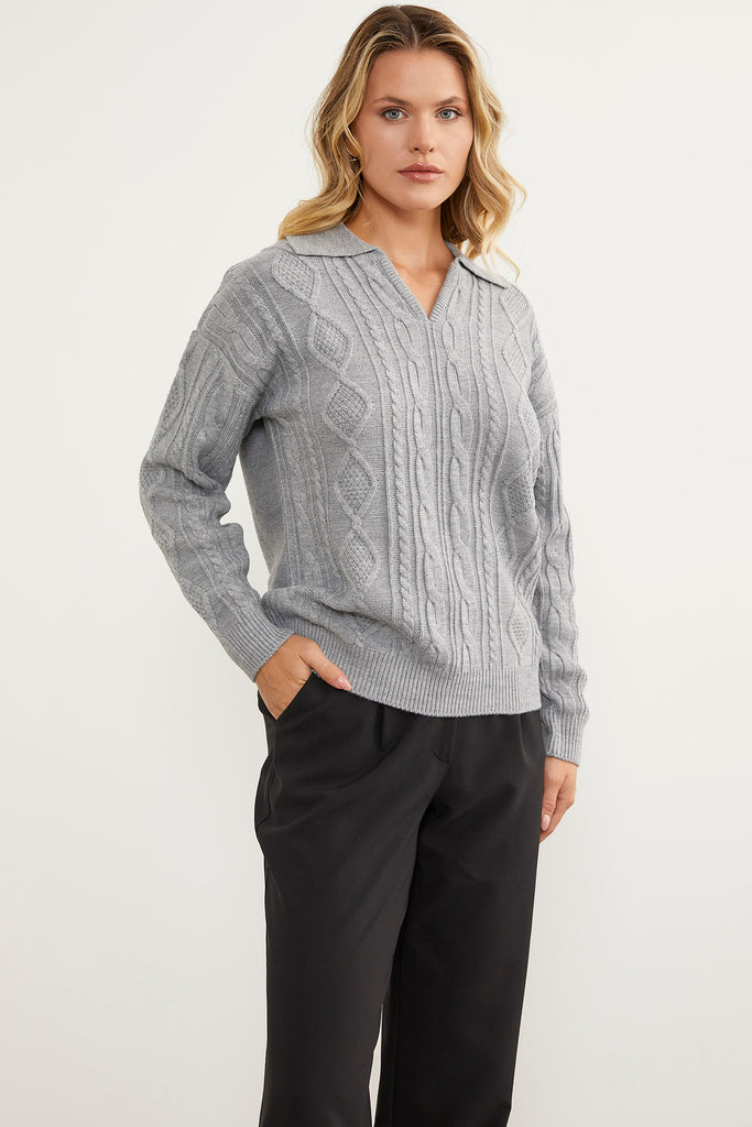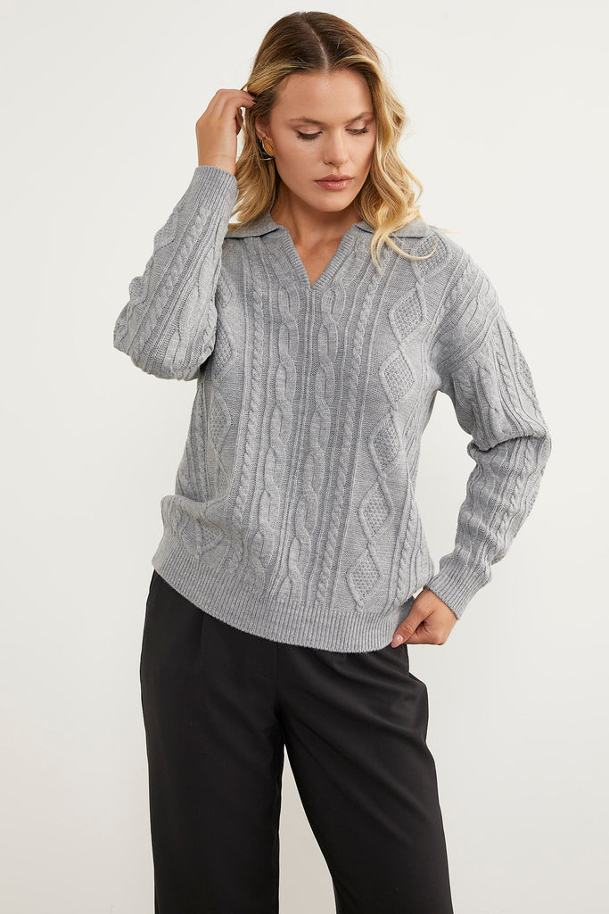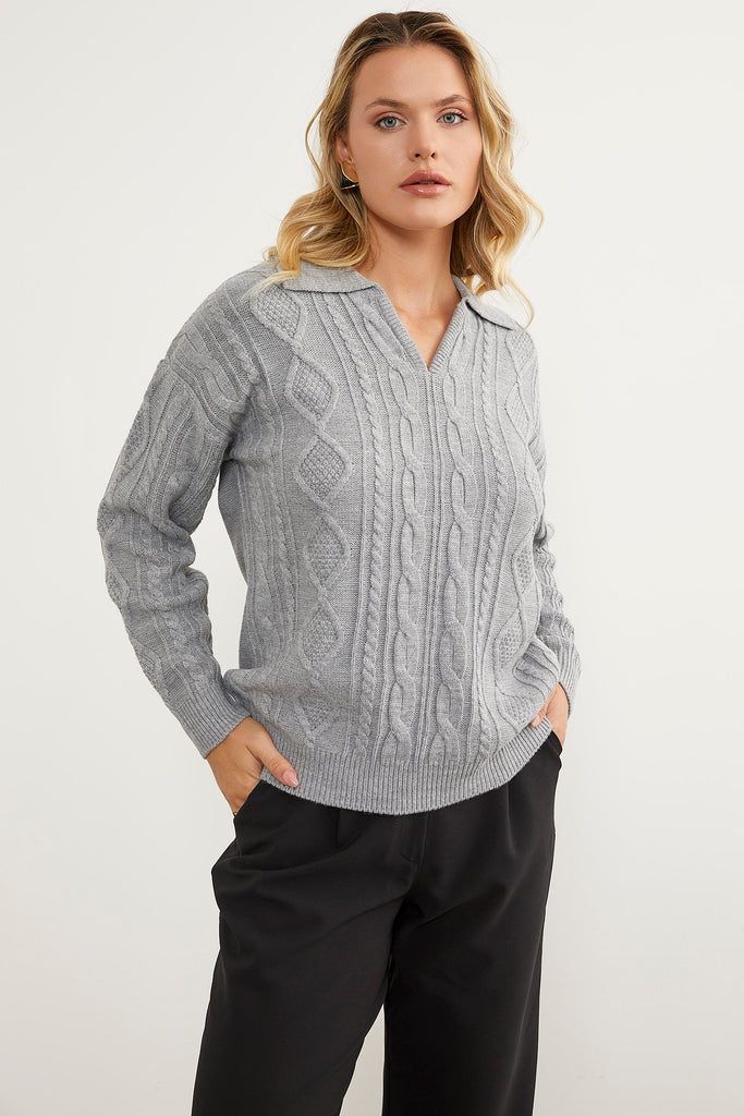 Polo Neck Patterned Knitwear Sweater - Light Gray