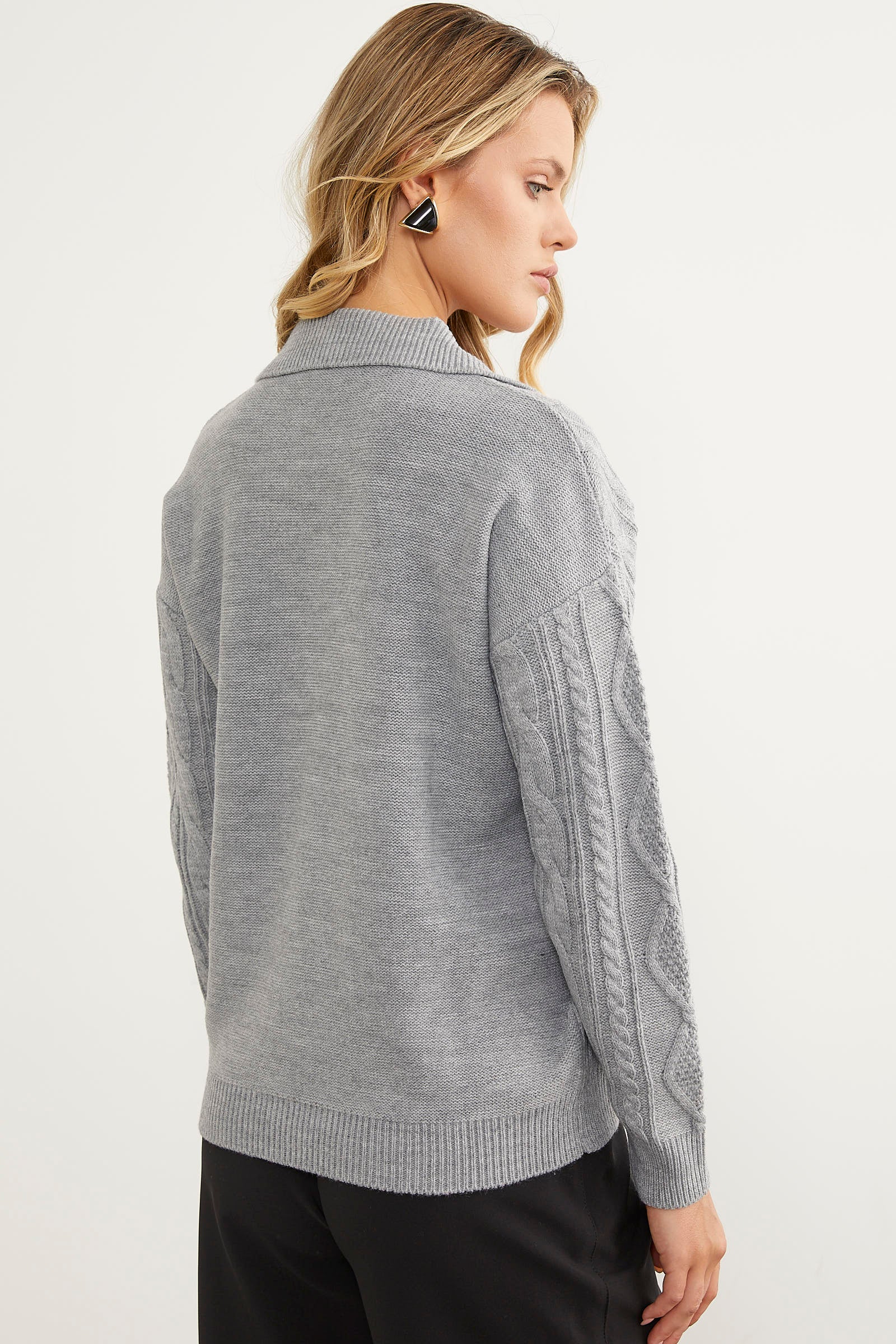 The polo neck knitted sweater with knitted front and sleeves and a plain back invites you to both elegance and comfort. In addition to providing you with comfort on cool days, it has different color options that you can complement with your pieces.