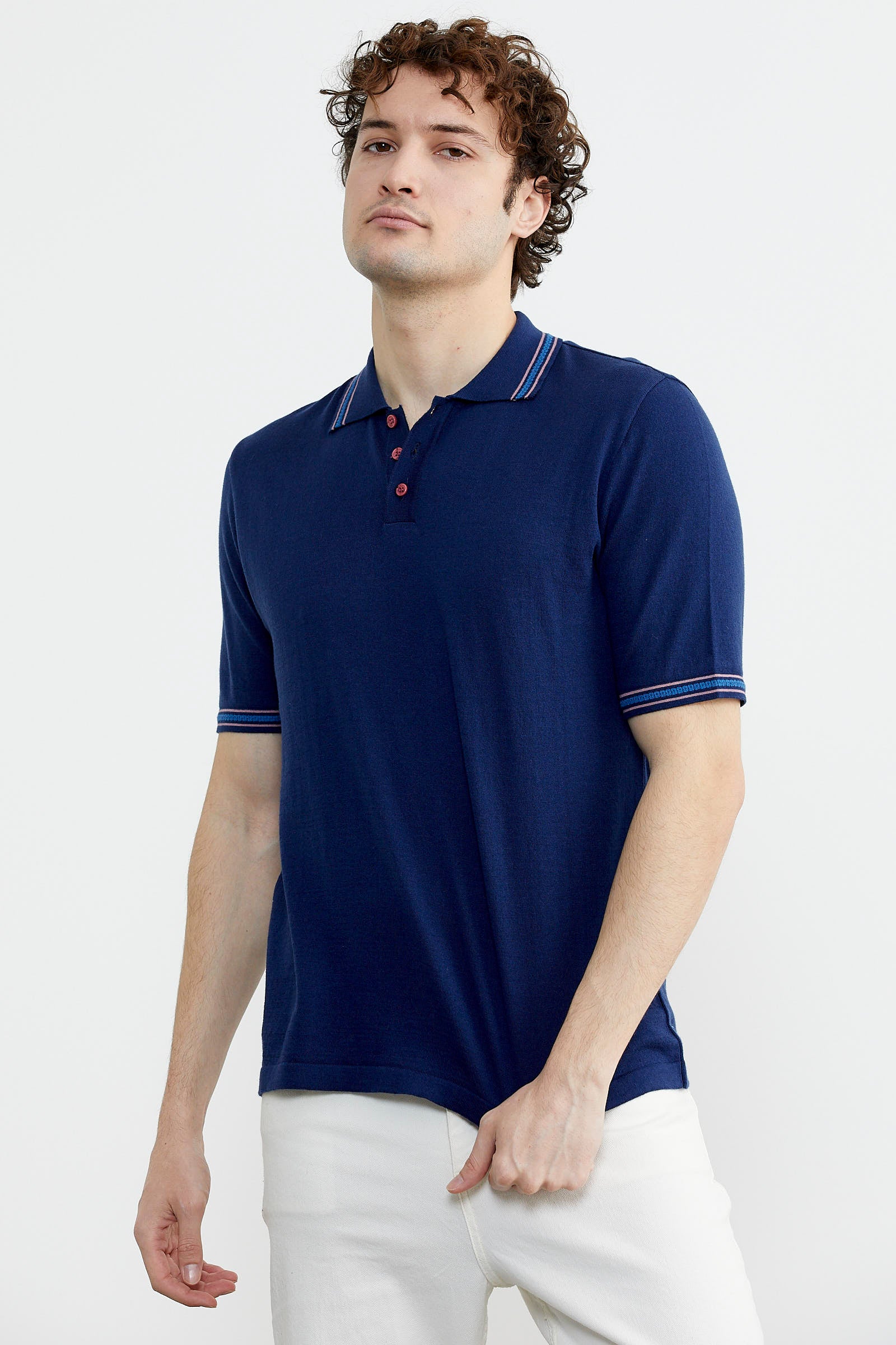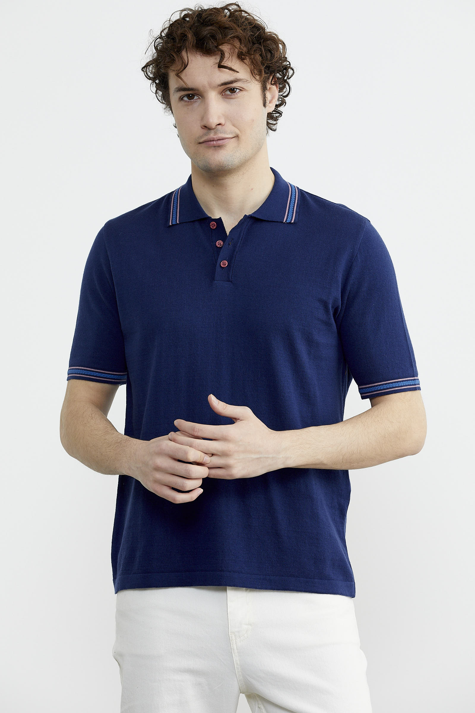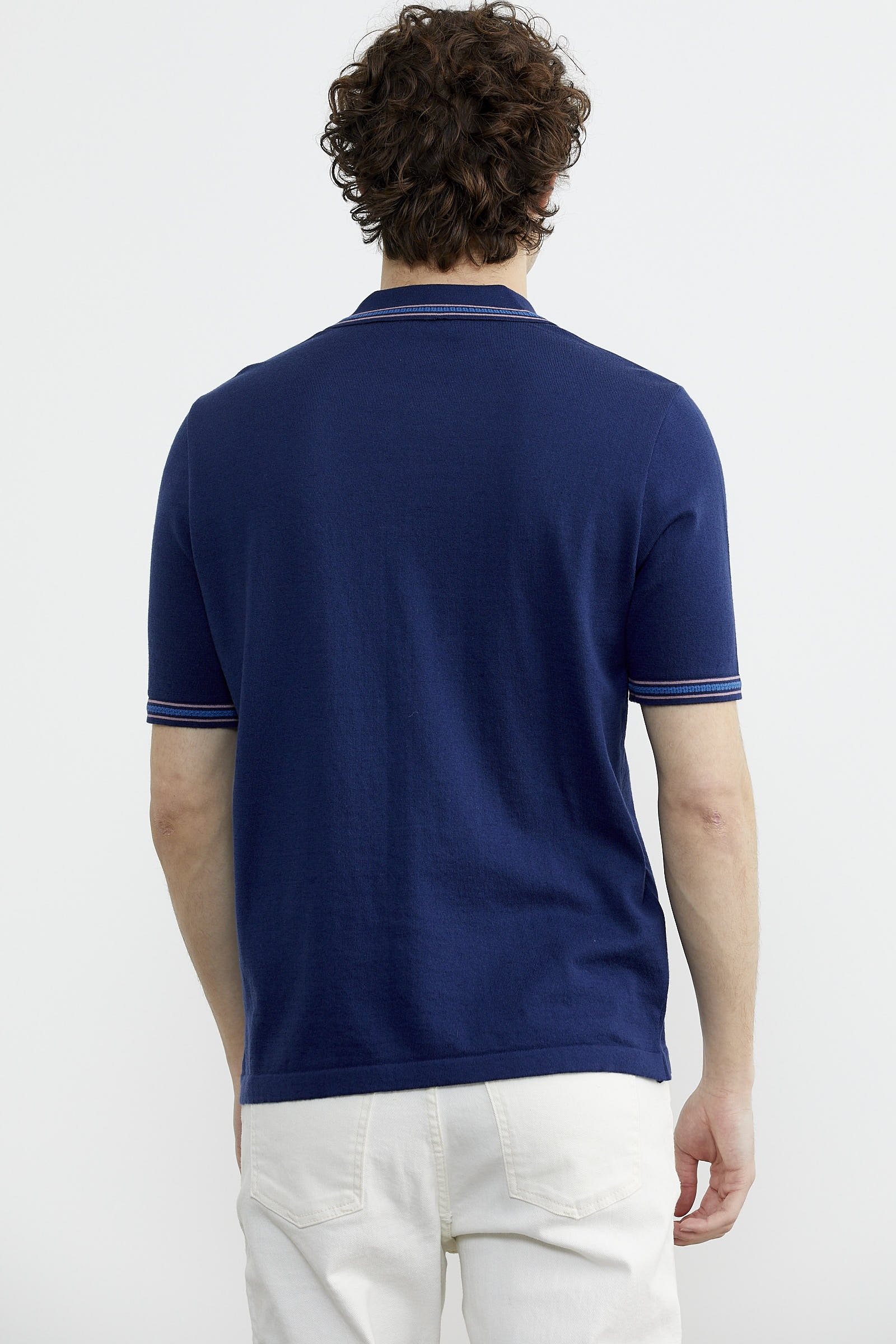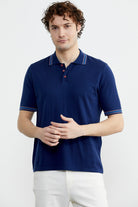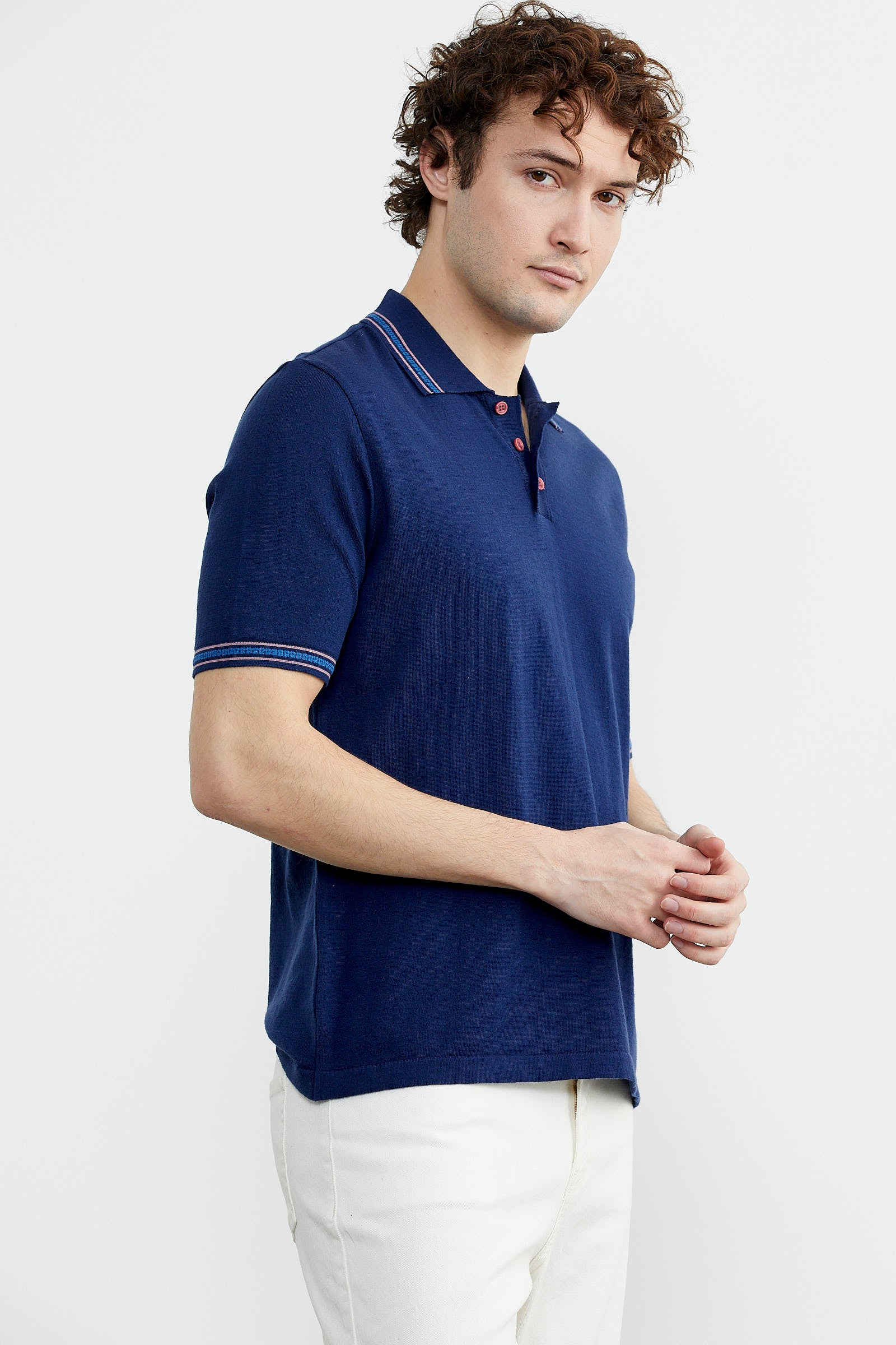 Polo Collar Short Sleeve Cotton Knit T-Shirt - Navy Blue
