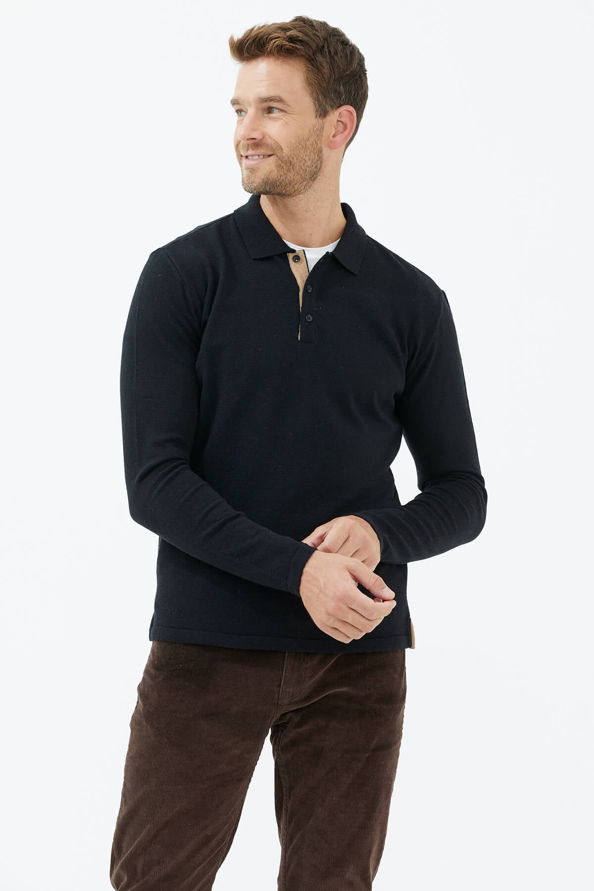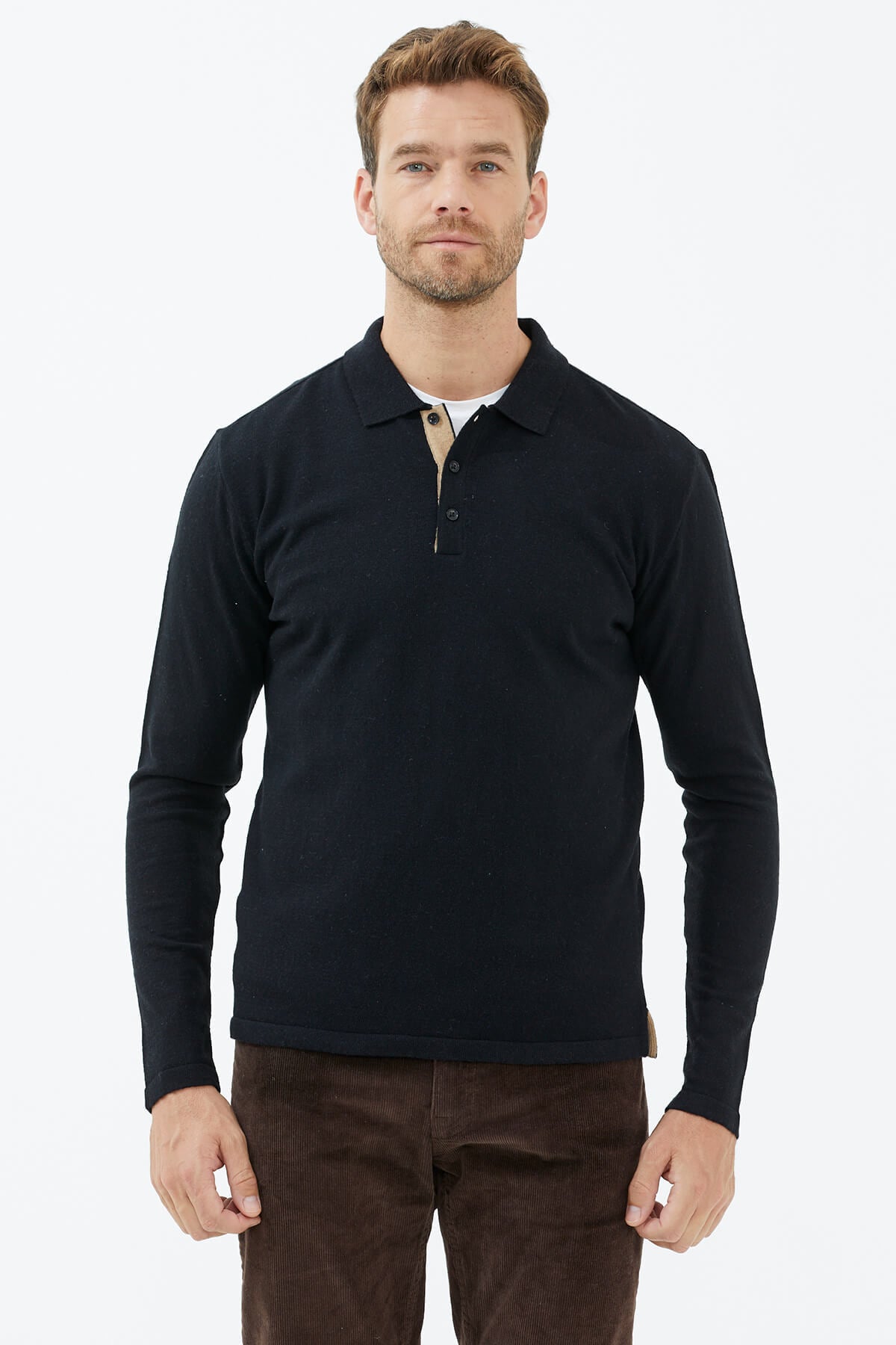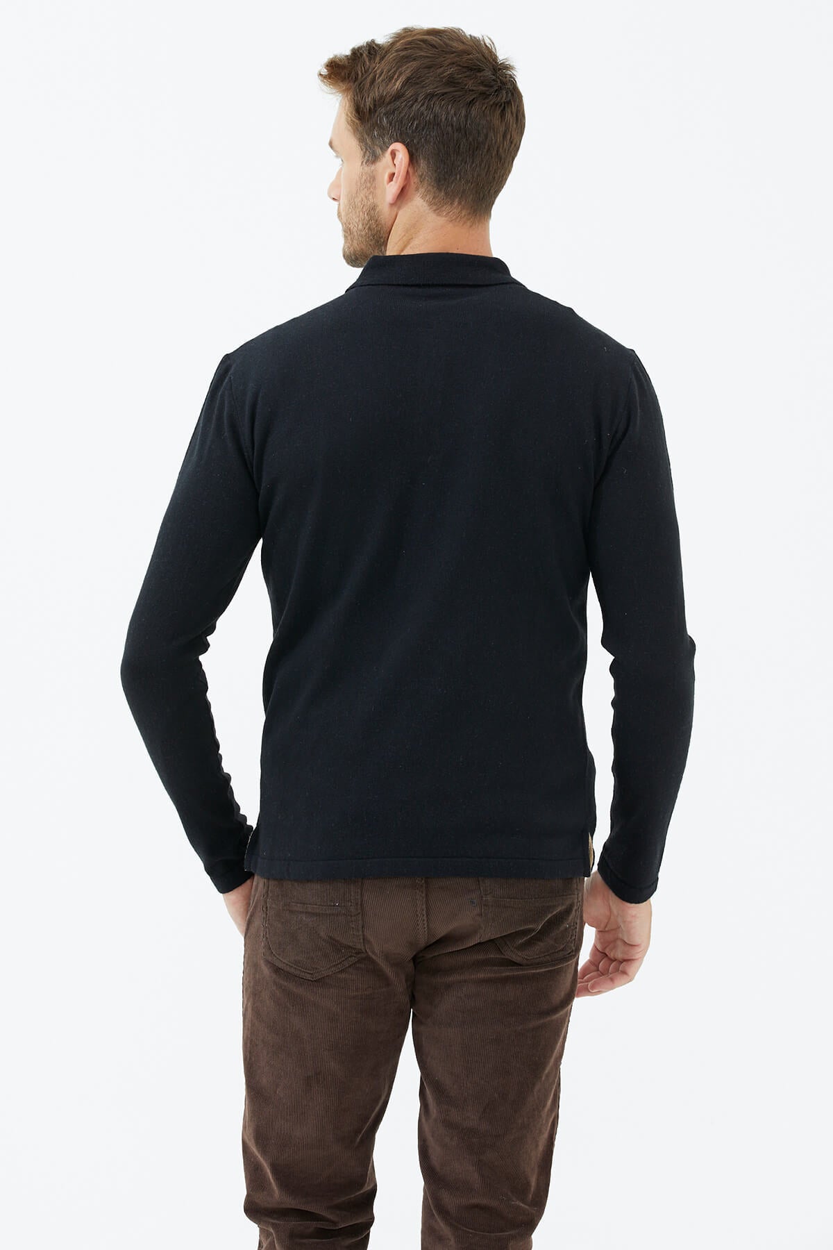 Soft-textured knit sweater made from wool-blend yarn with a long sleeve, polo collar and button placket.