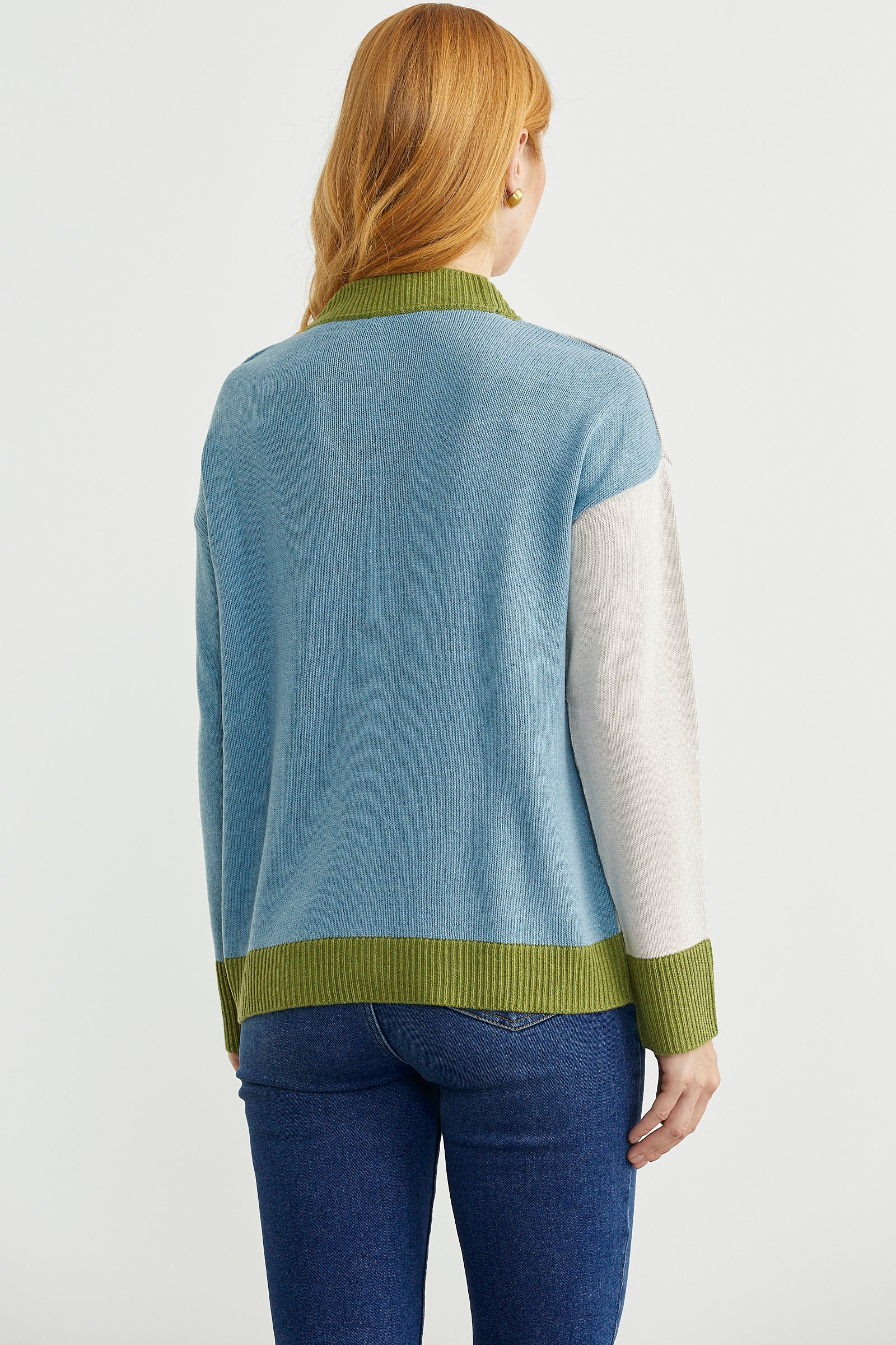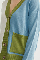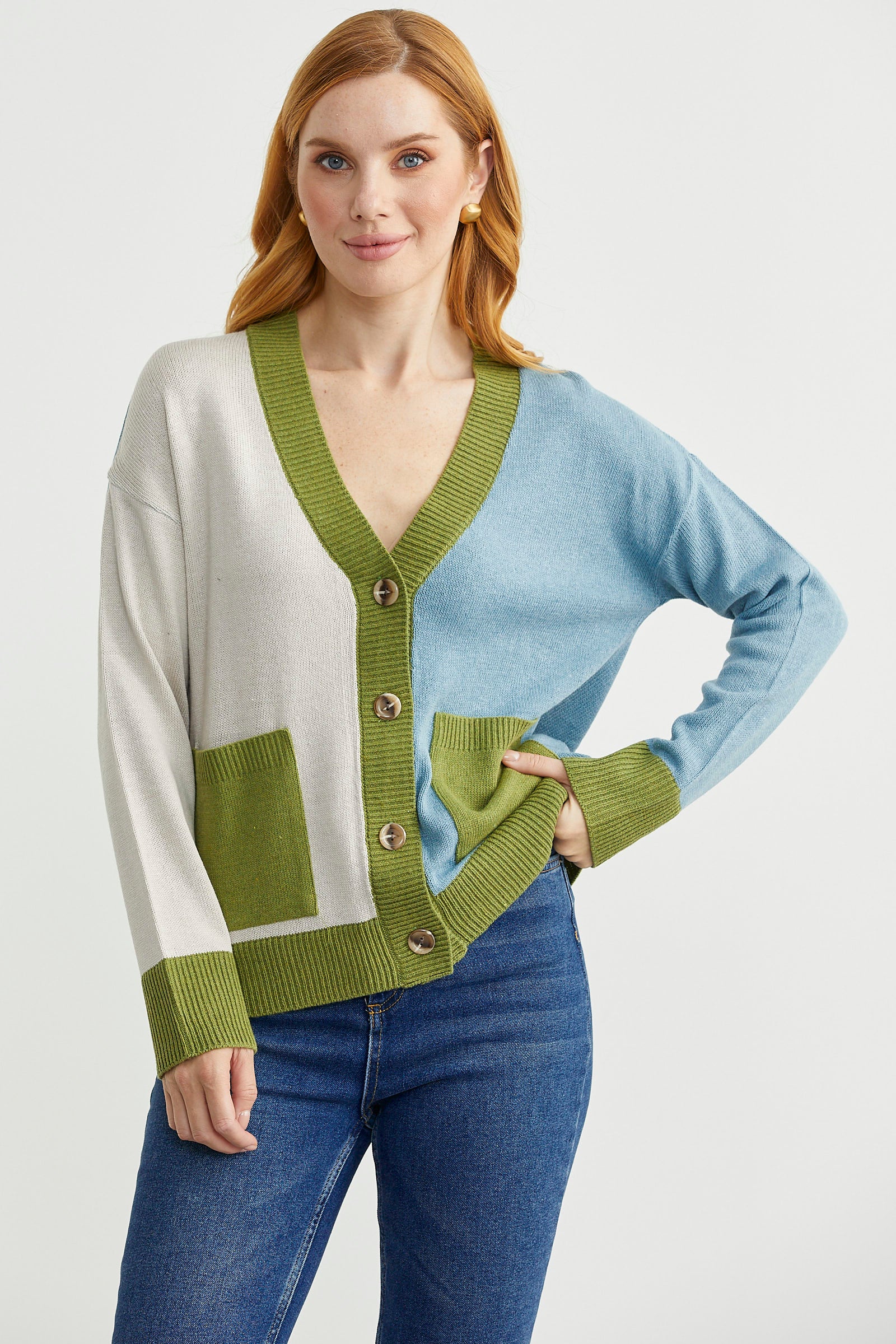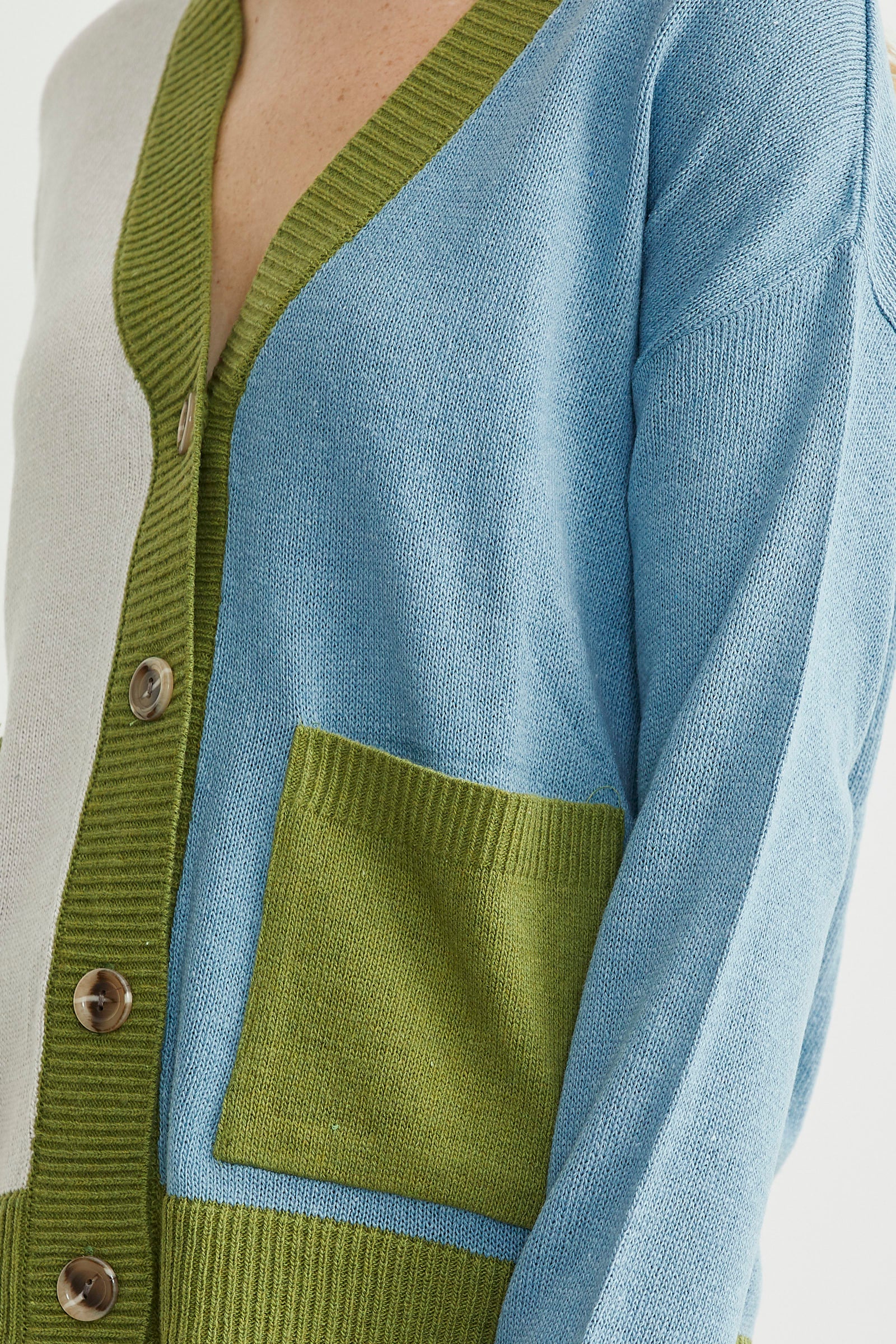 V yakalı, yün oranı yüksek, yumuşak triko hırka. Düşük omuzlu, bol kesimli, cepli. Renk kombinlidir.