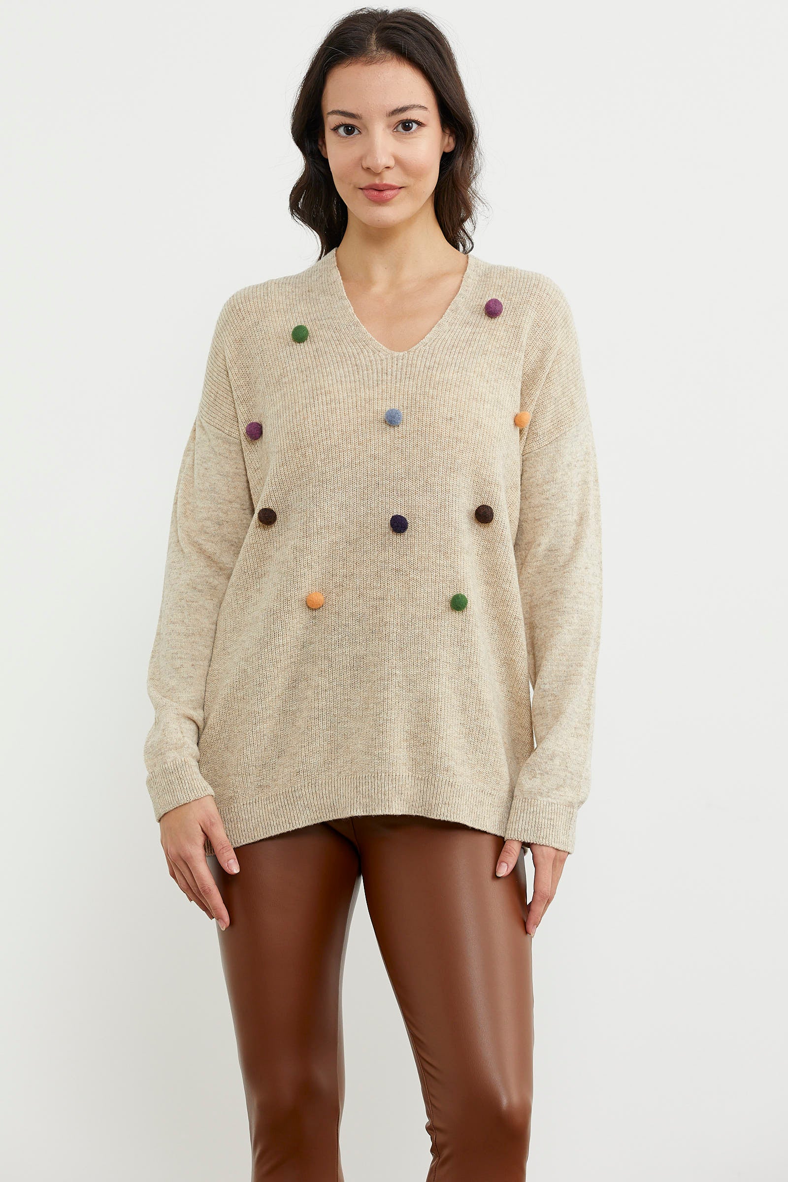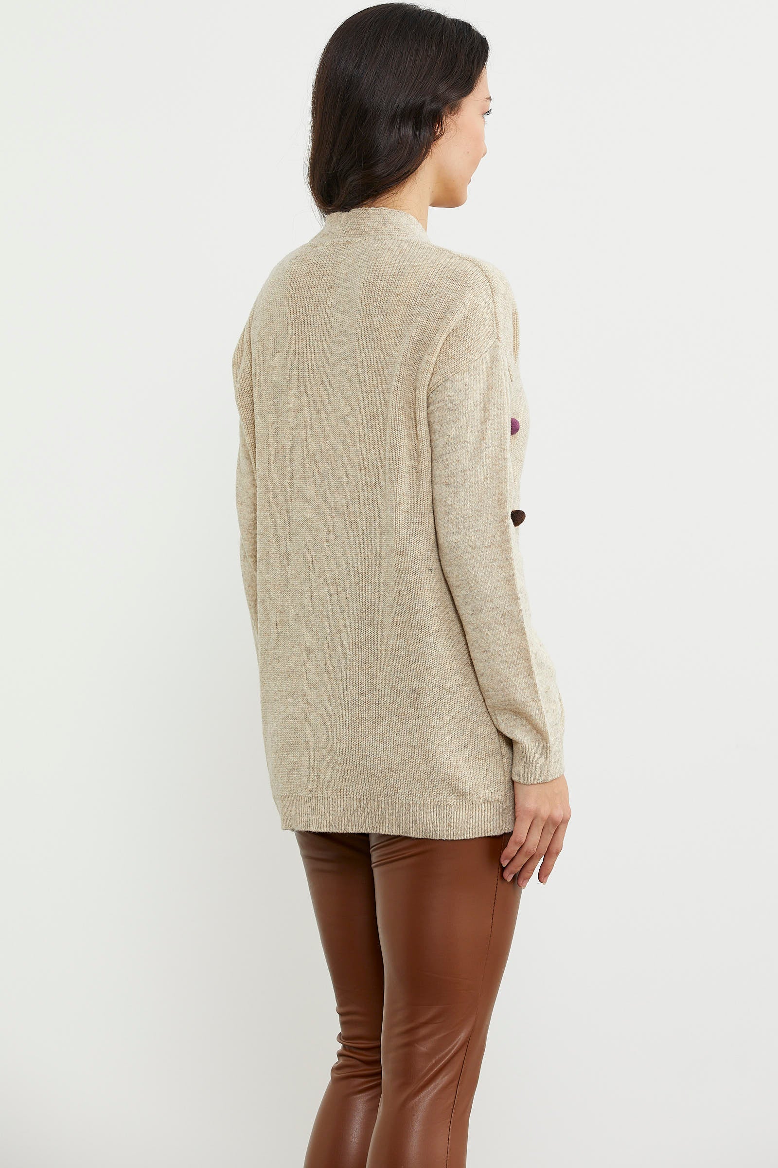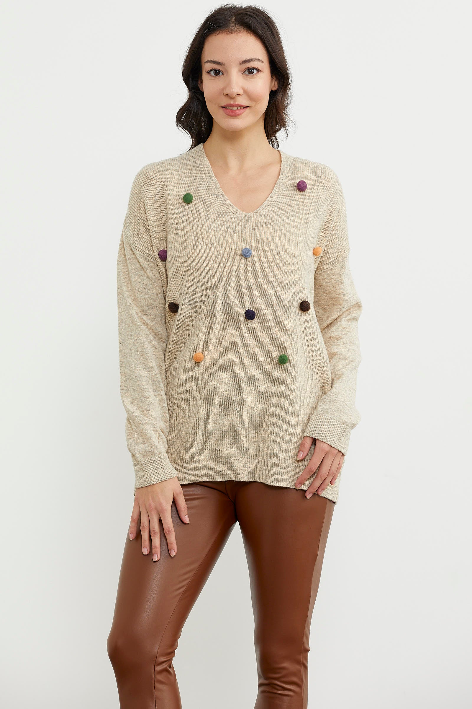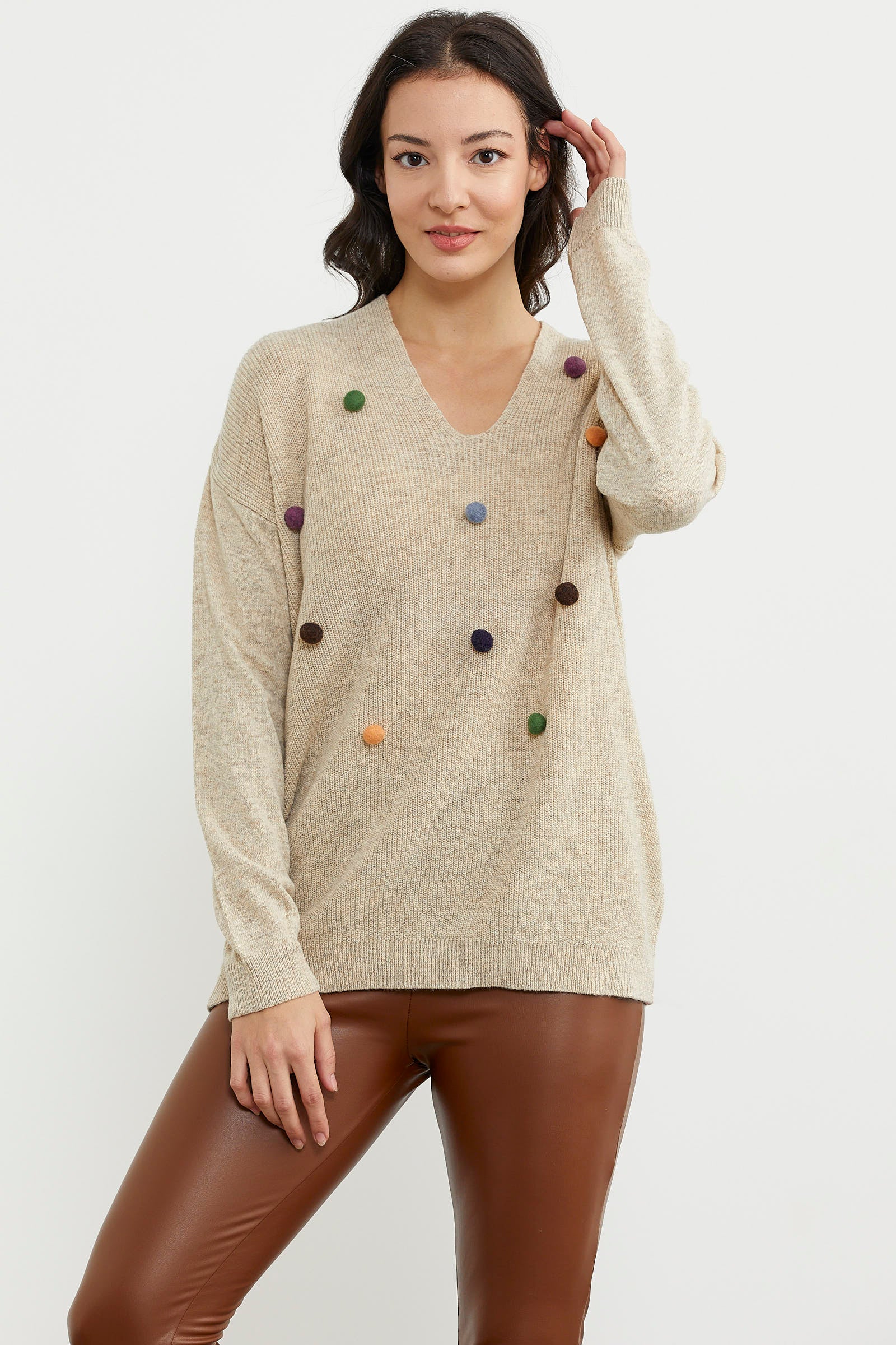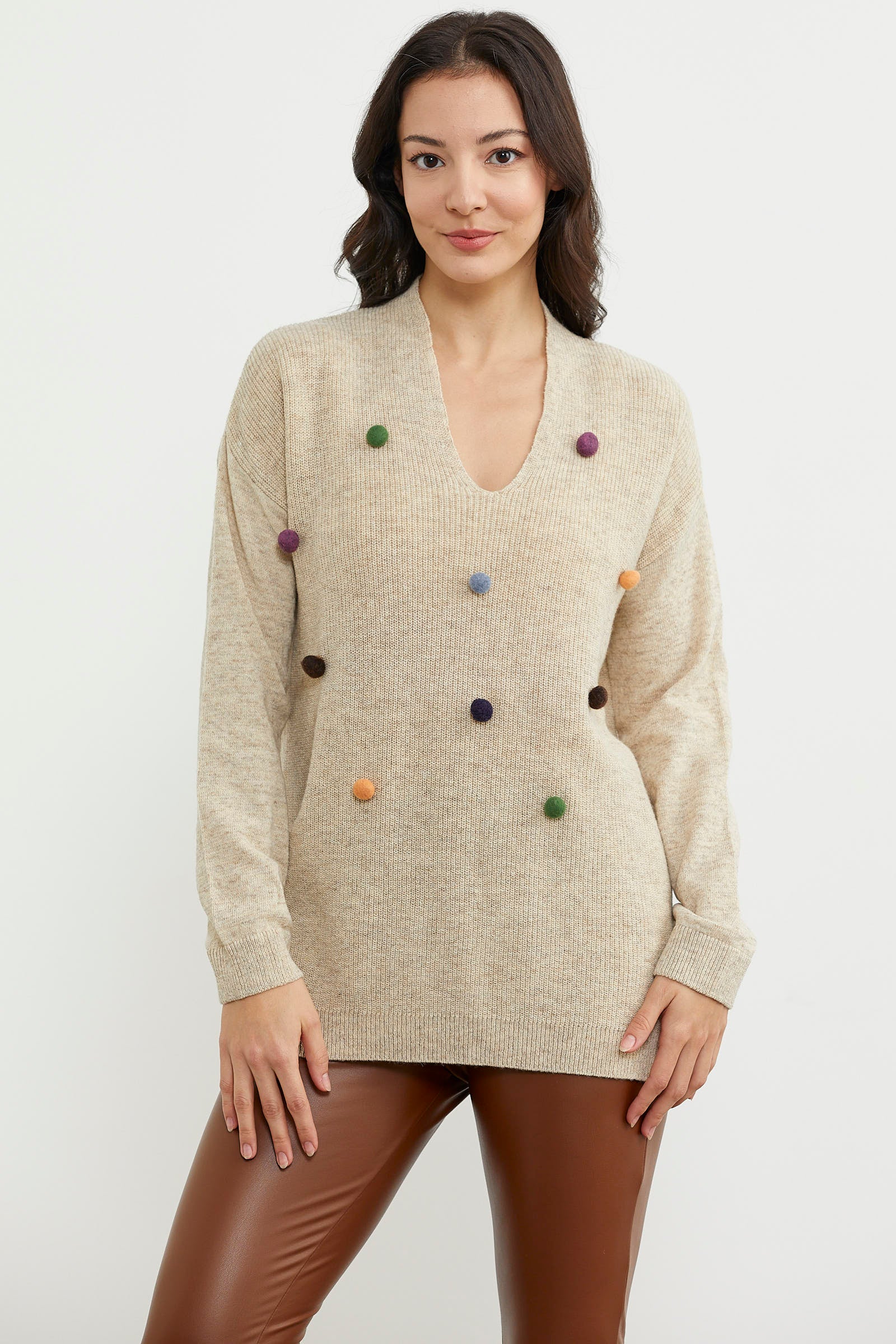 This knitted sweater with colorful pom-pom details, a V-neck, and a rib-knit hem will make you feel warm while creating a fun and minimal look for your winter days. Don't forget to examine the different colors.