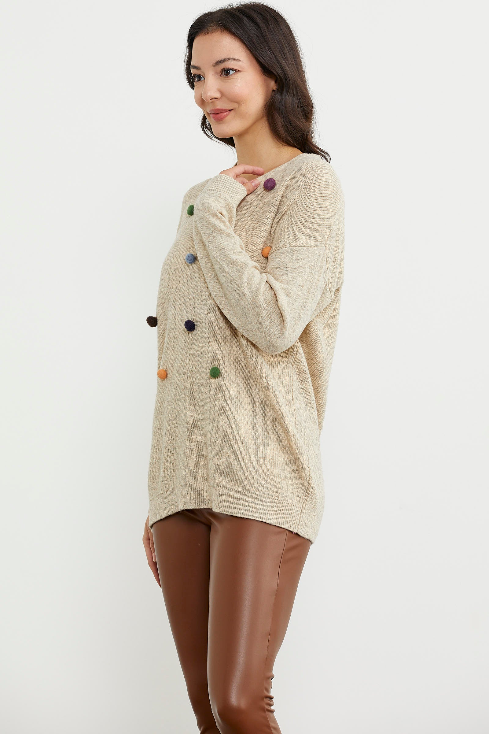 Colorful Pompom Detailed Knitwear Sweater - Light Beige