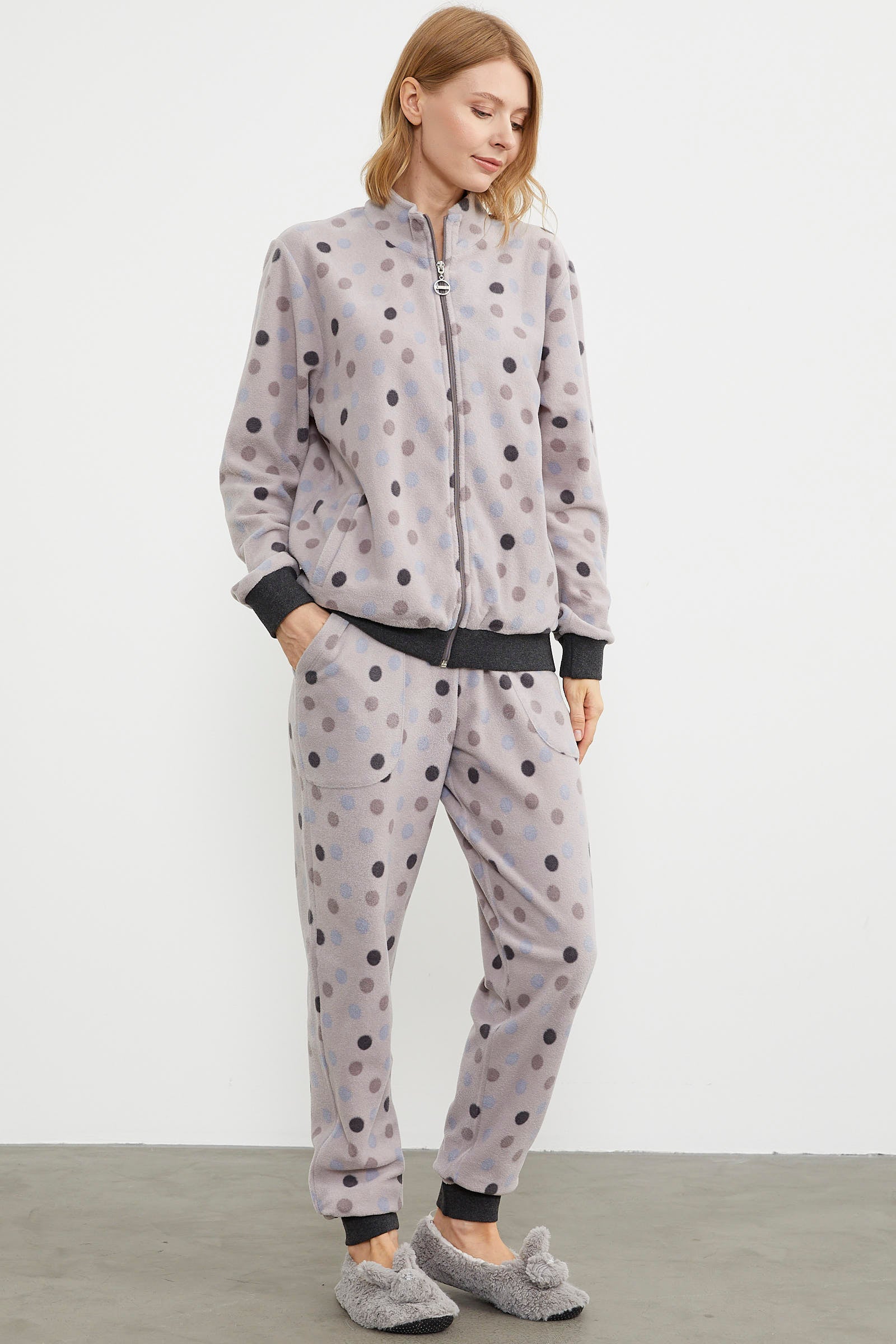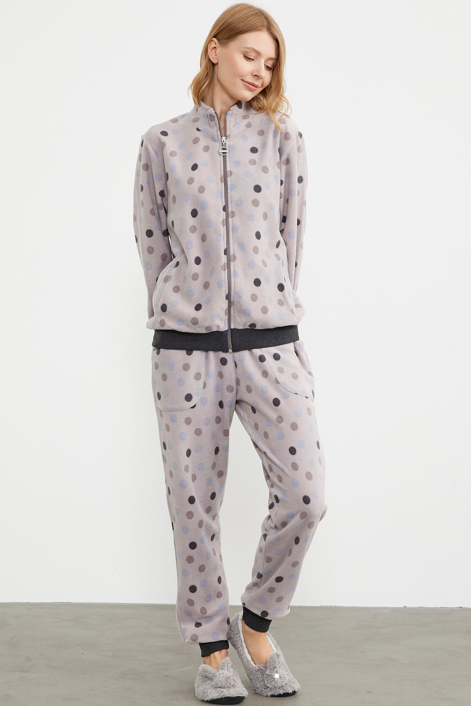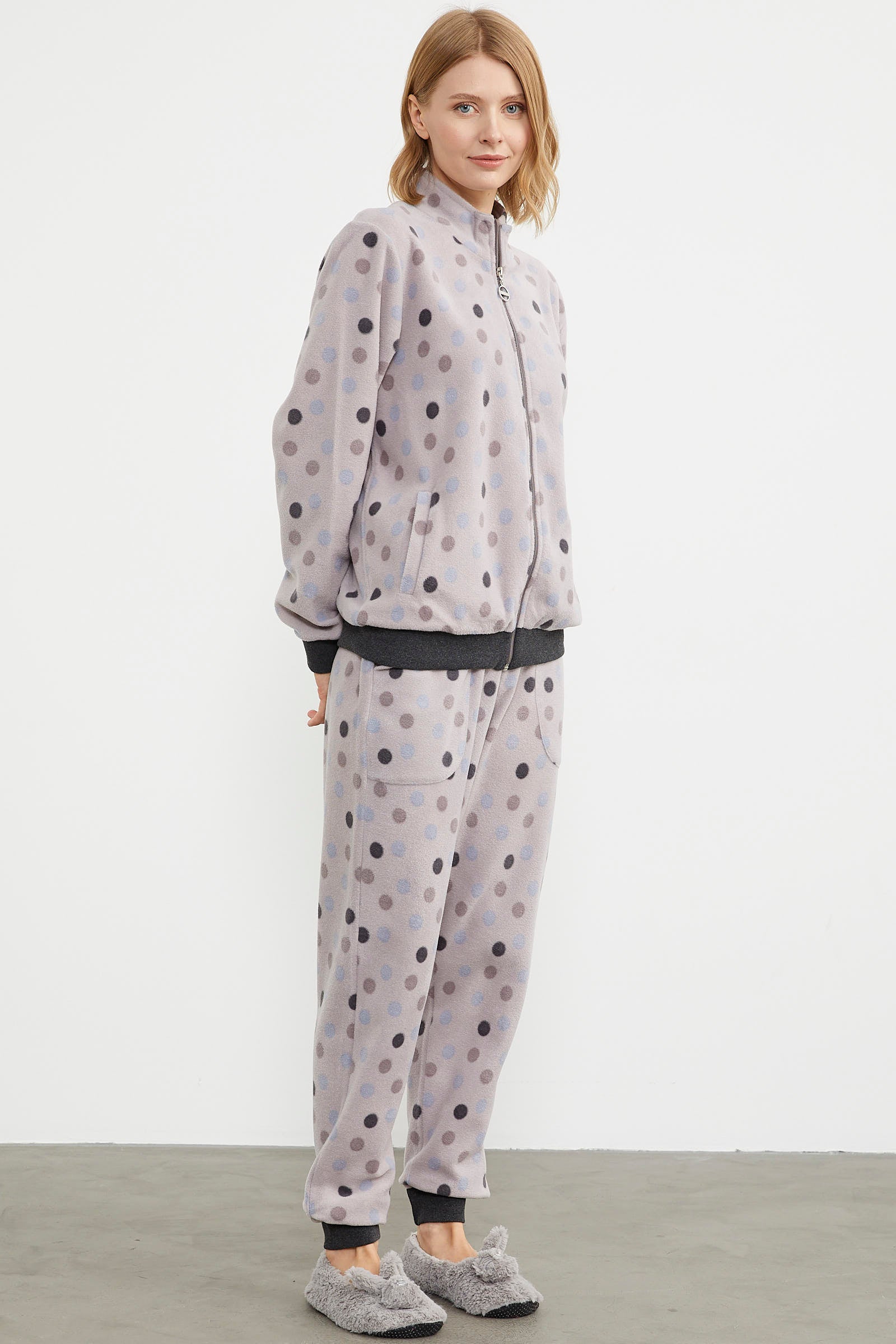 The polar tracksuit set, consisting of a polka dot patterned stand-up collar, front zippered cuffs, elasticated hem and top, and elastic waistband bottoms with two side pockets, will make you feel warm and comfortable on cold days.