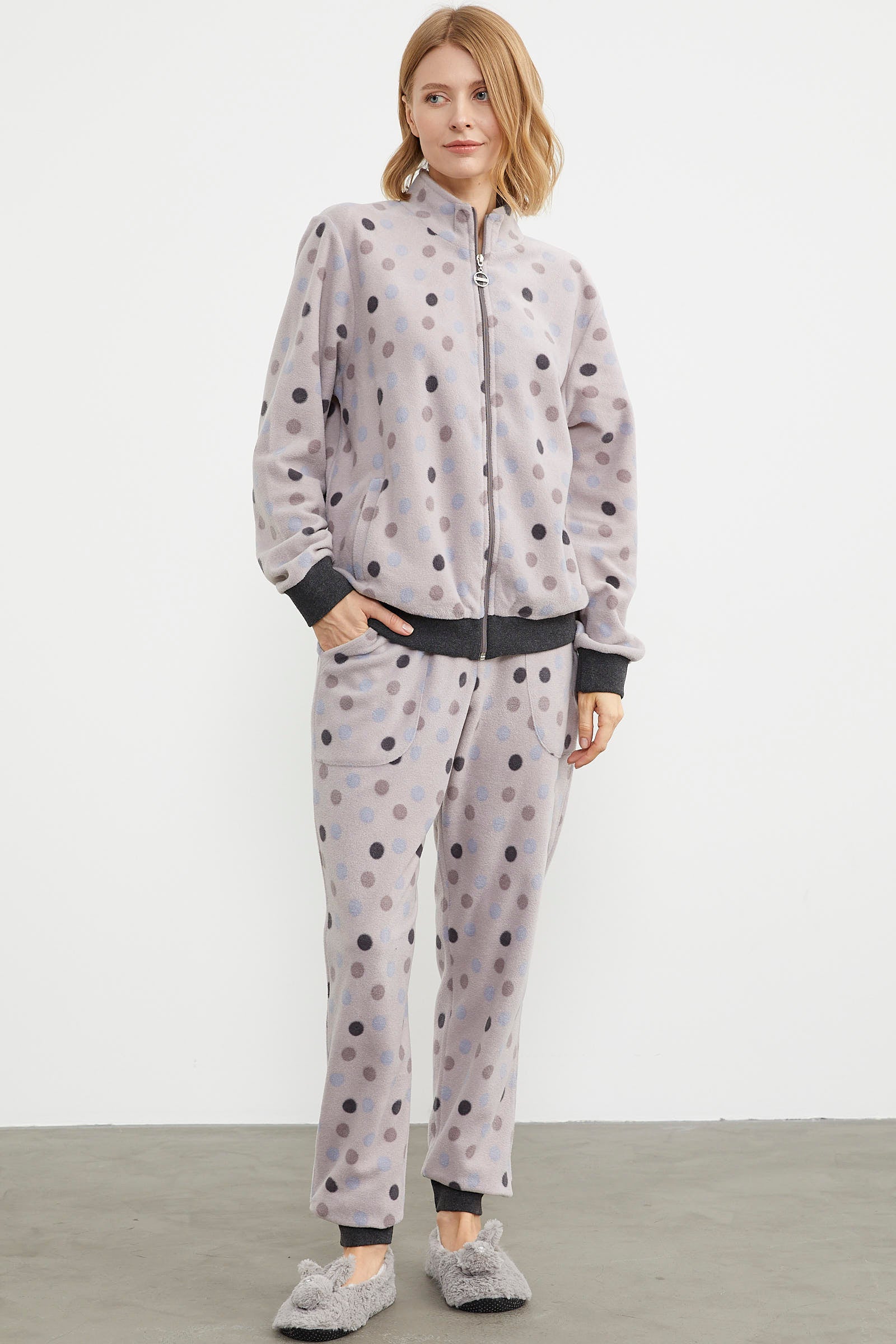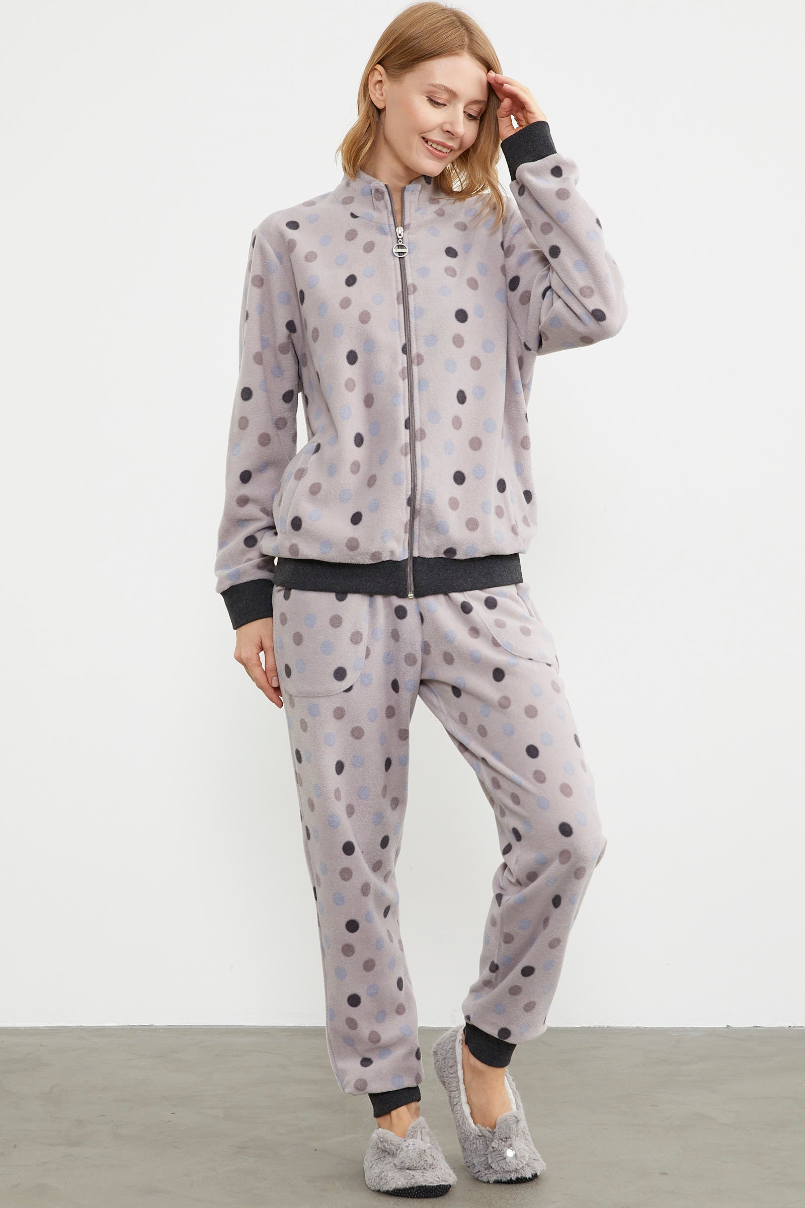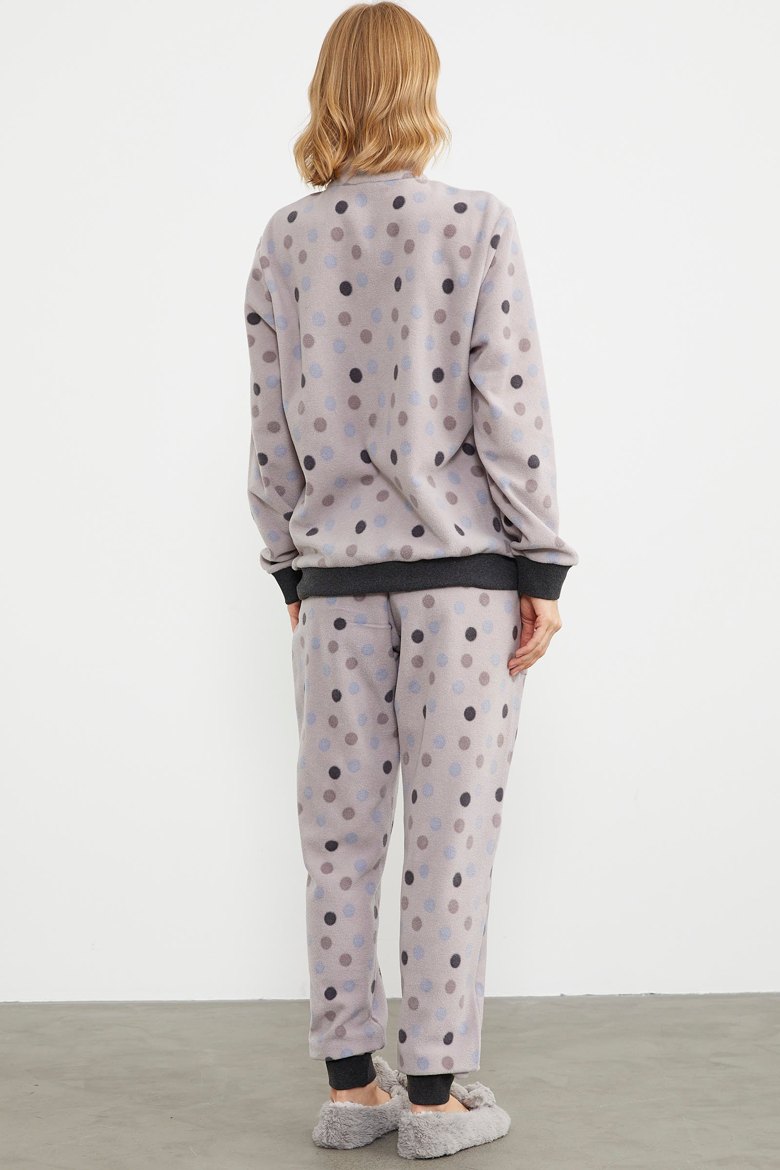 The polar tracksuit set, consisting of a polka dot patterned stand-up collar, front zippered cuffs, elasticated hem and top, and elastic waistband bottoms with two side pockets, will make you feel warm and comfortable on cold days.