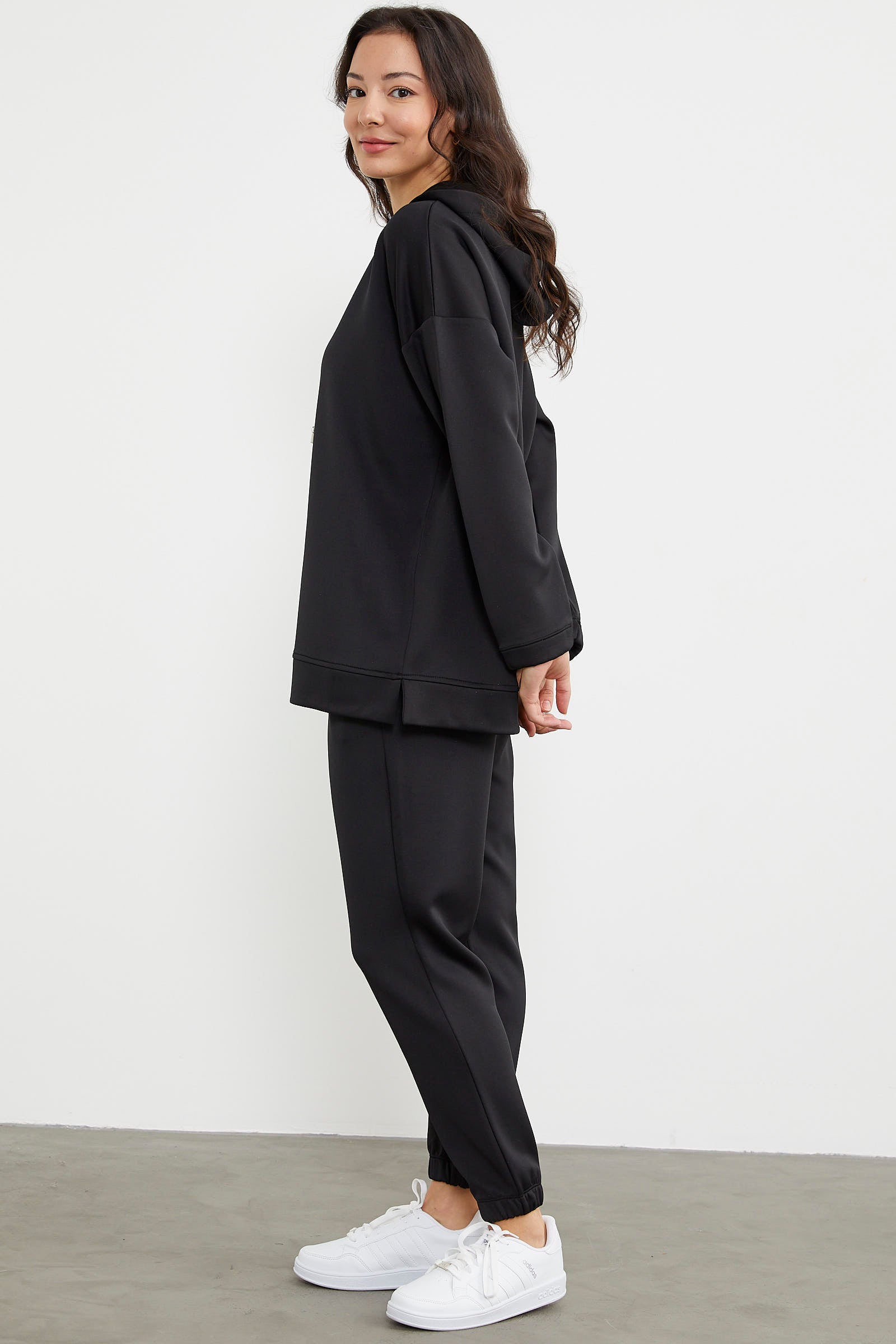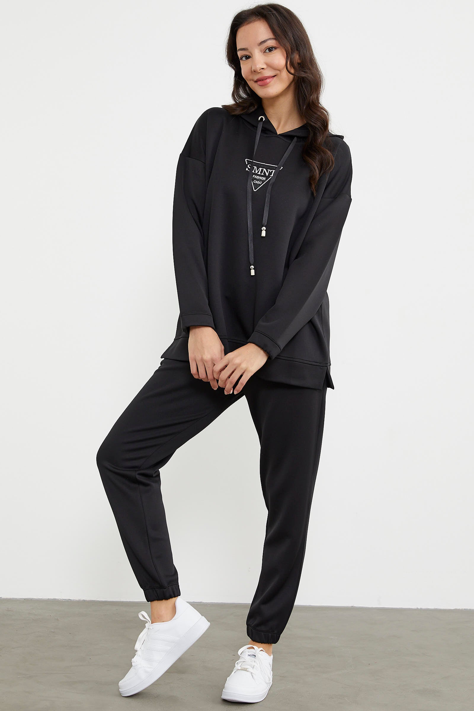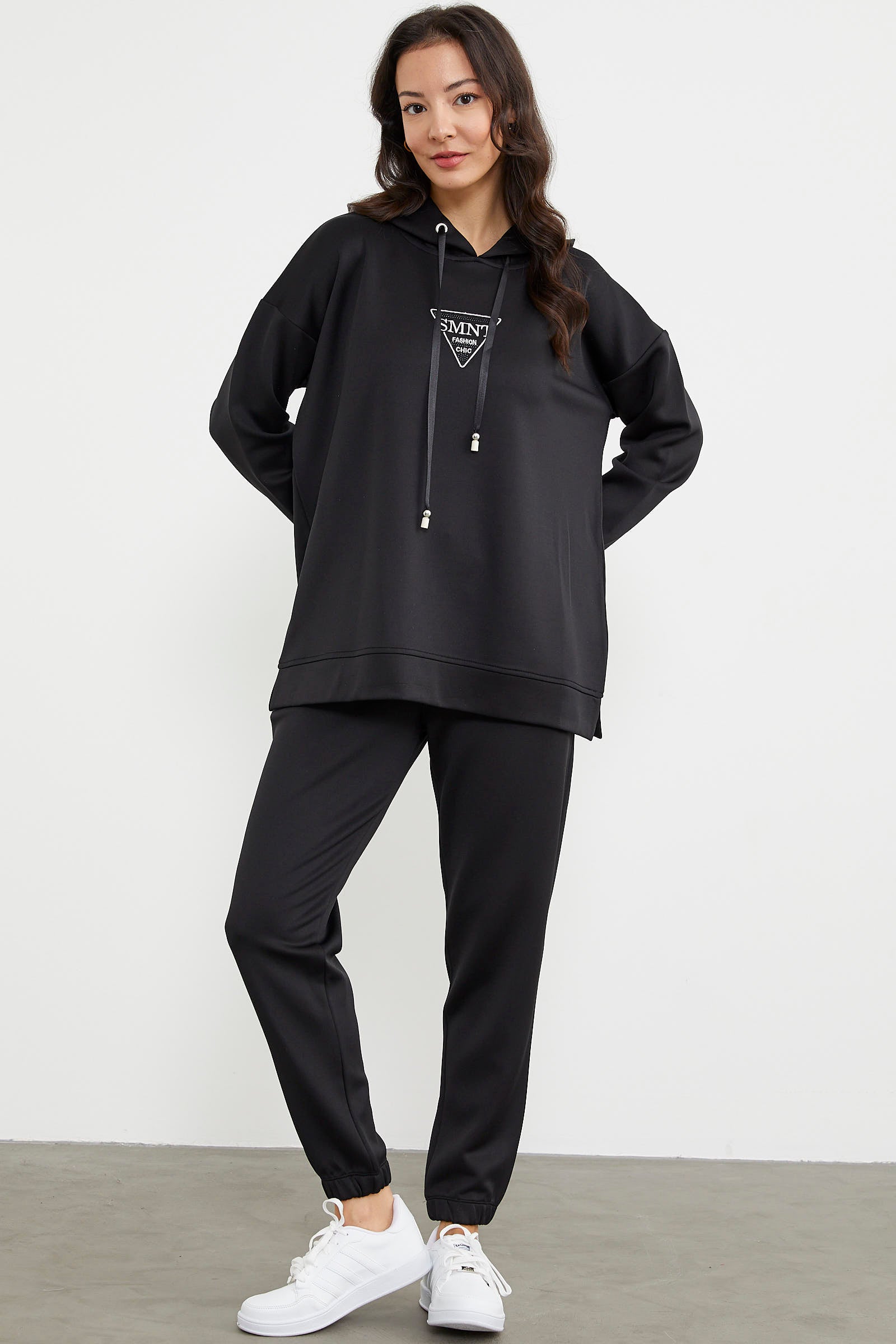 The double tracksuit set, consisting of a top with minimal text detail and a slim-leg bottom with an adjustable hooded collar, will help you create easy looks with its flexible texture and comfortable fit.
