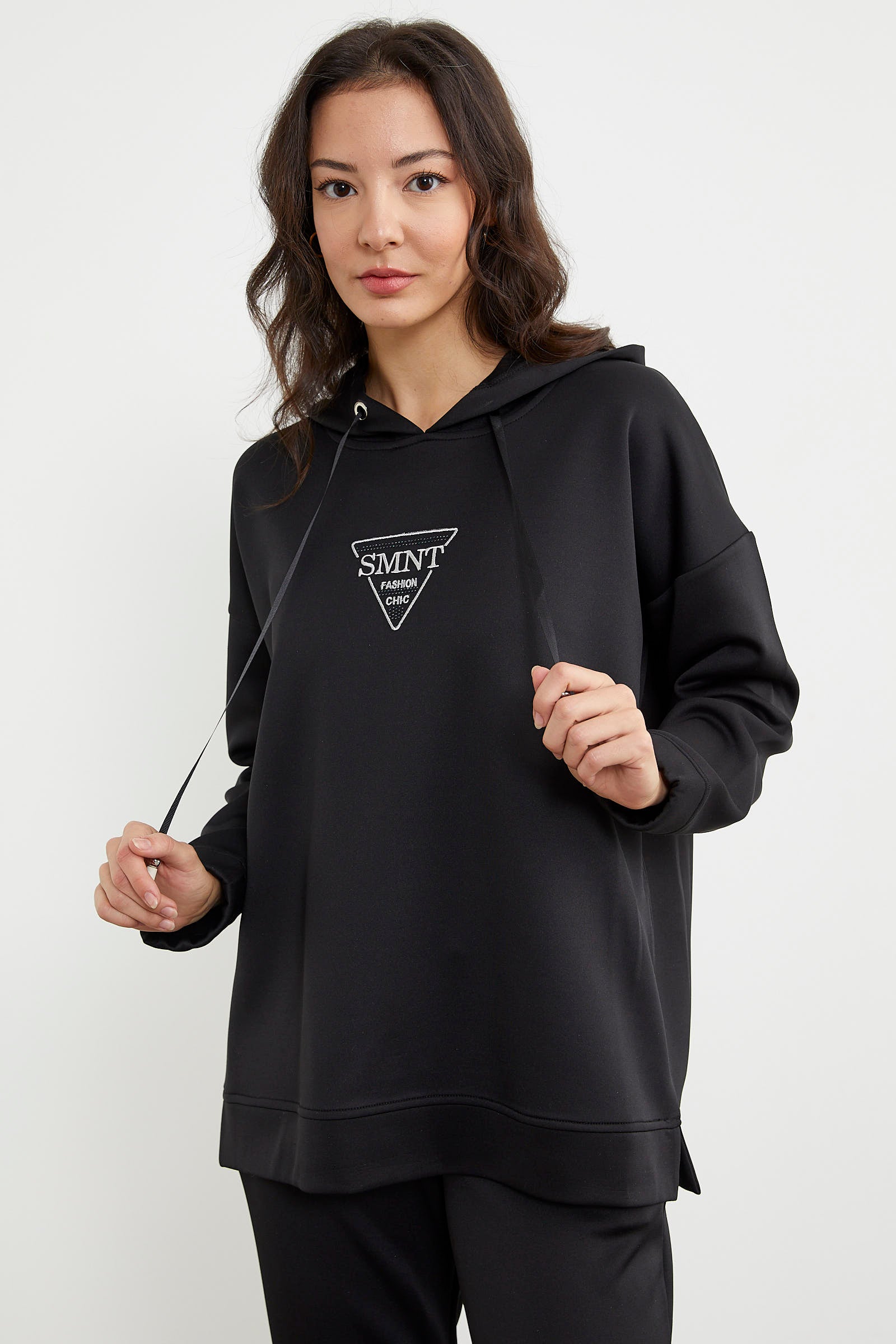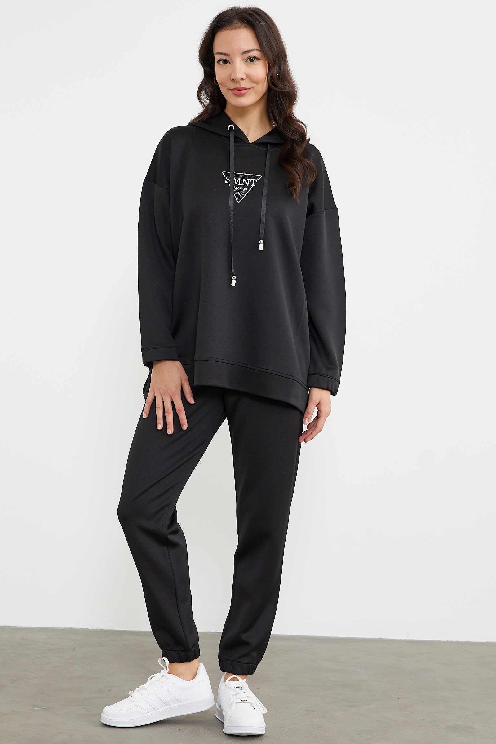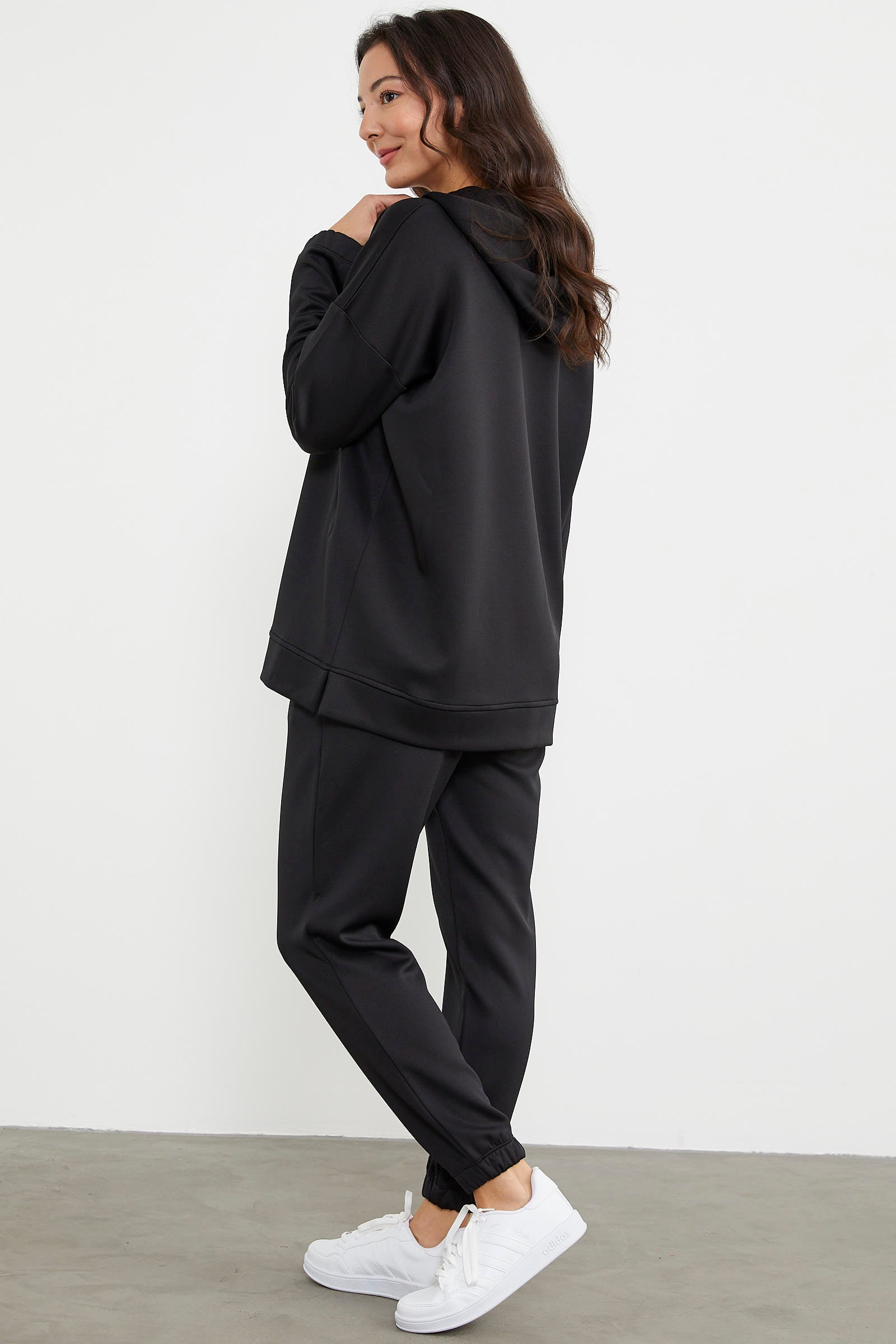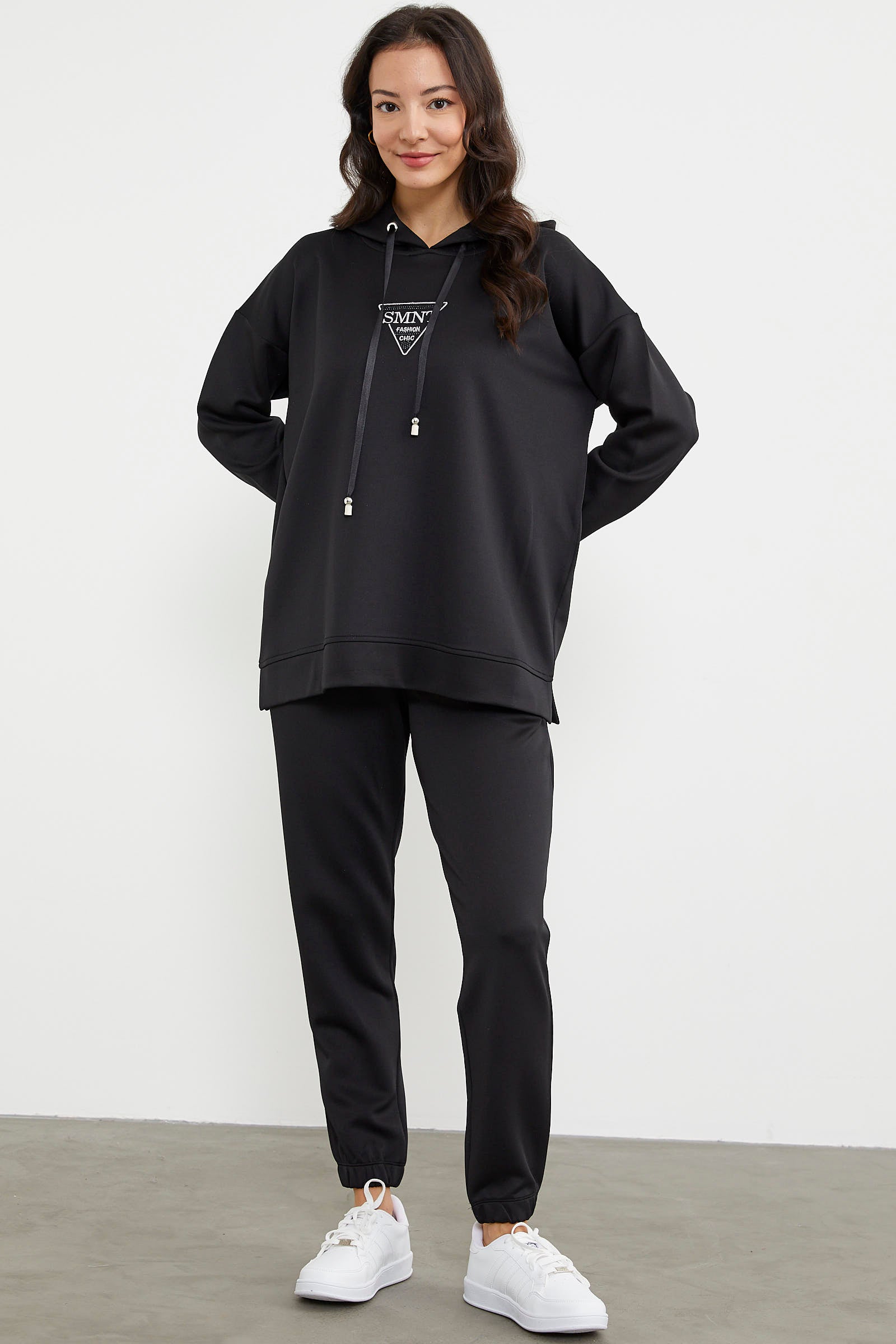 The double tracksuit set, consisting of a top with minimal text detail and a slim-leg bottom with an adjustable hooded collar, will help you create easy looks with its flexible texture and comfortable fit.