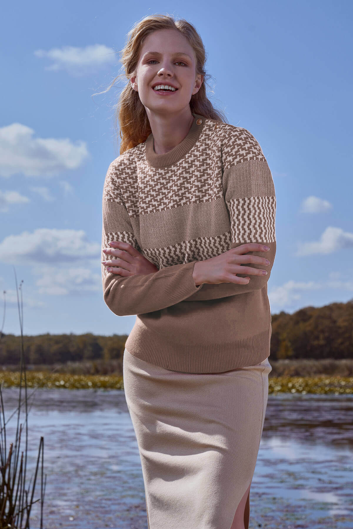 Strengthen your winter style with a patterned sweater that will warm you up in cold weather with its soft texture, zero collar, button closure on the shoulder, ribbed collar, cuffs and hem.