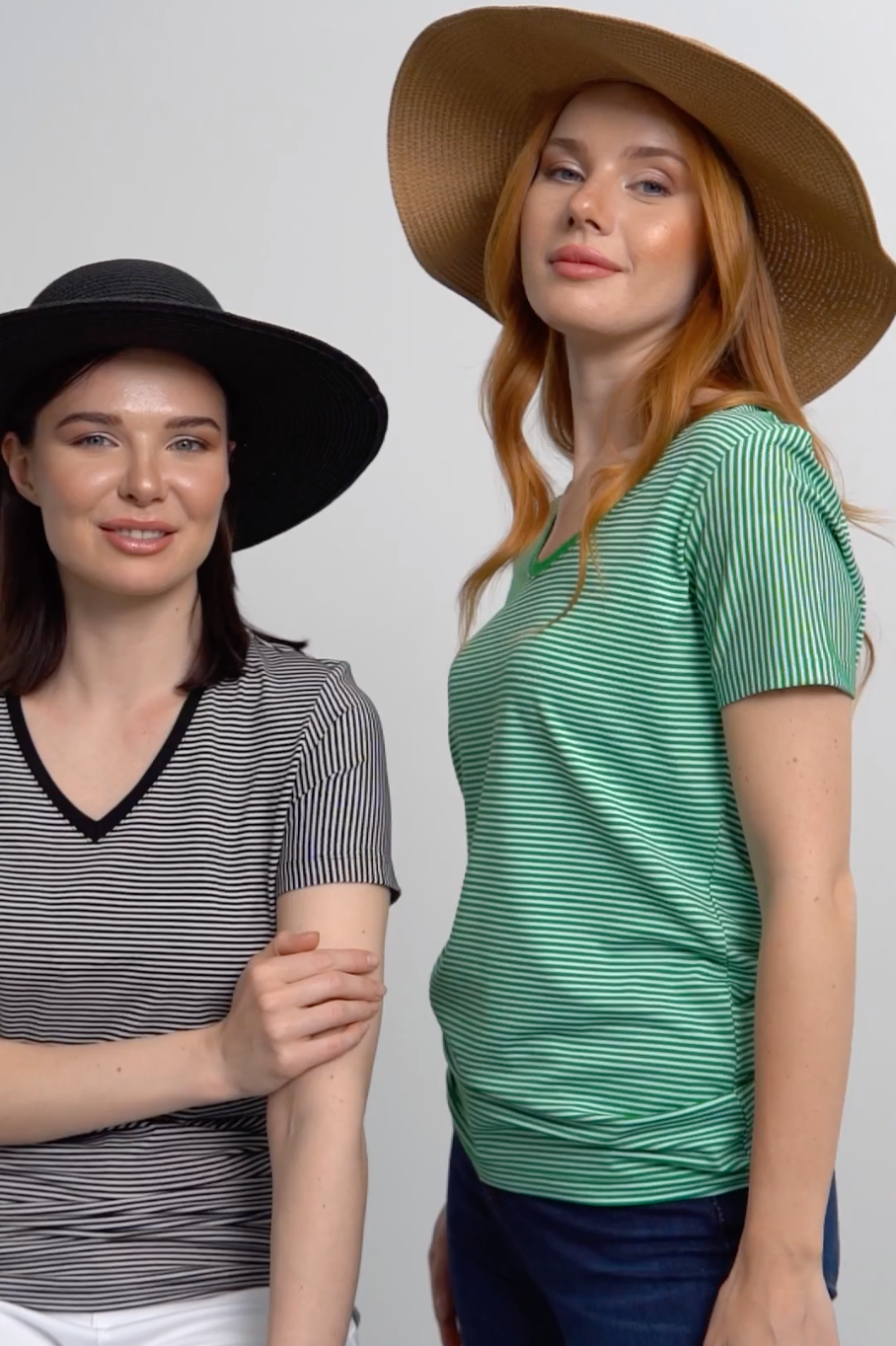 The basic V-neck and striped T-shirt creates a perfect look and is the perfect answer to your question "What will I wear?"