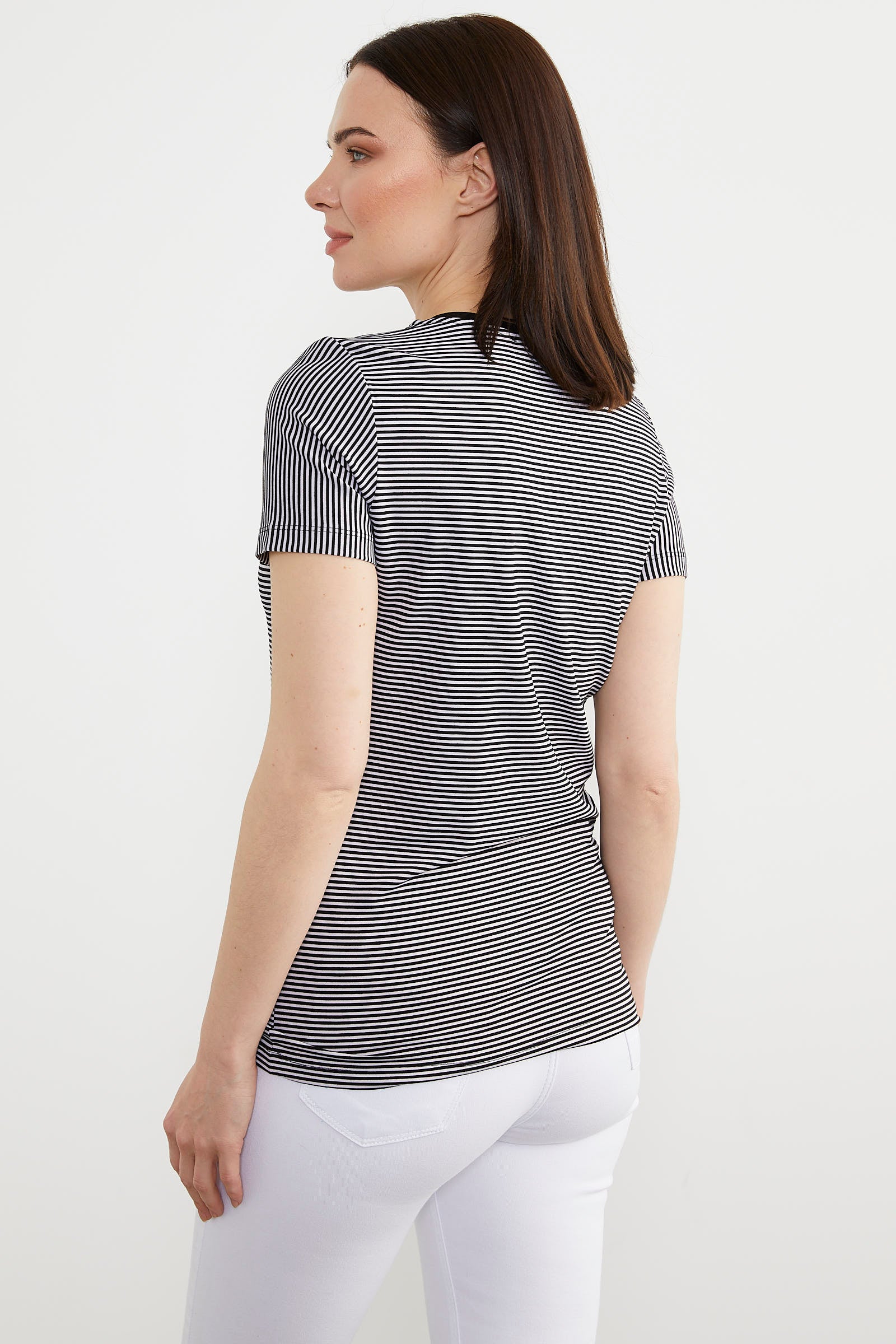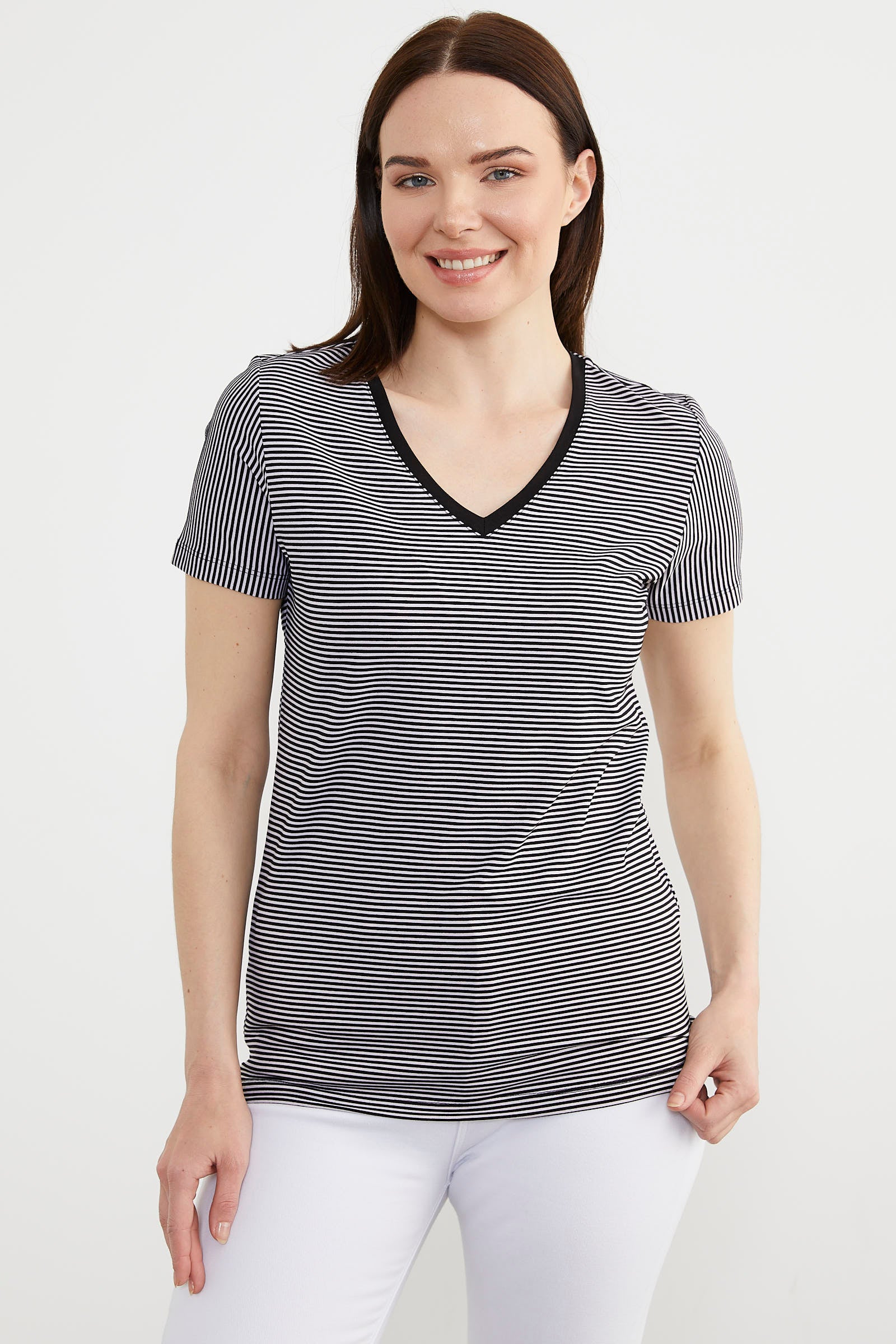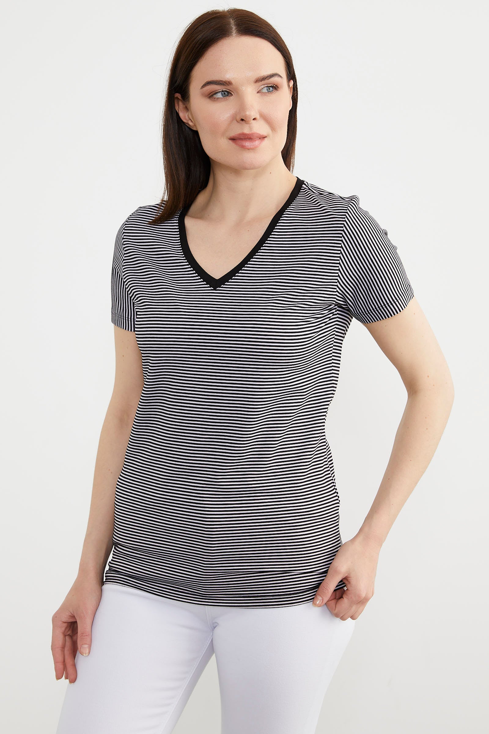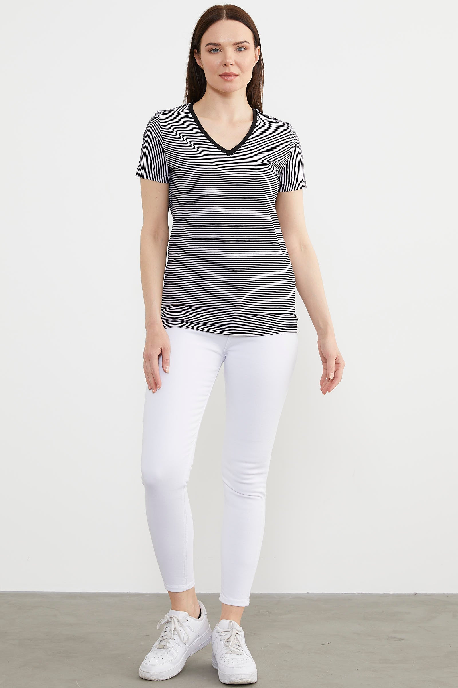 V-Neck Striped T-Shirt with Piping Detail - Black