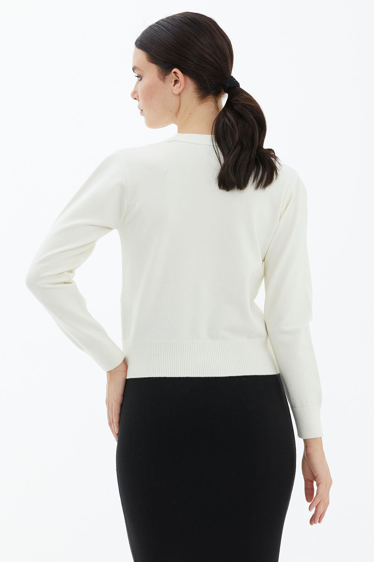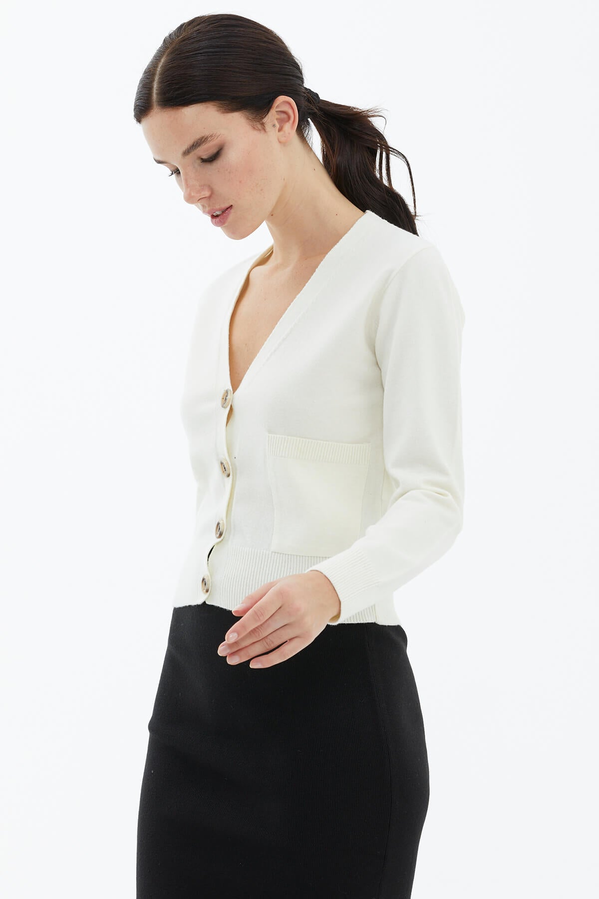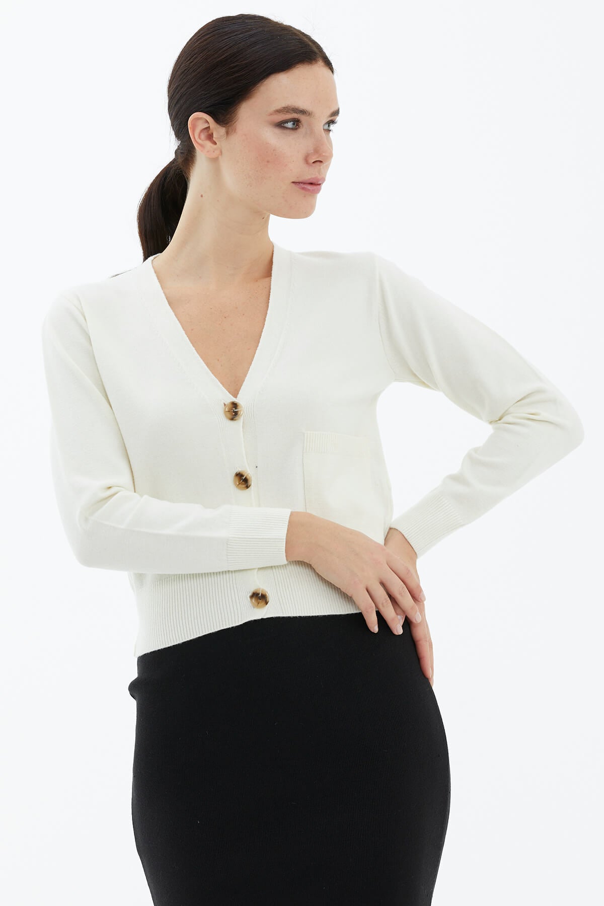 V Neck Buttoned Knitwear Cardigan with Pocket - Bone