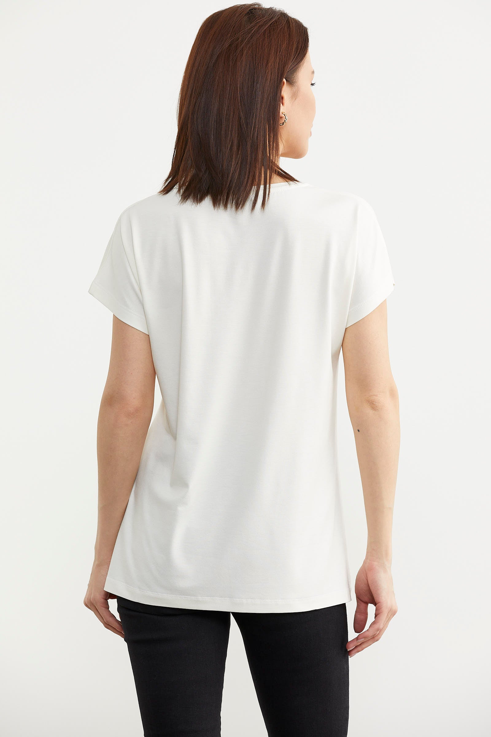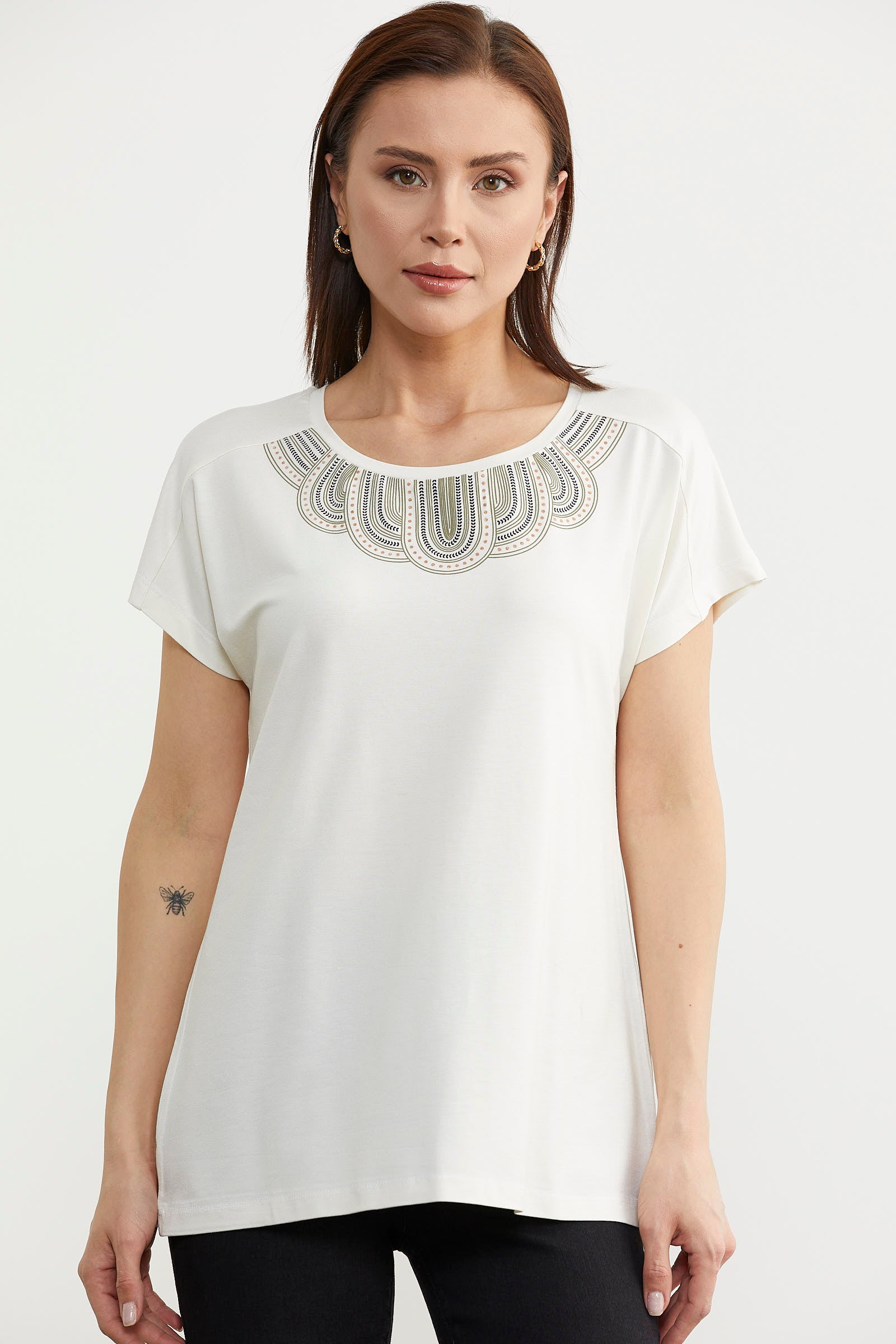 The batwing sleeve, flowing basic T-shirt reflects a great stance with its print detail covering the entire collar.