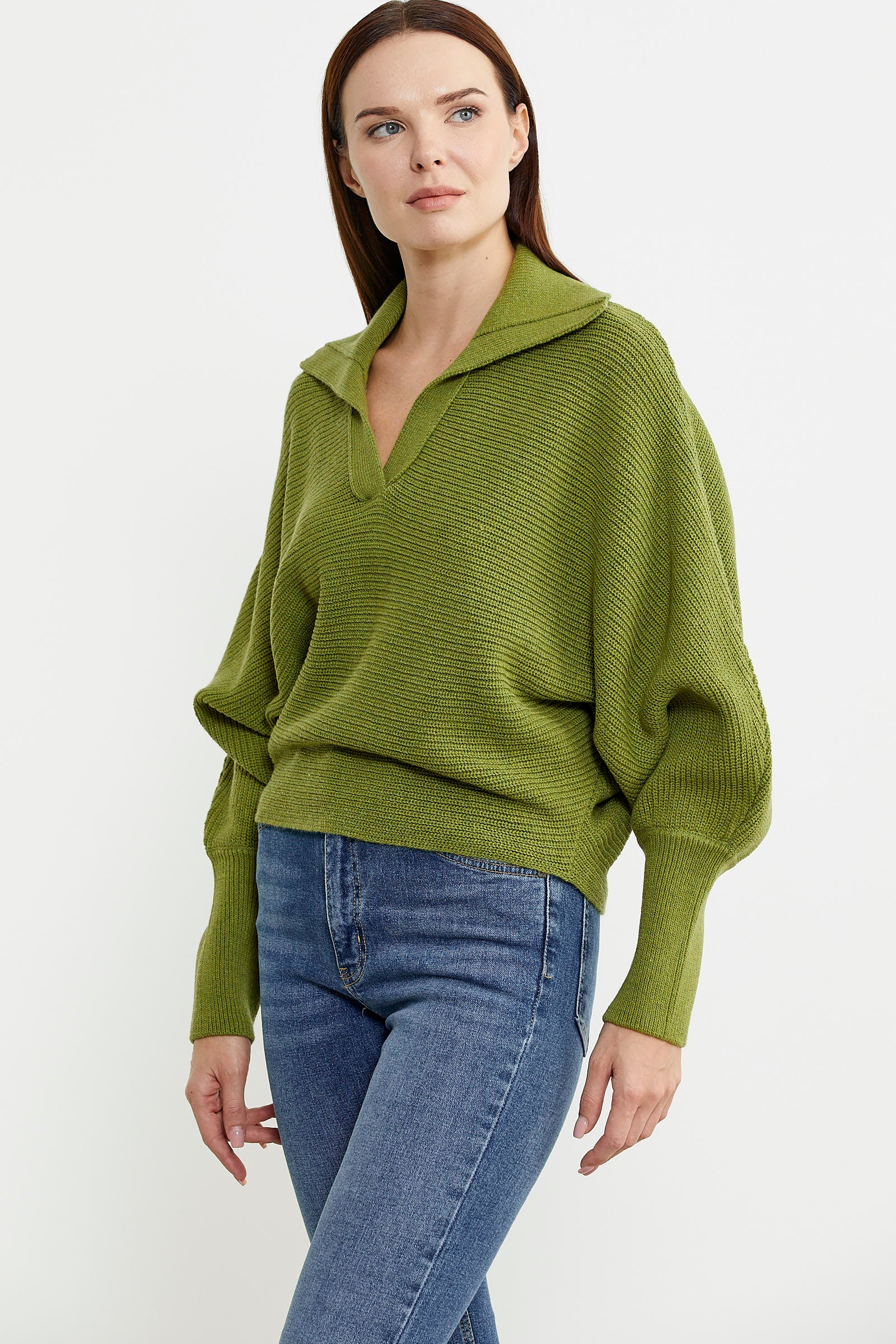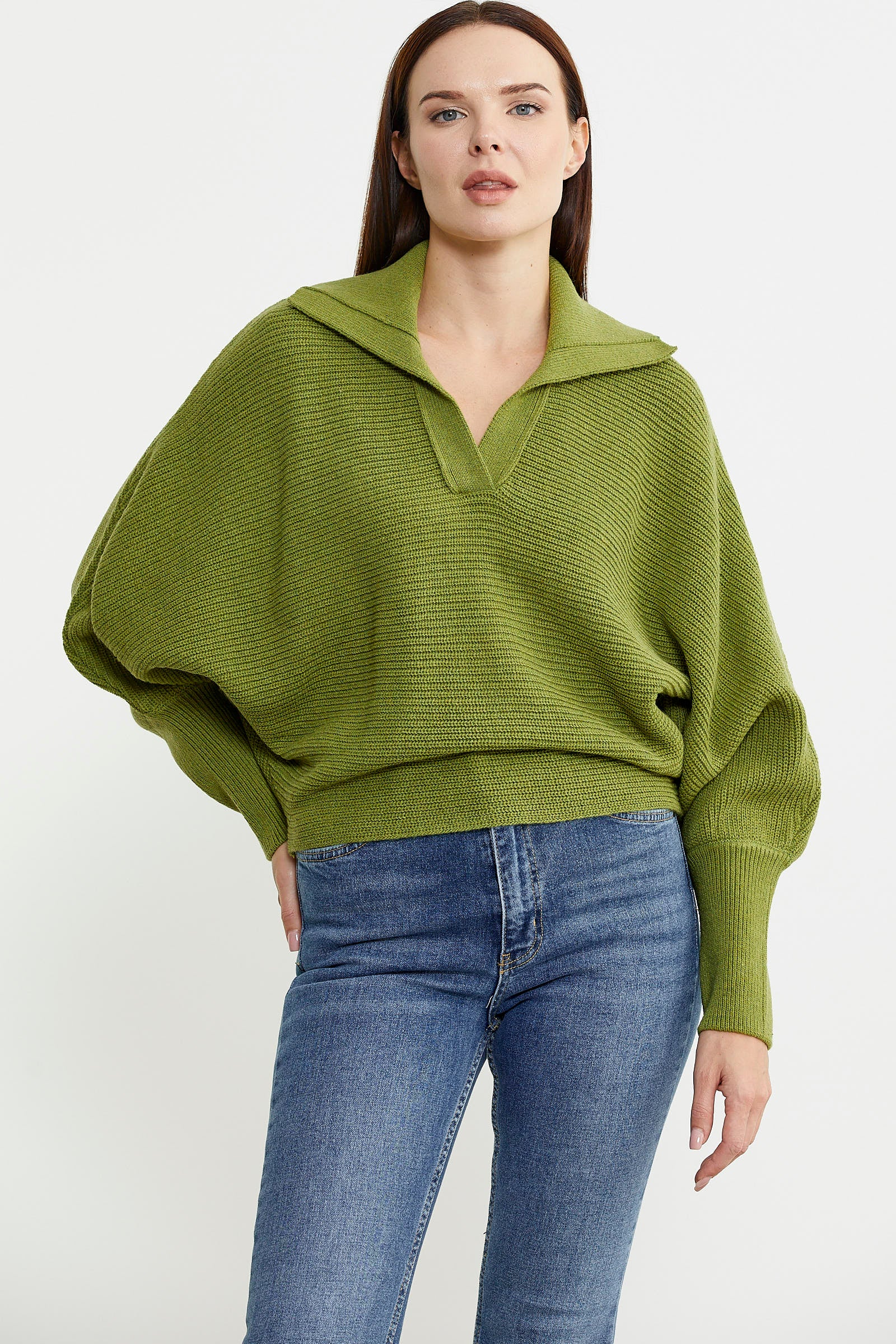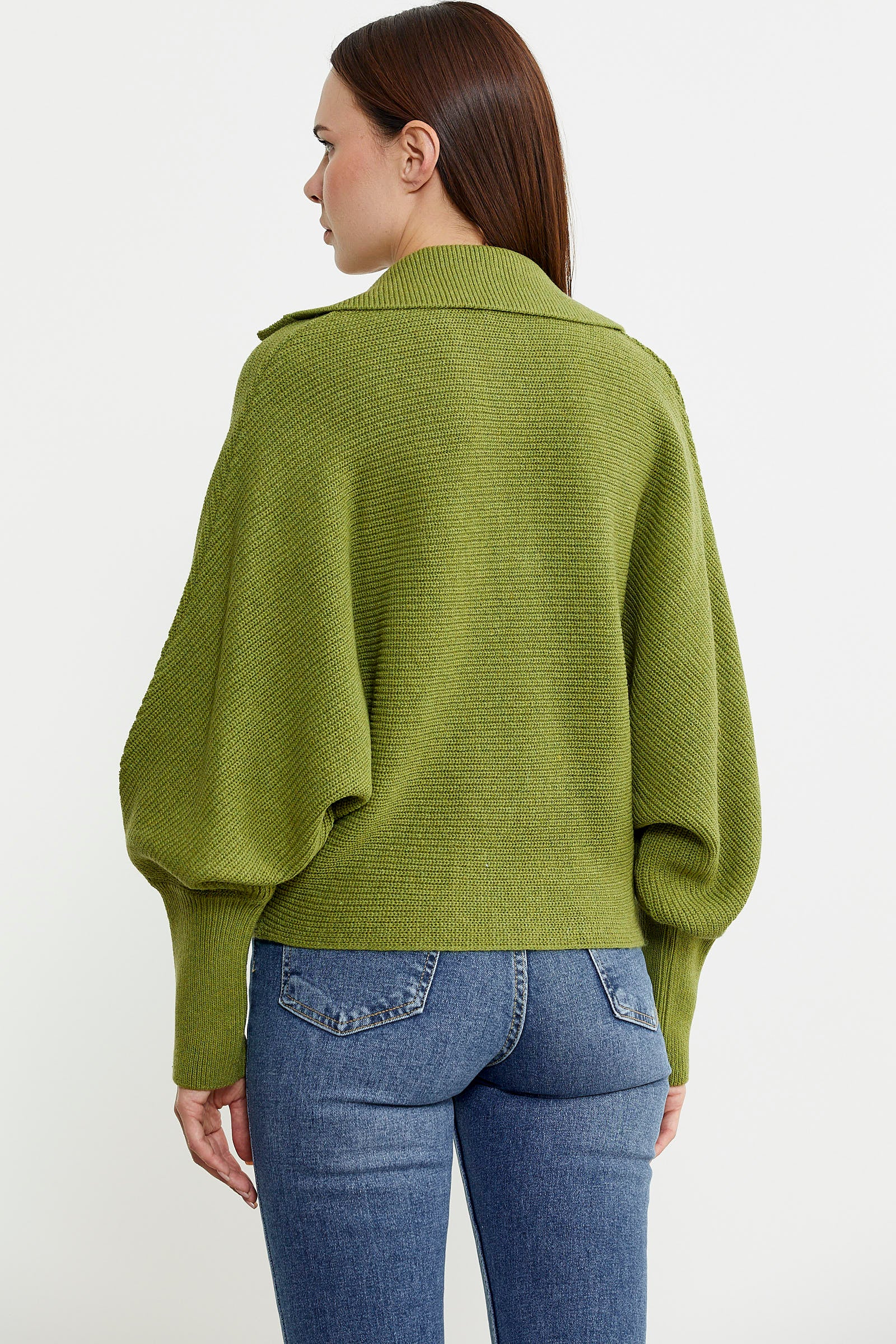 Bat Sleeve Polo Neck Wool Knitted Sweater - Green