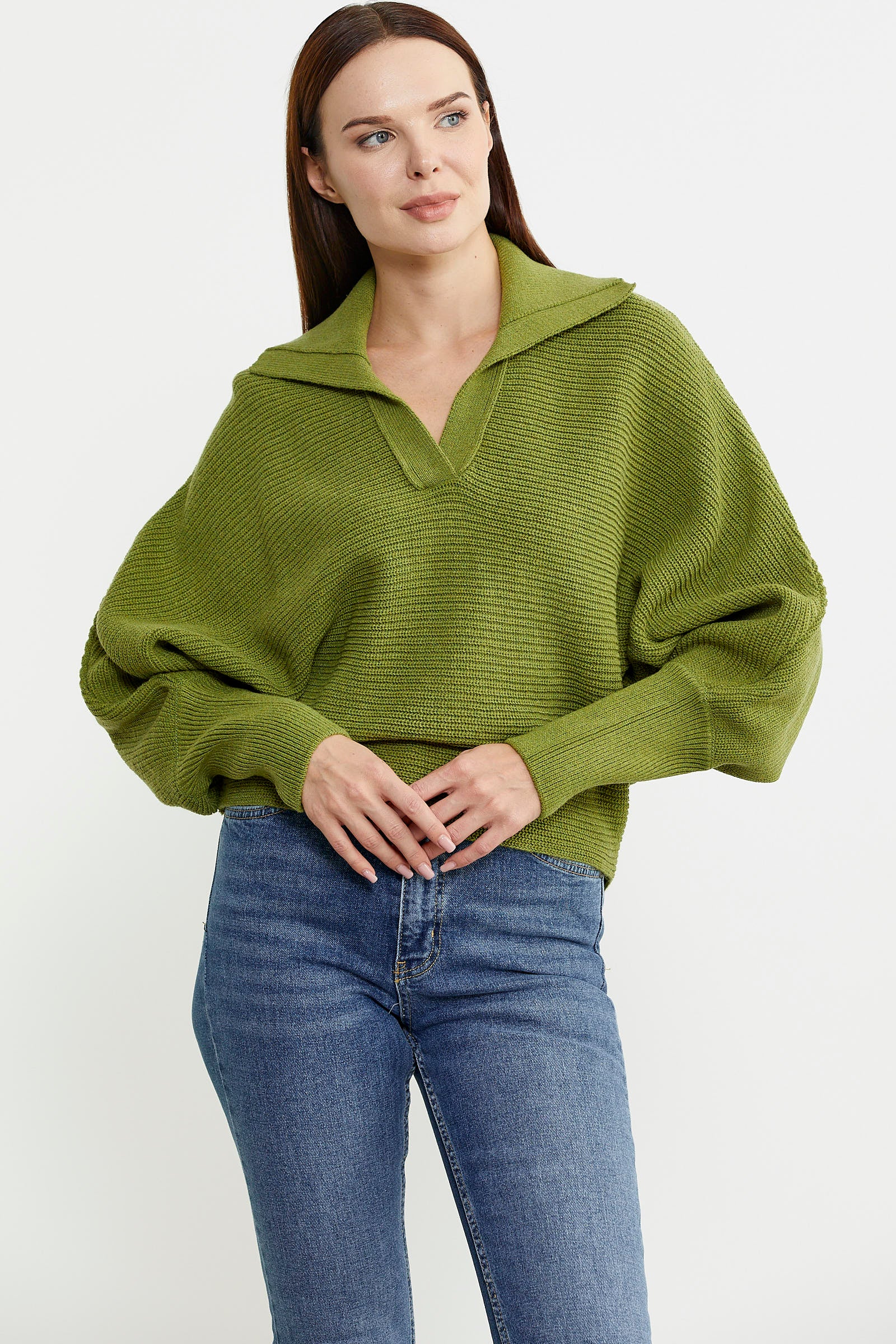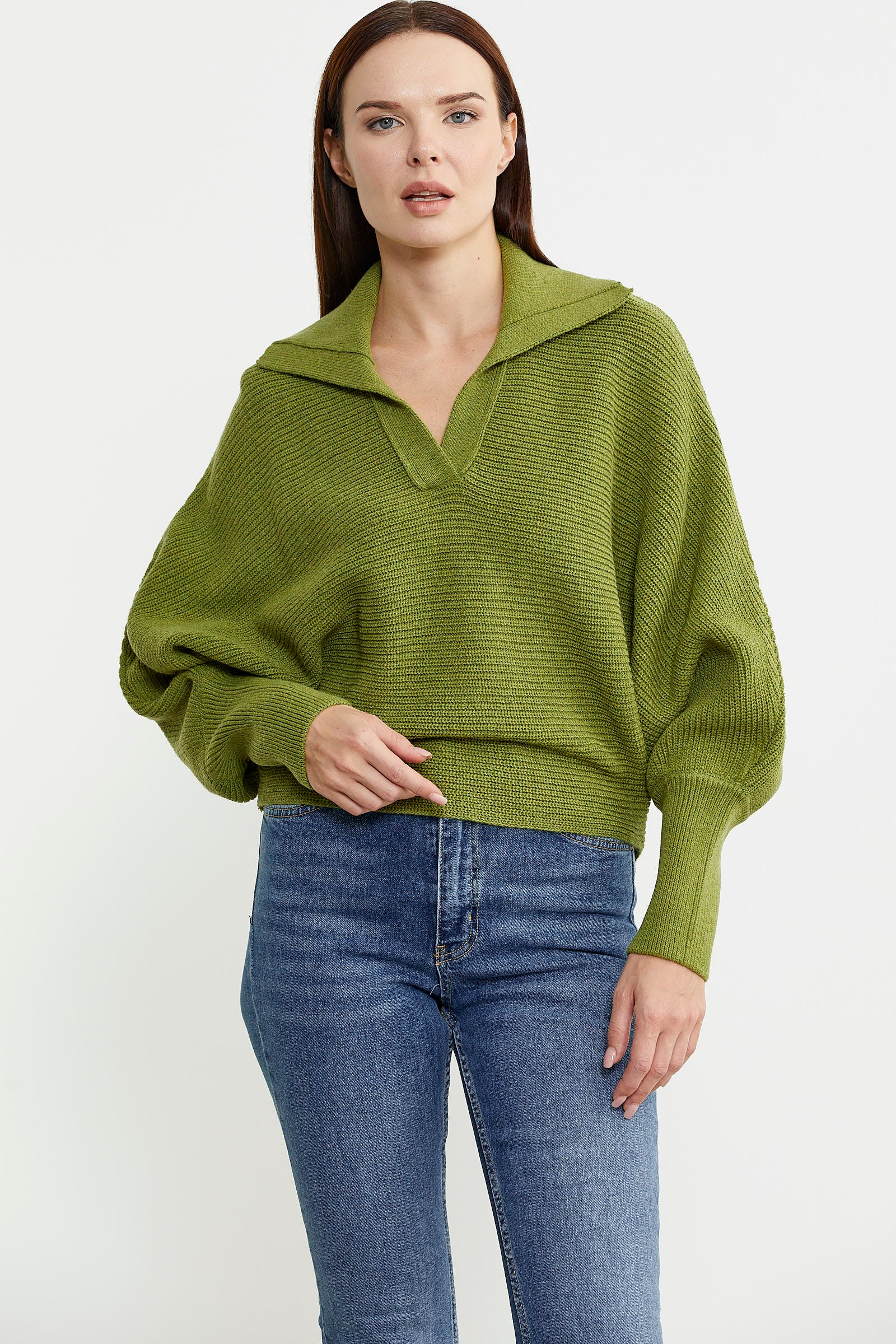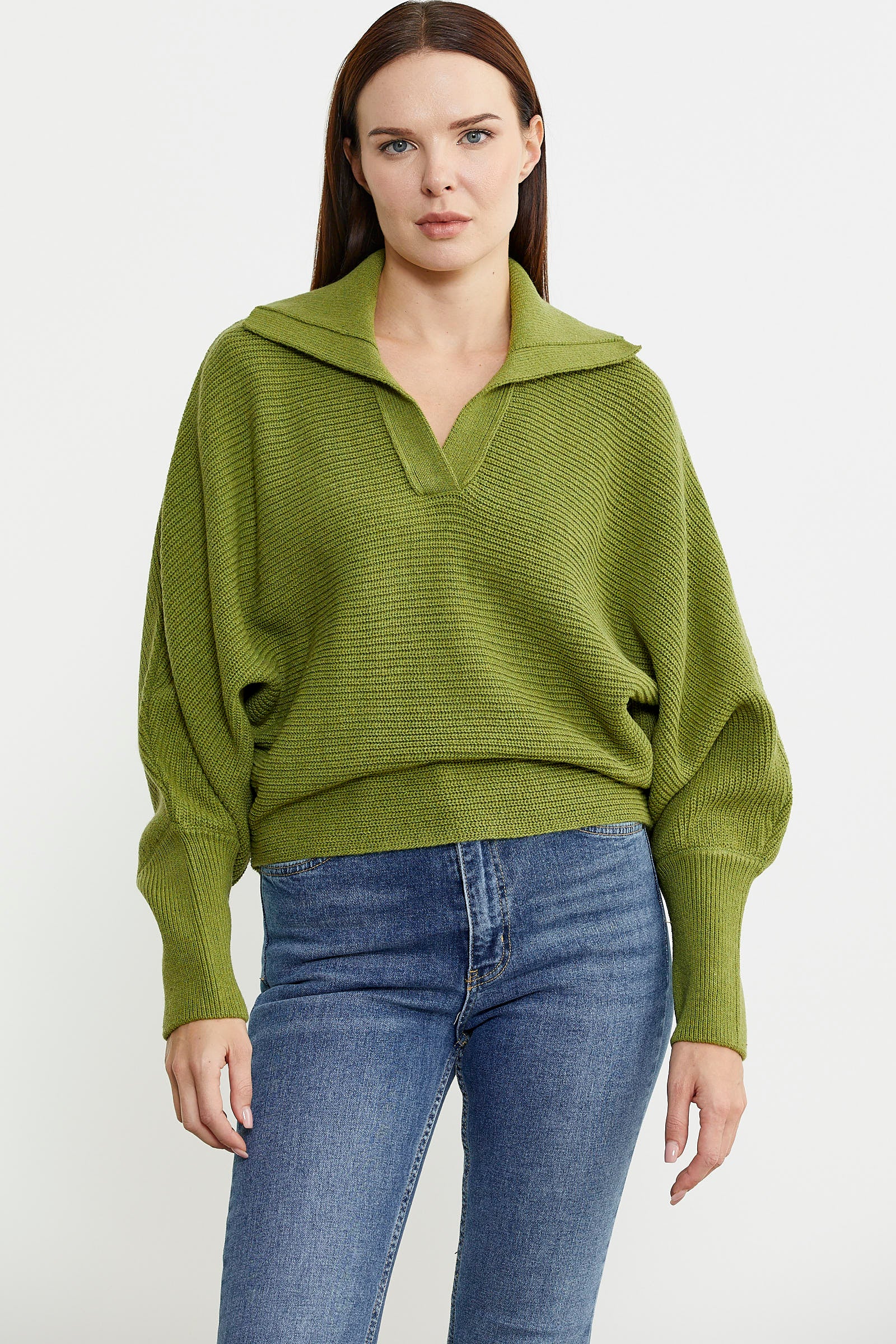 Bat Sleeve Polo Neck Wool Knitted Sweater - Green