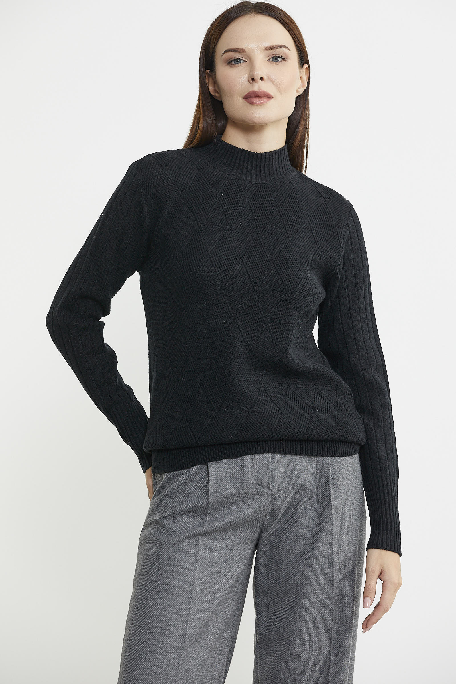 The knitted sweater, which combines colorful diamond motifs with sleeve knit detail, has a half turtleneck. It is a comfortable fit.