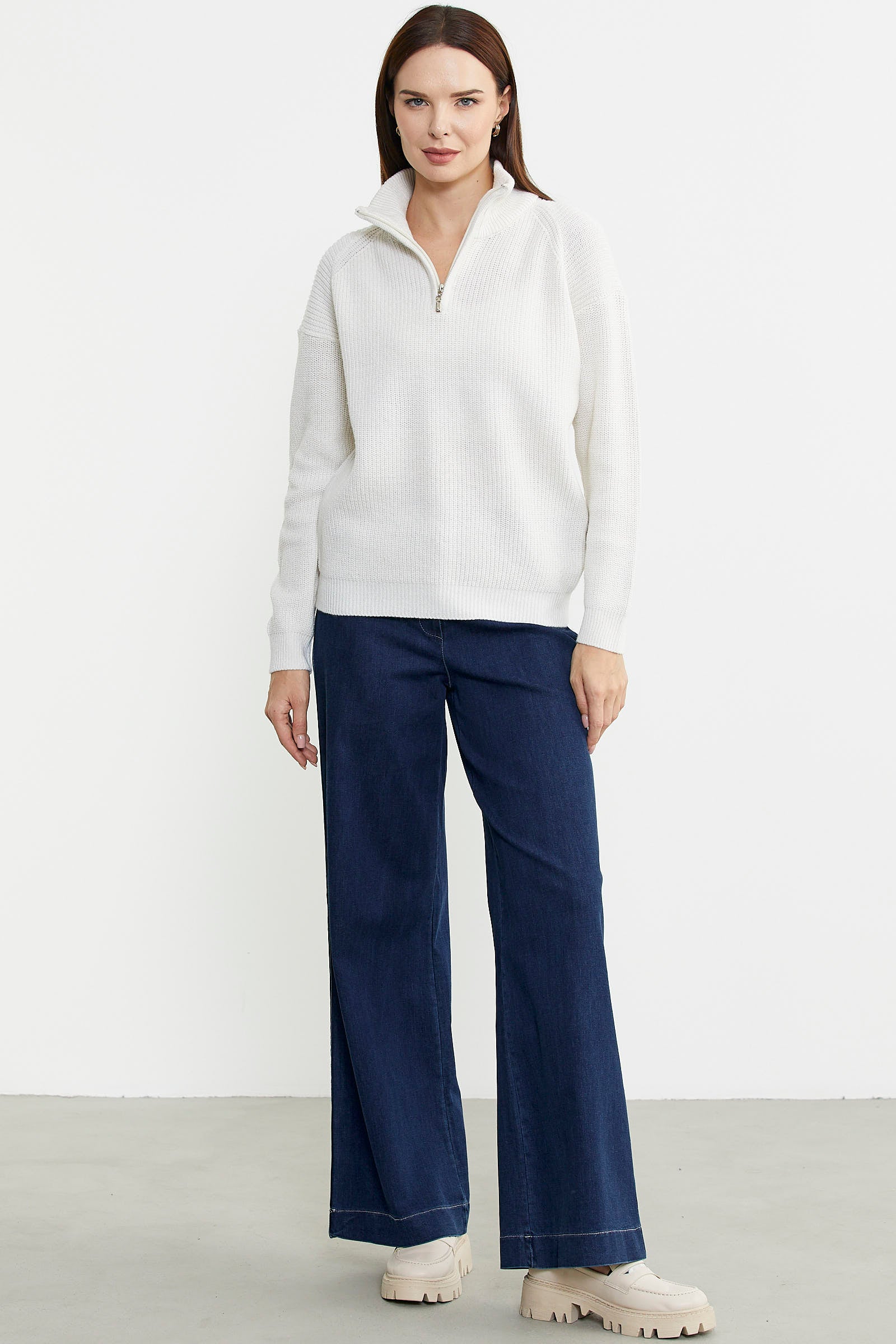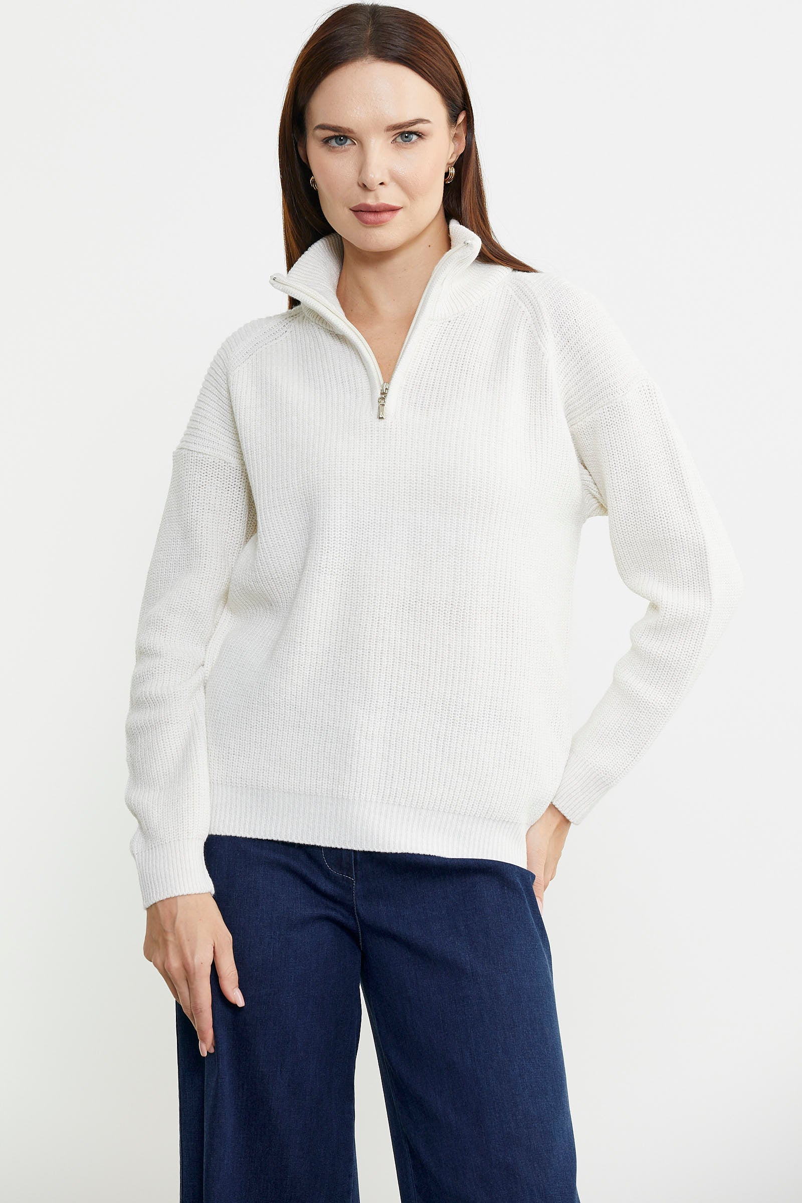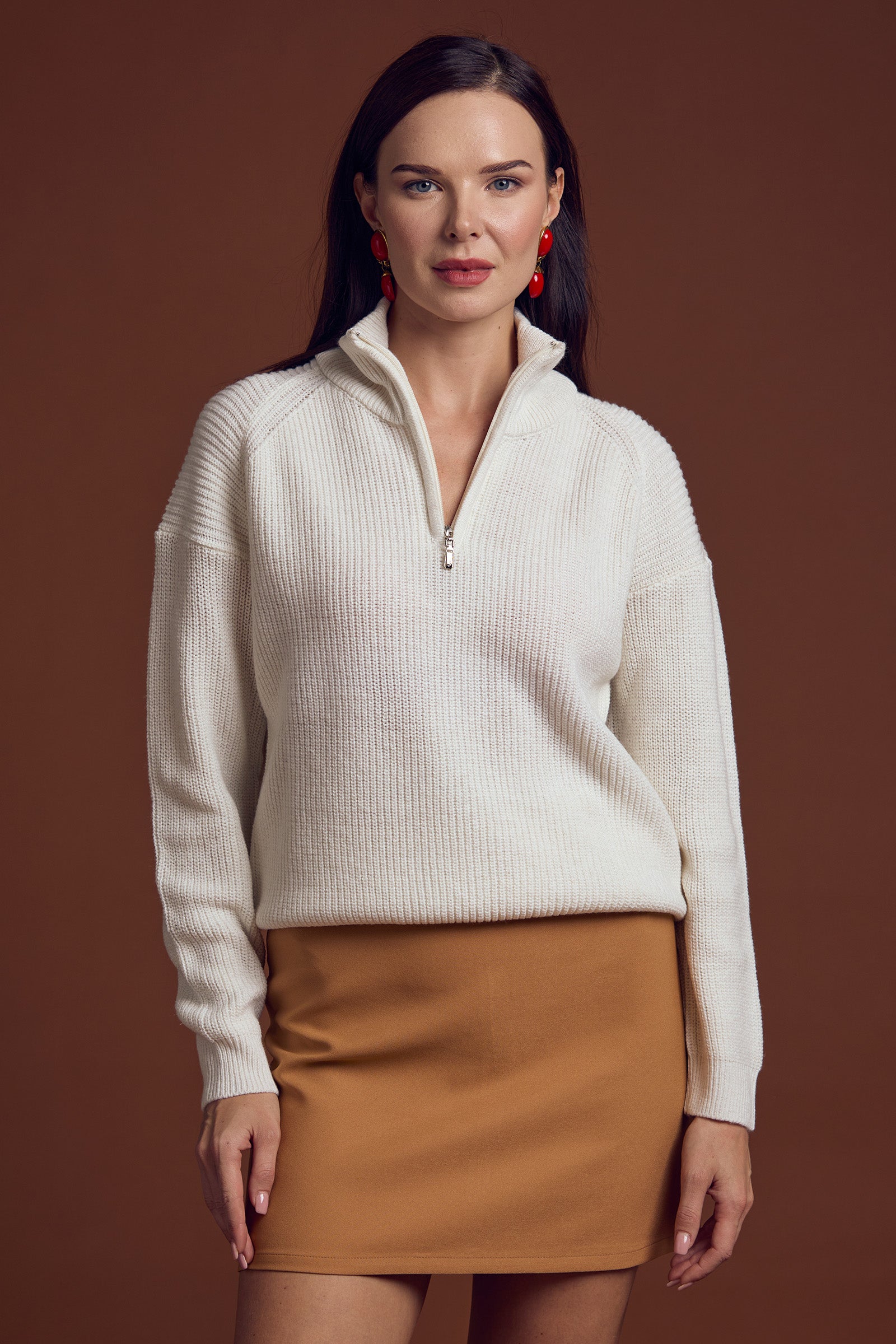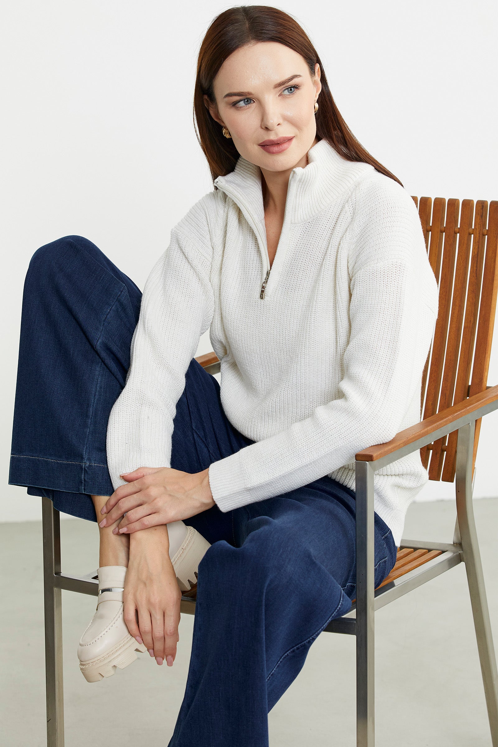 Long sleeve, half turtleneck, zip-up knit sweater made of wool blend yarn.