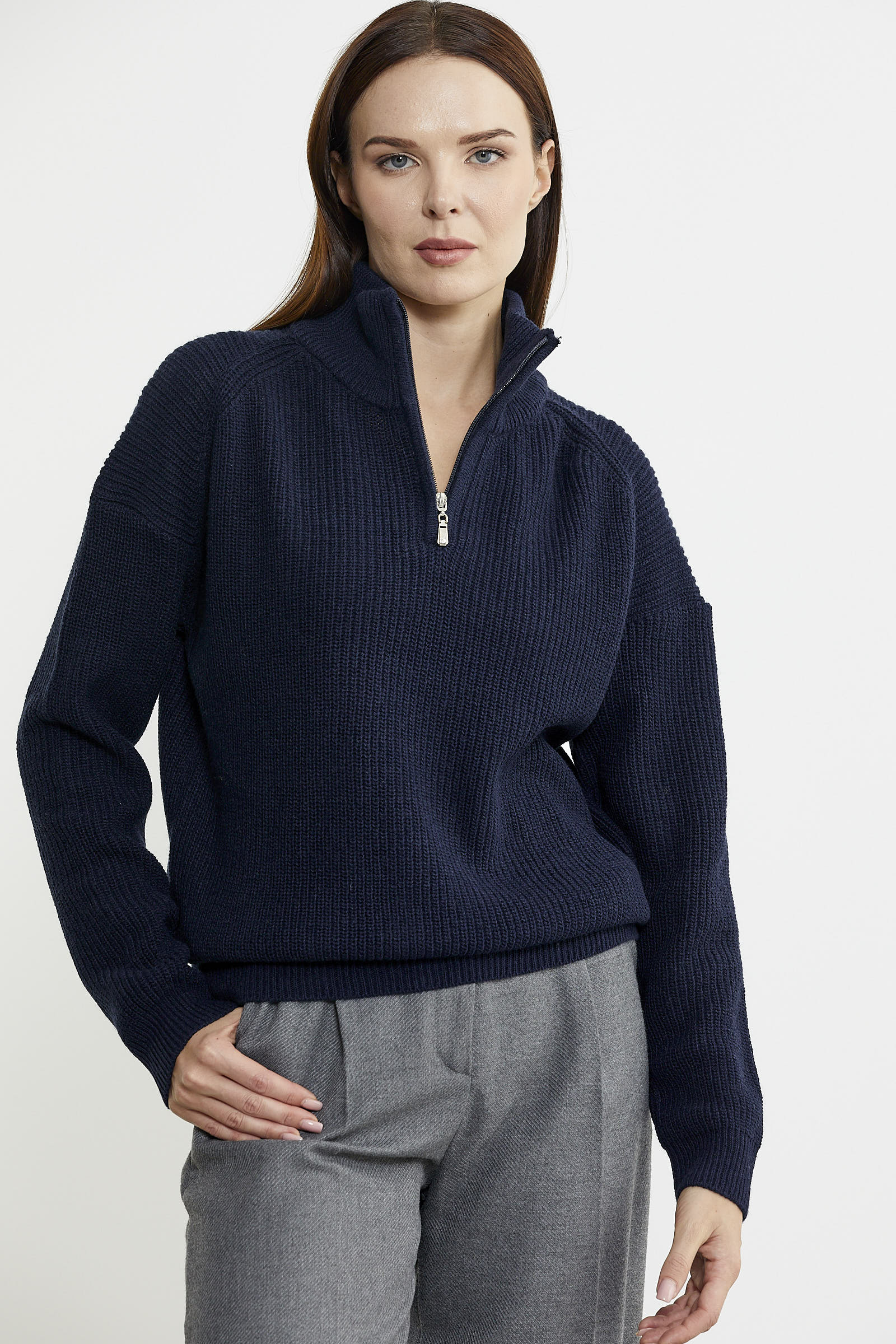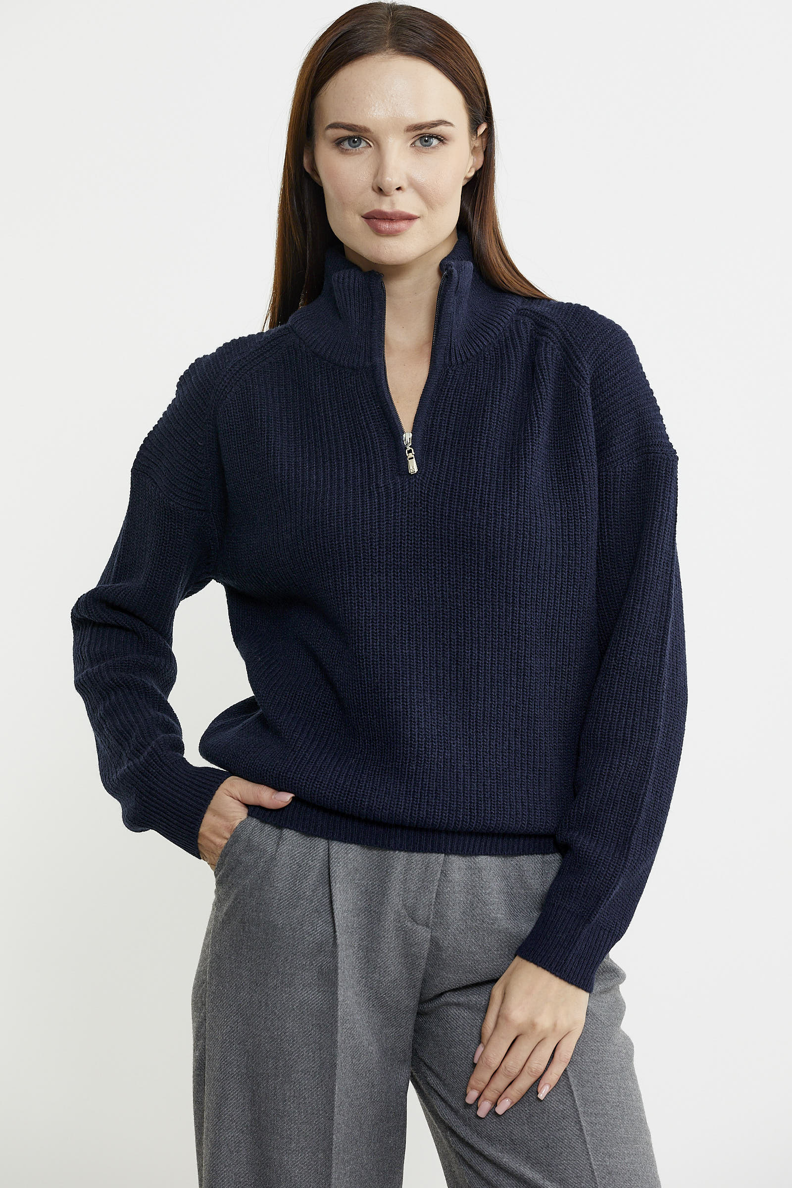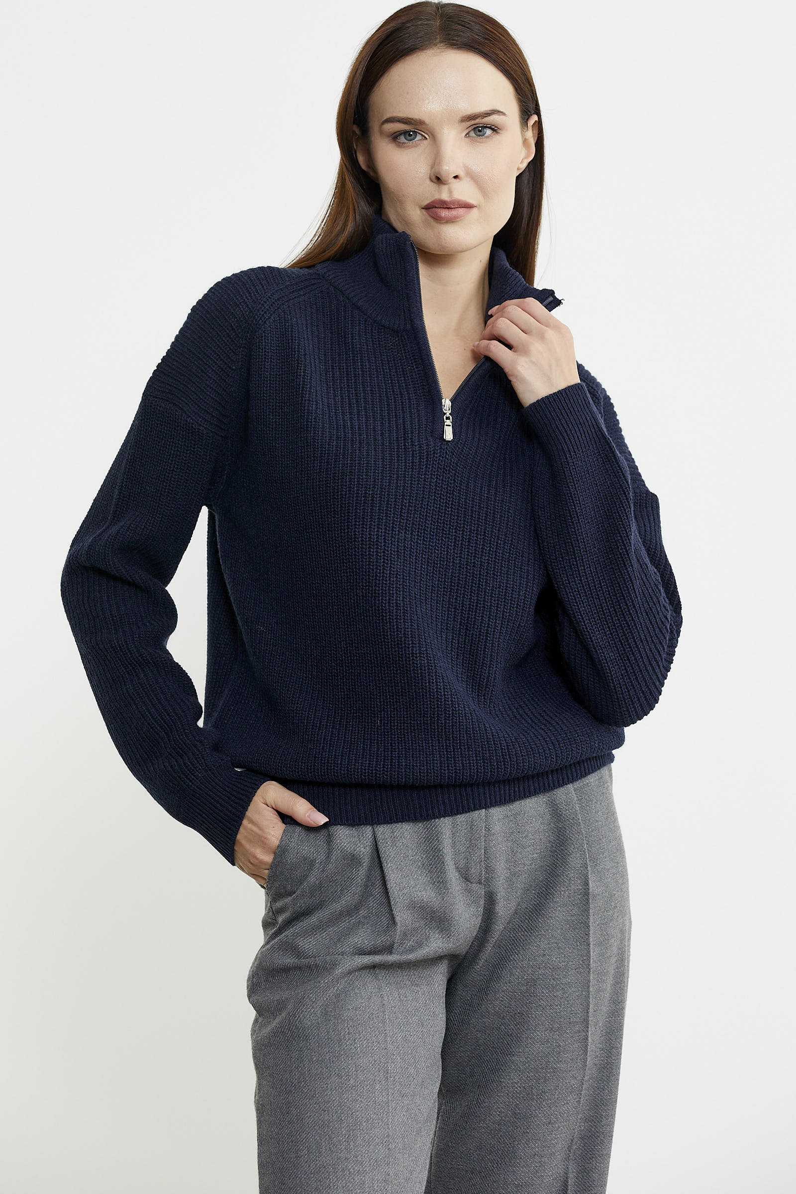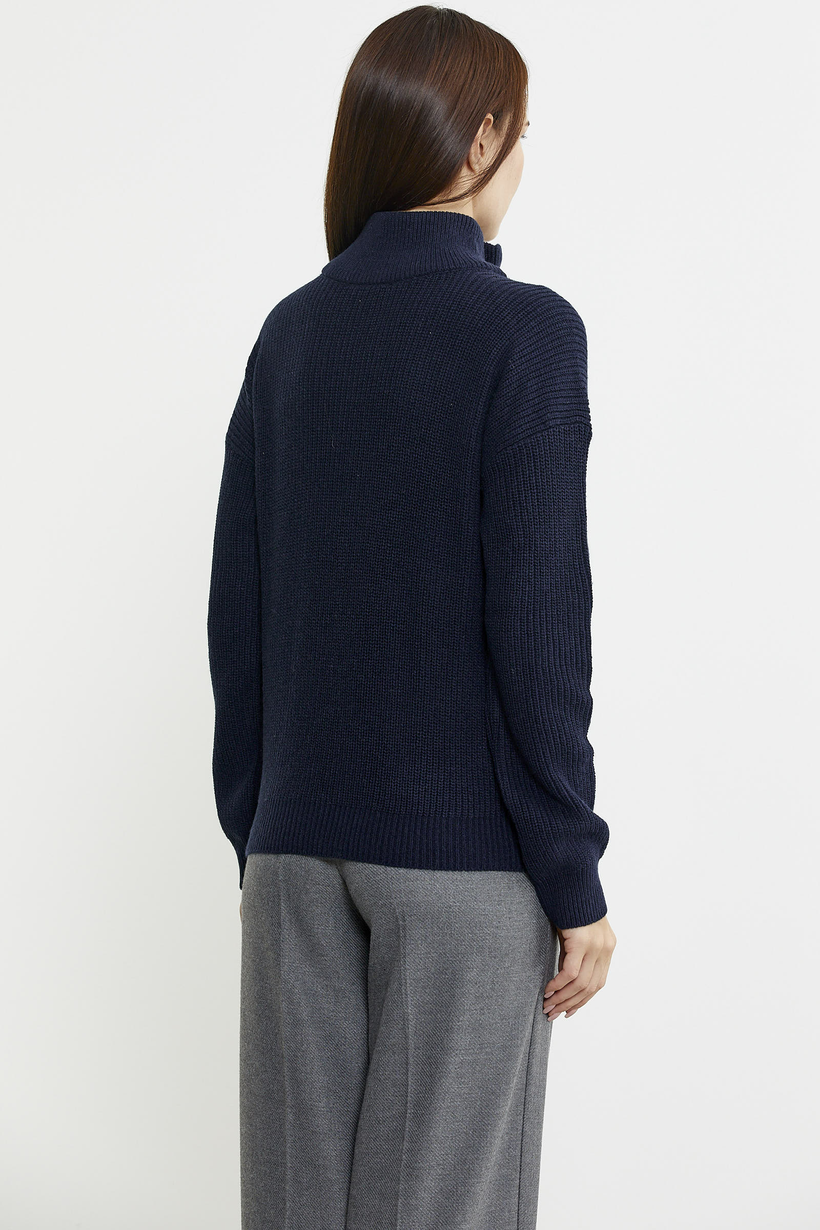Long sleeve, half turtleneck, zip-up knit sweater made of wool blend yarn.