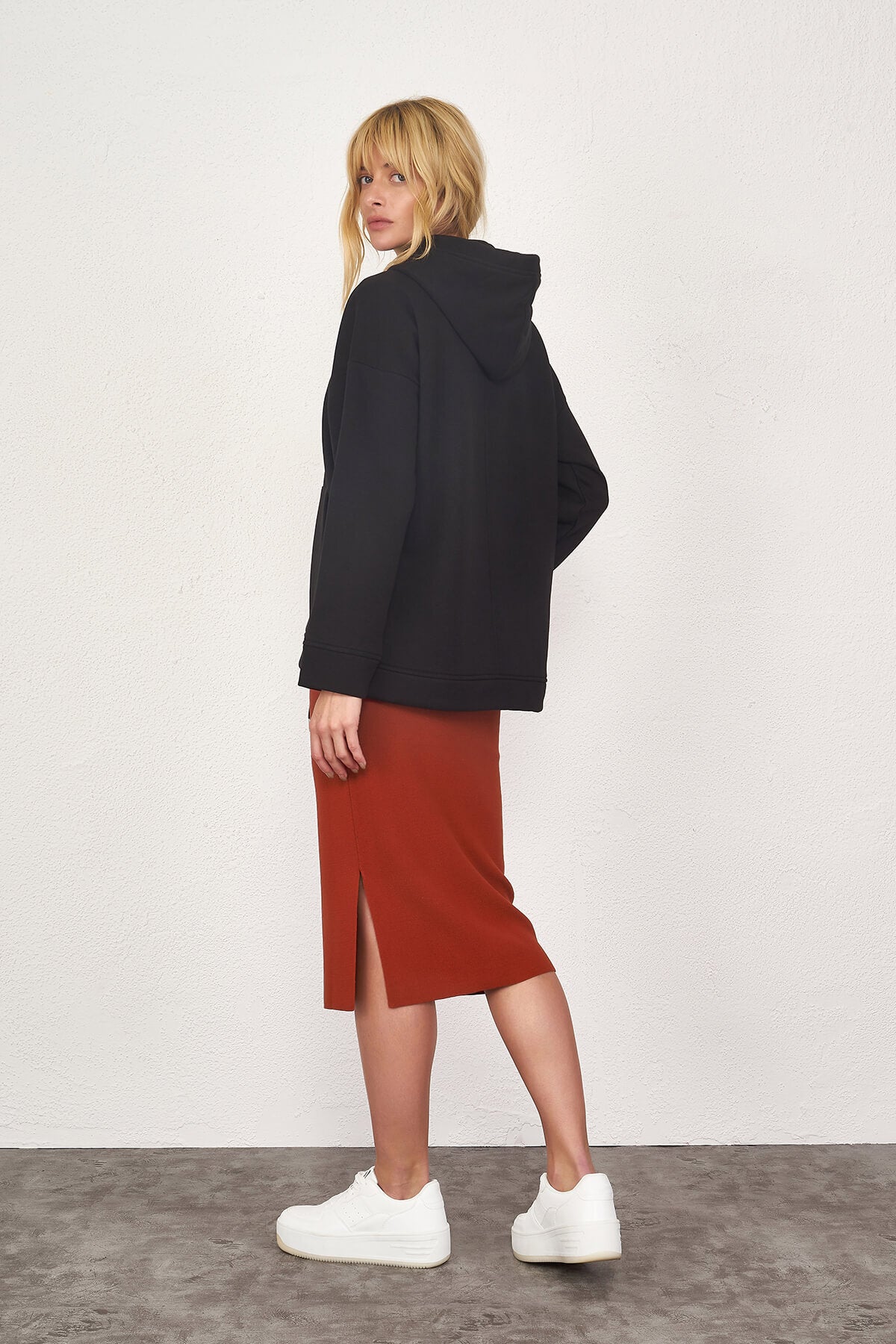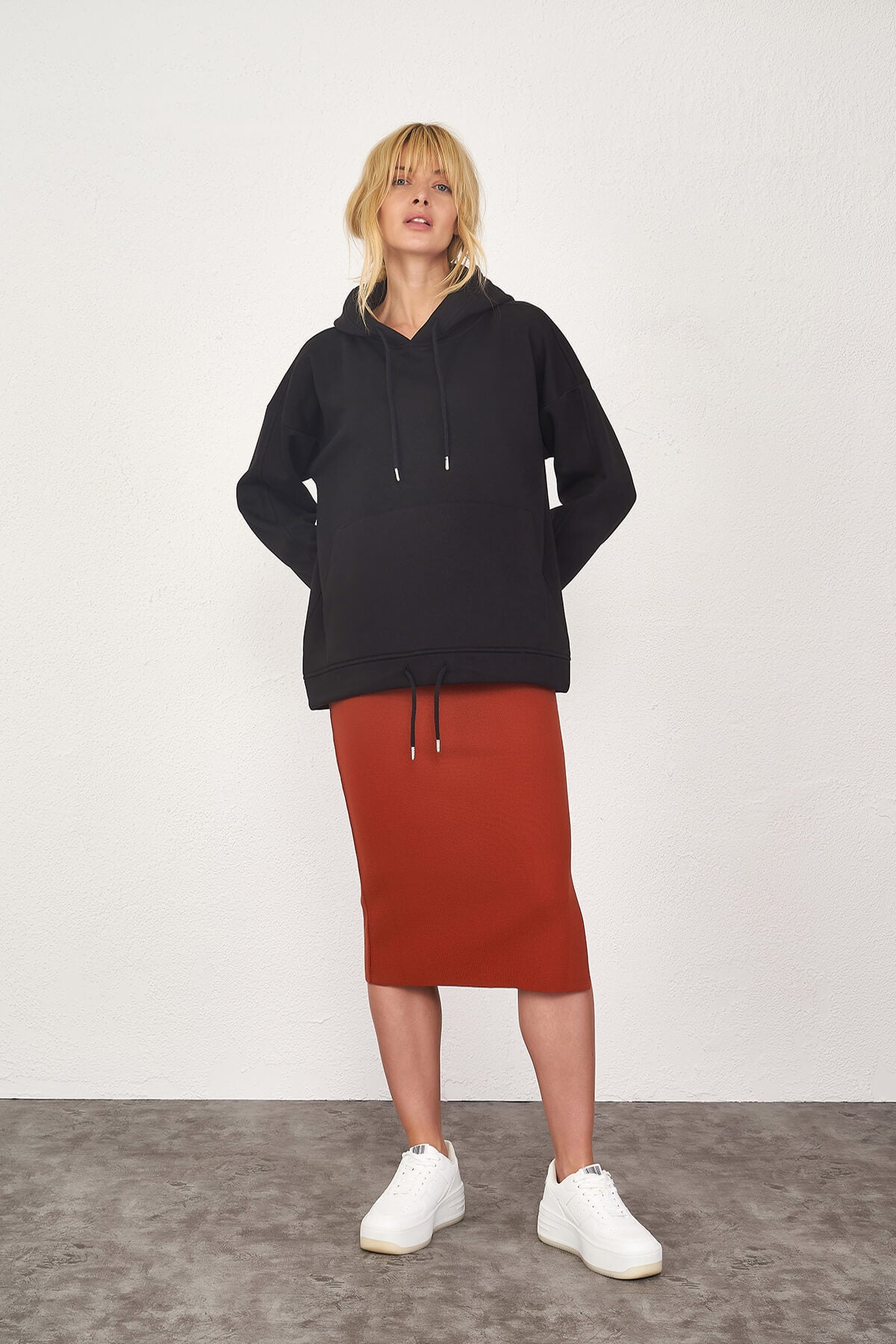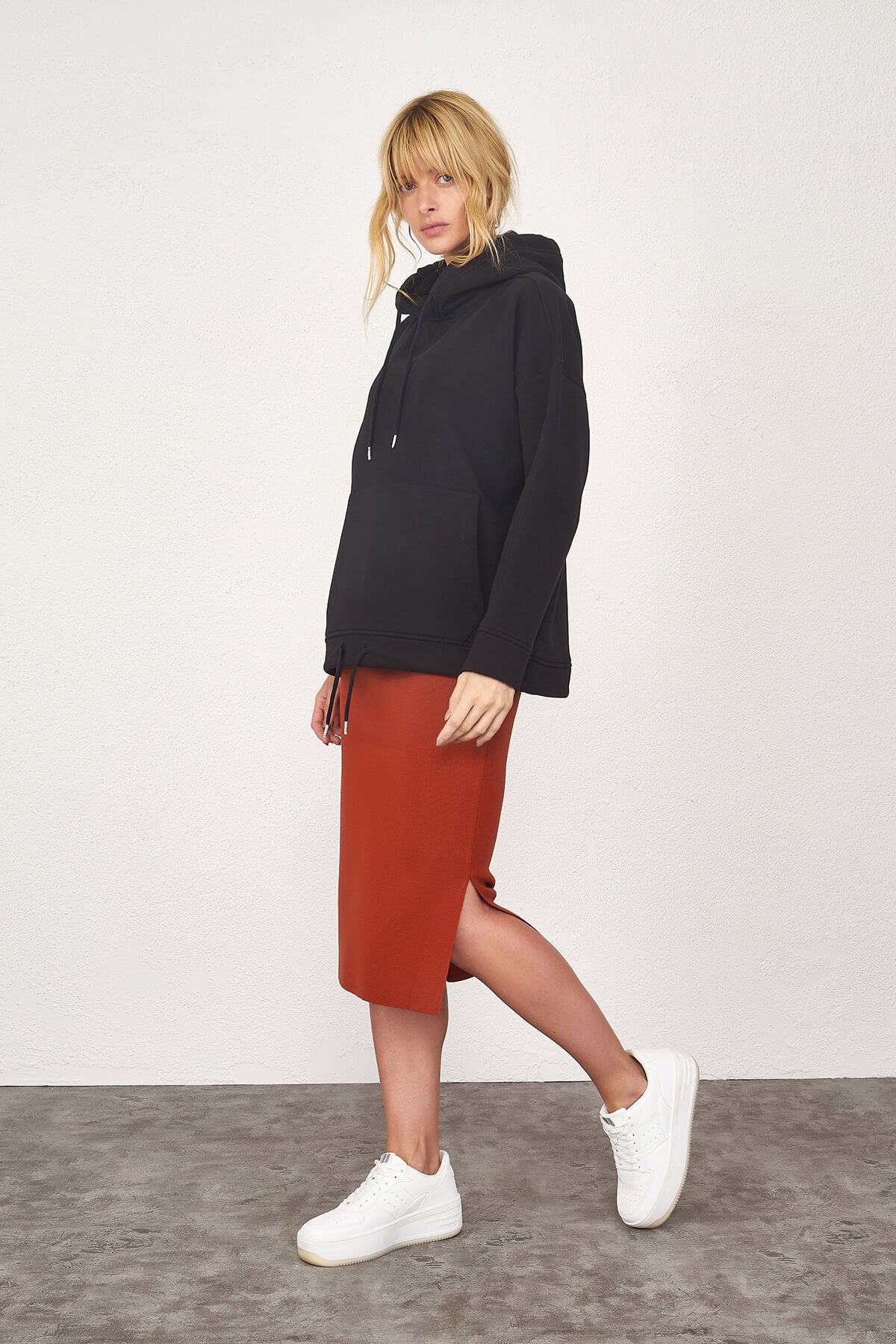 Body-hugging, elasticated high waist, midi length, knit skirt with side slits.