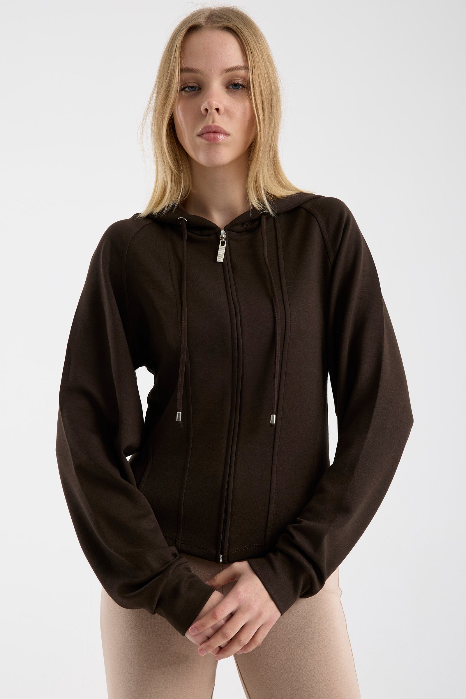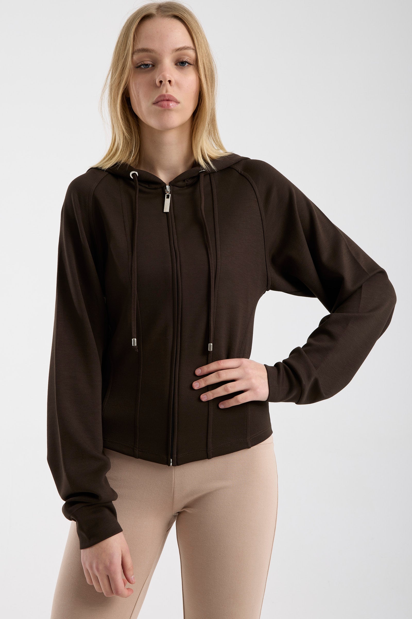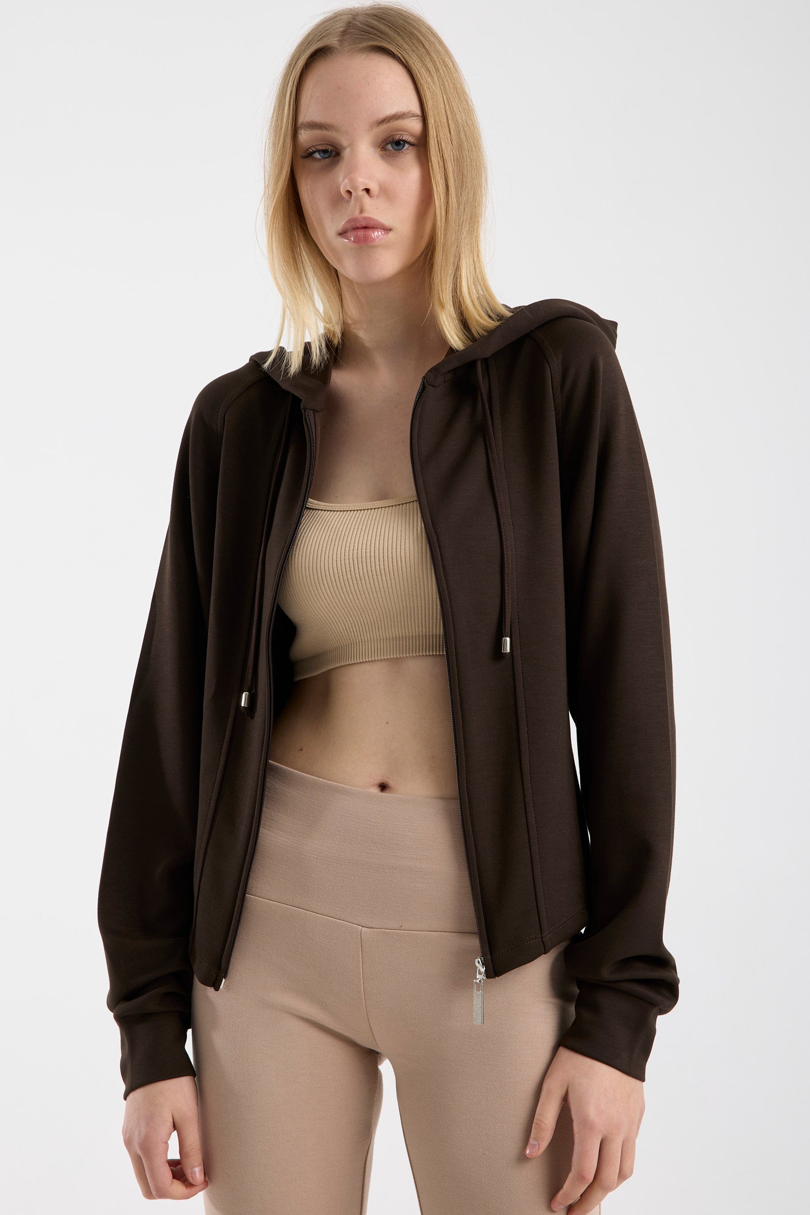 Kapüşonlu, yumuşak dokunuşlu, dar kesim sweat crop ceket. Önden fermuarlı, nefes alabilen kumaştan üretilmiştir.