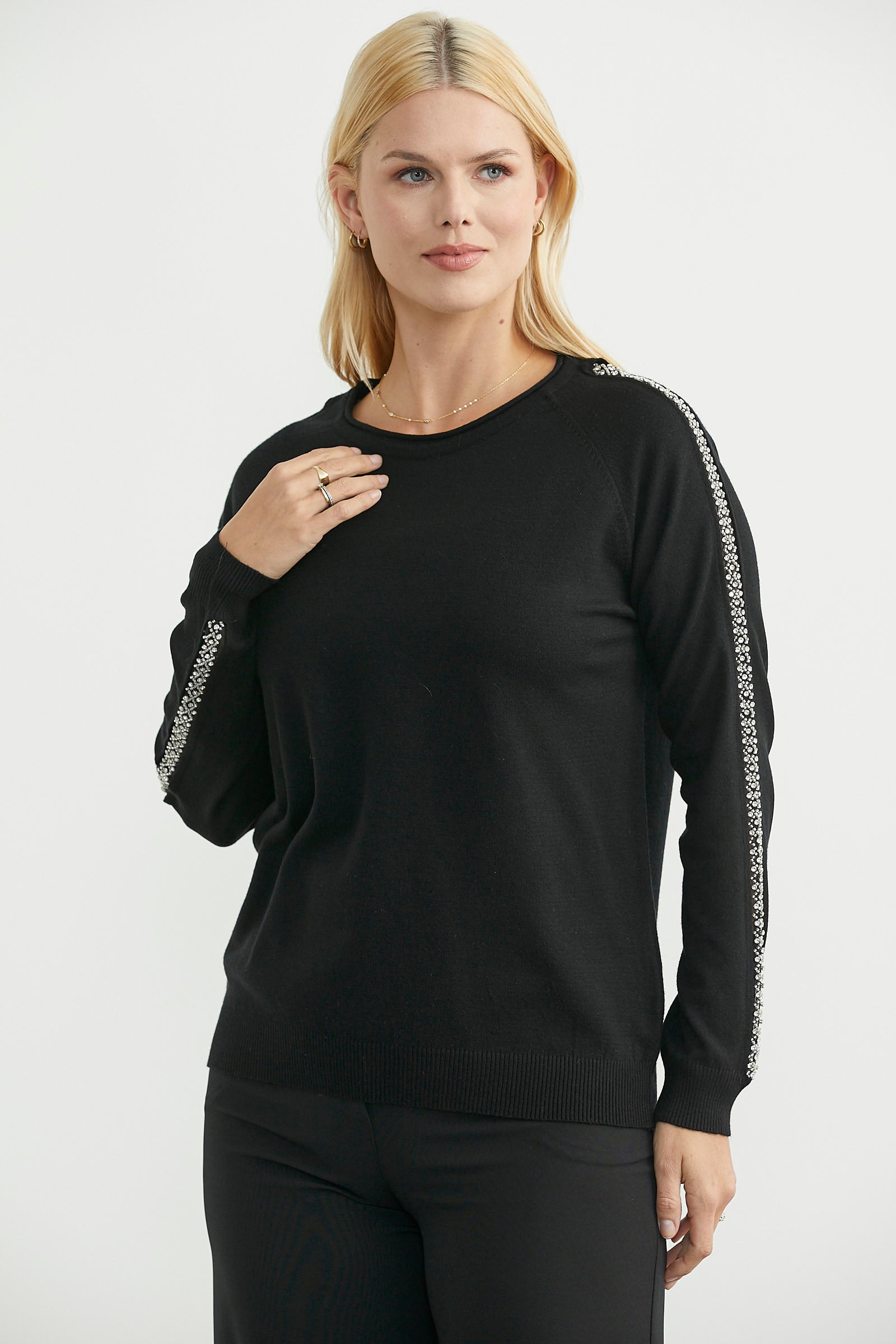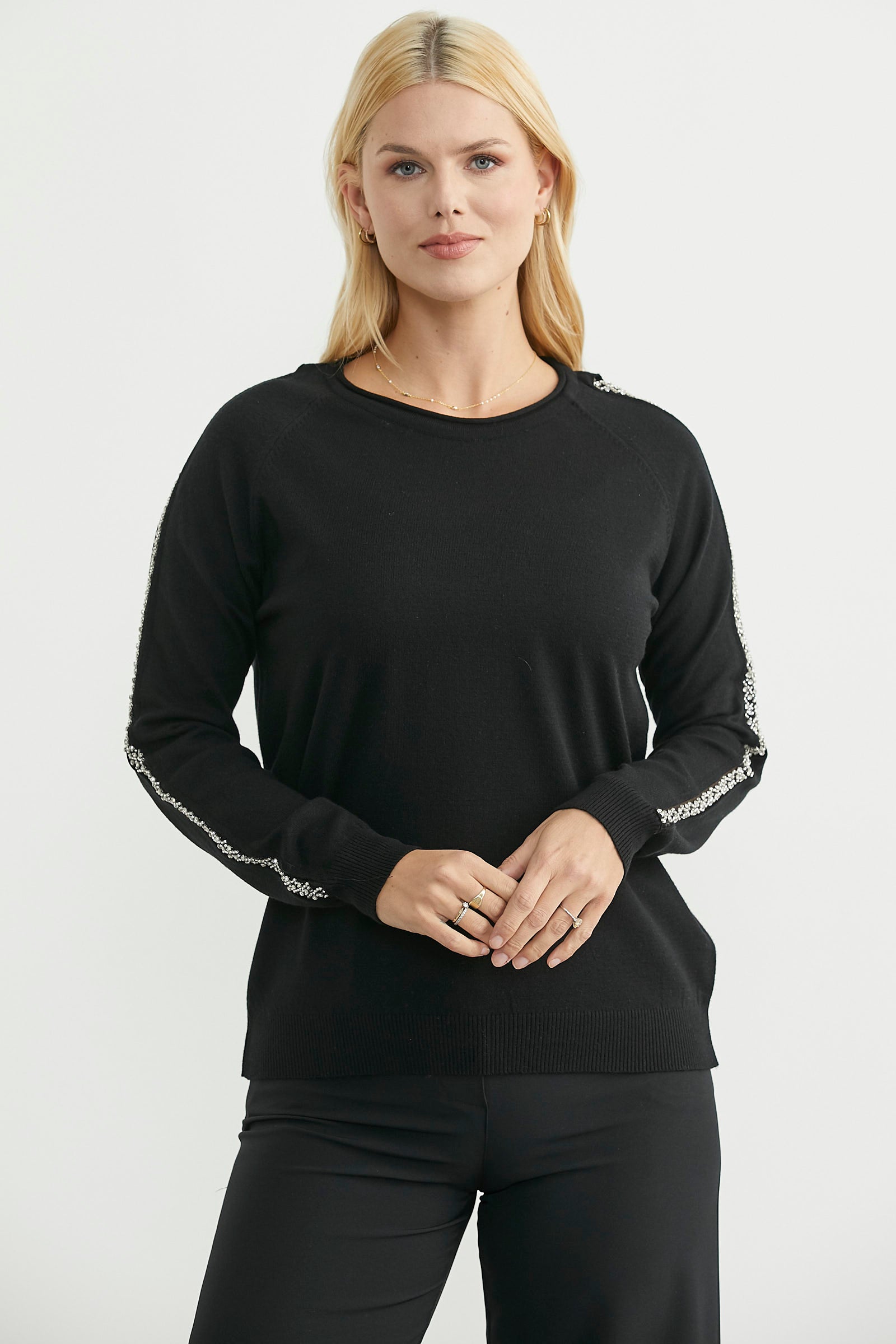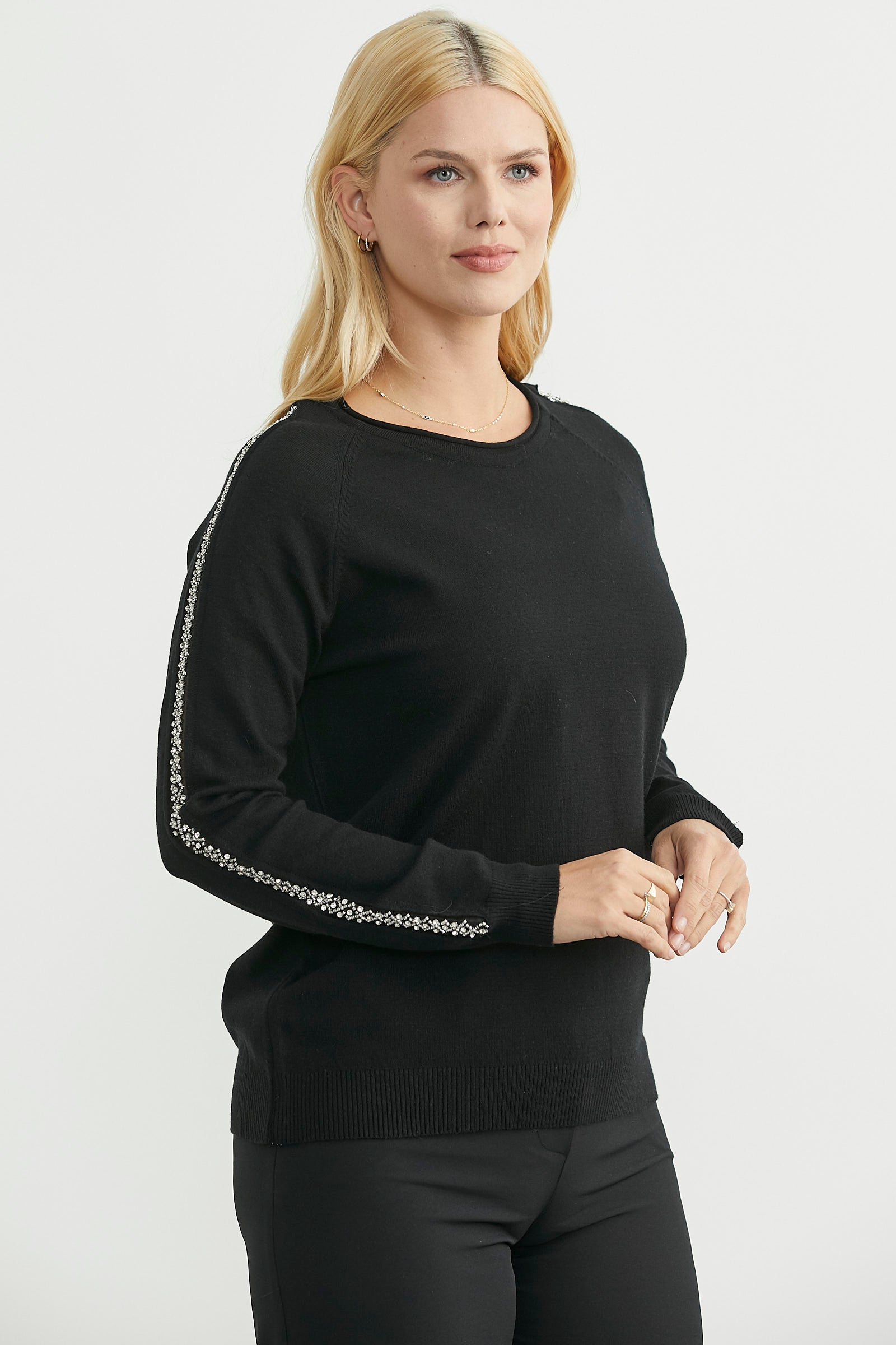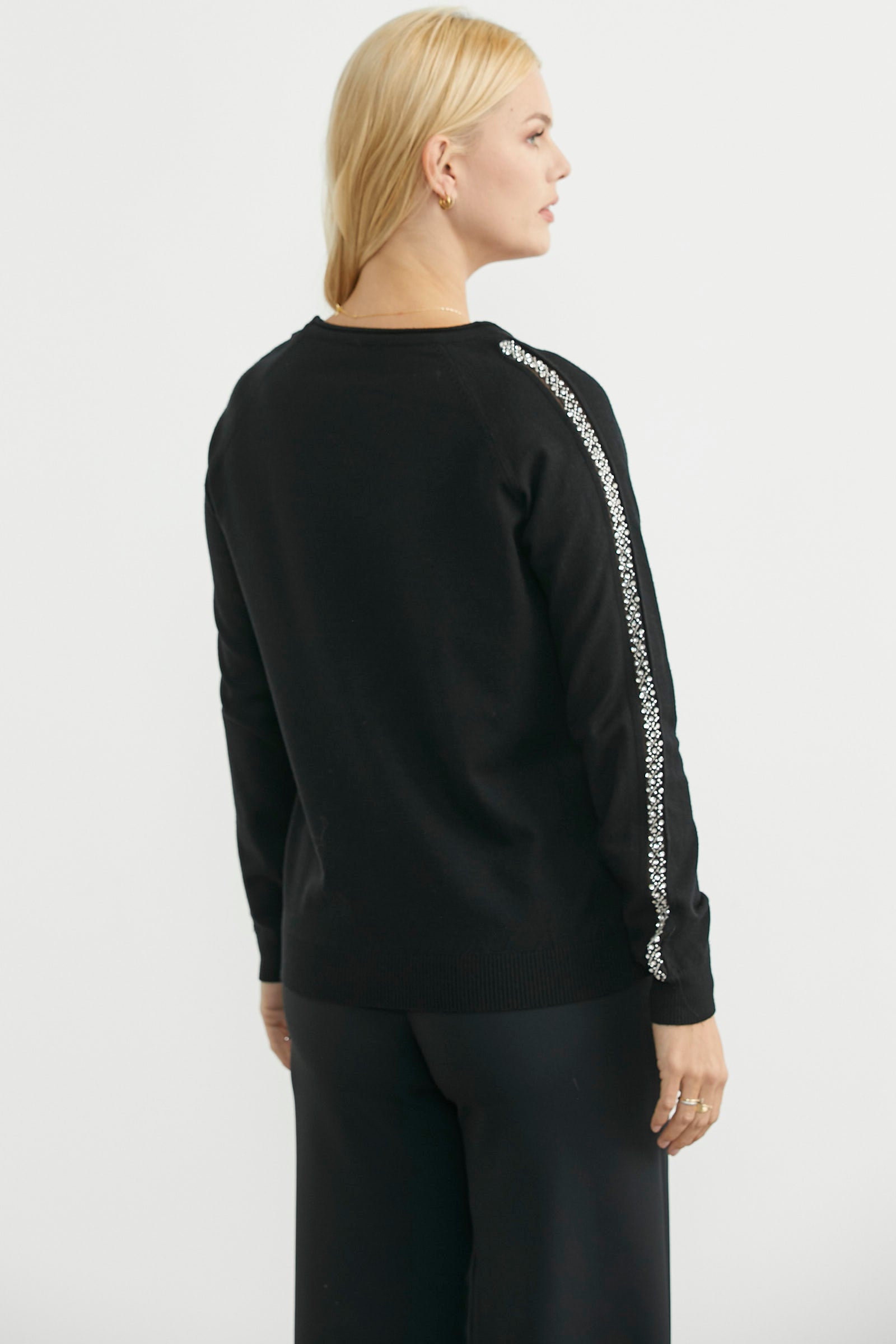 Yuvarlak yaka,uzun kol, yumuşak dokulu triko kazak.Omuzdan kol manşetine kadar boncuk detayı bulunmaktadır.