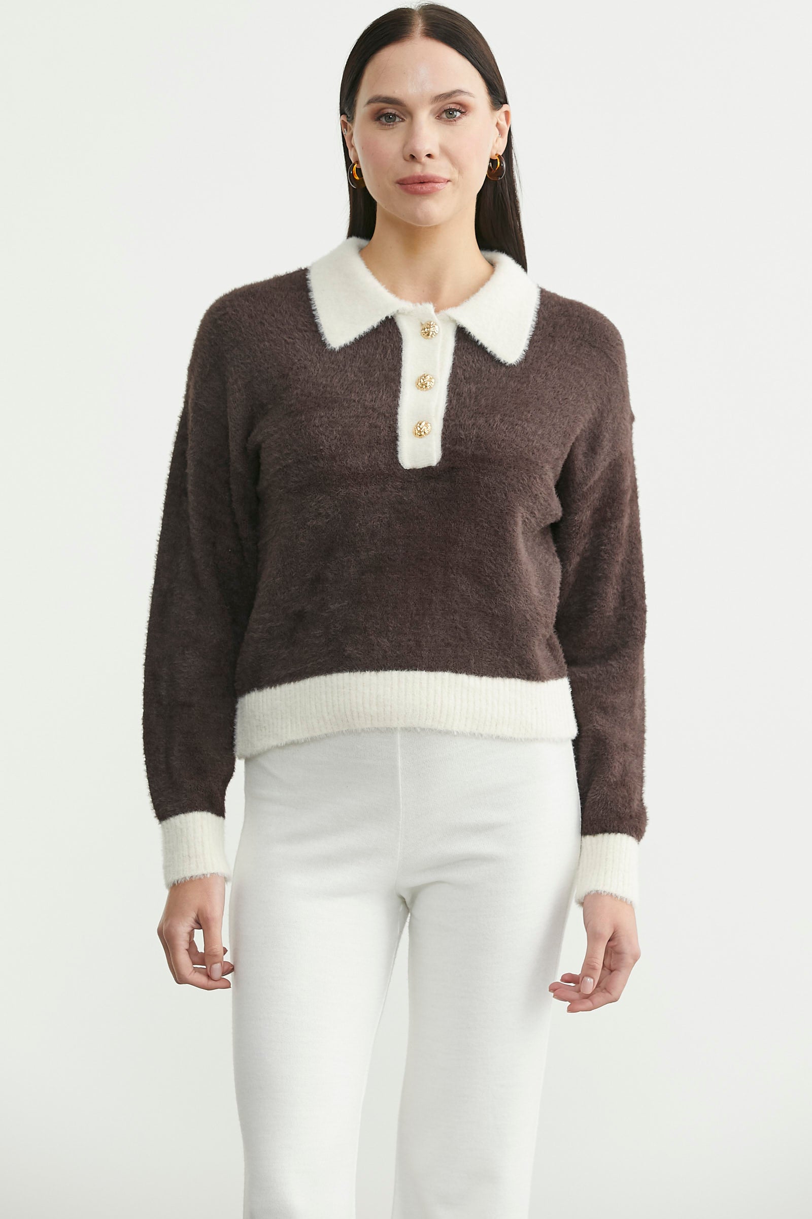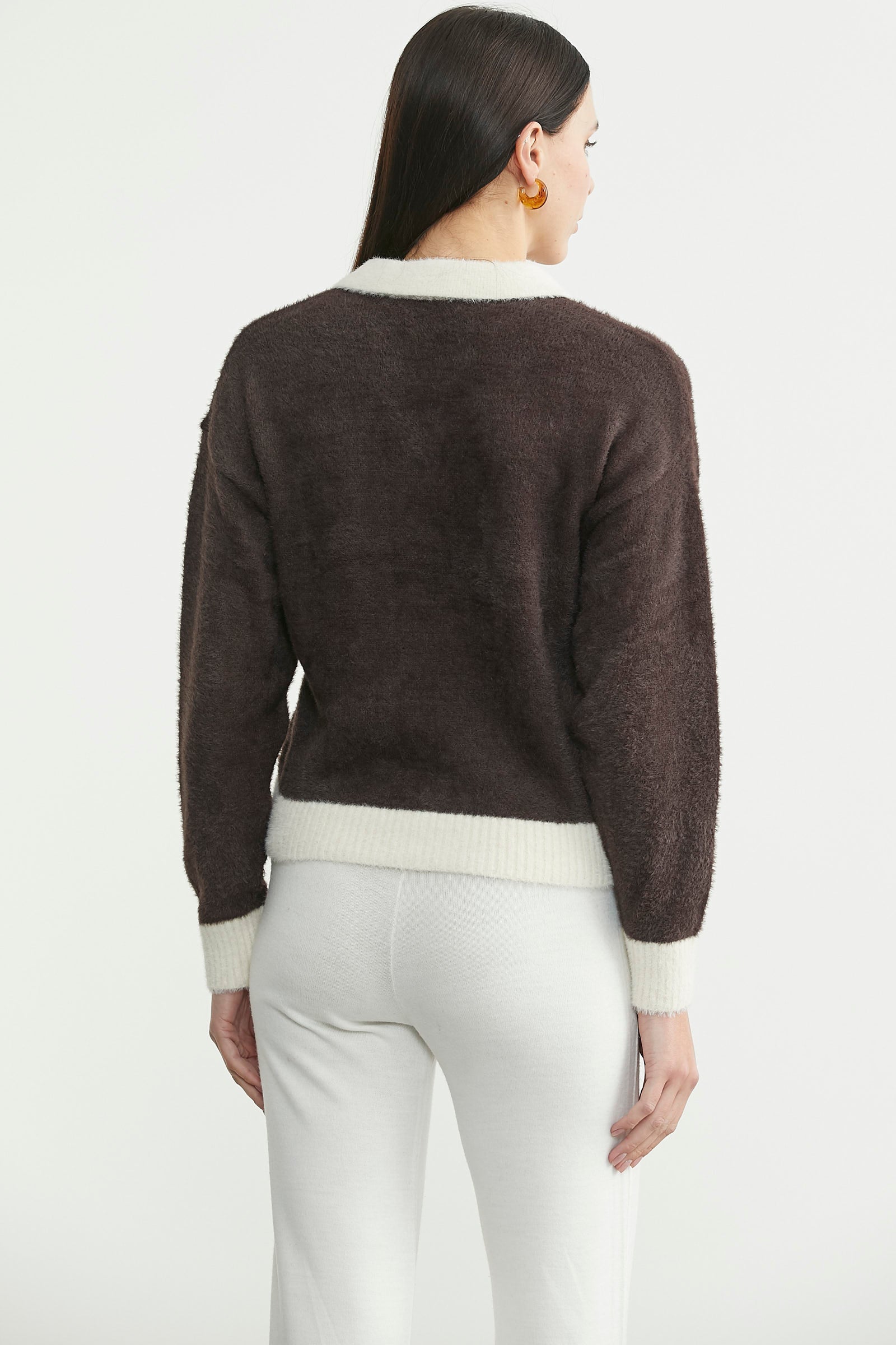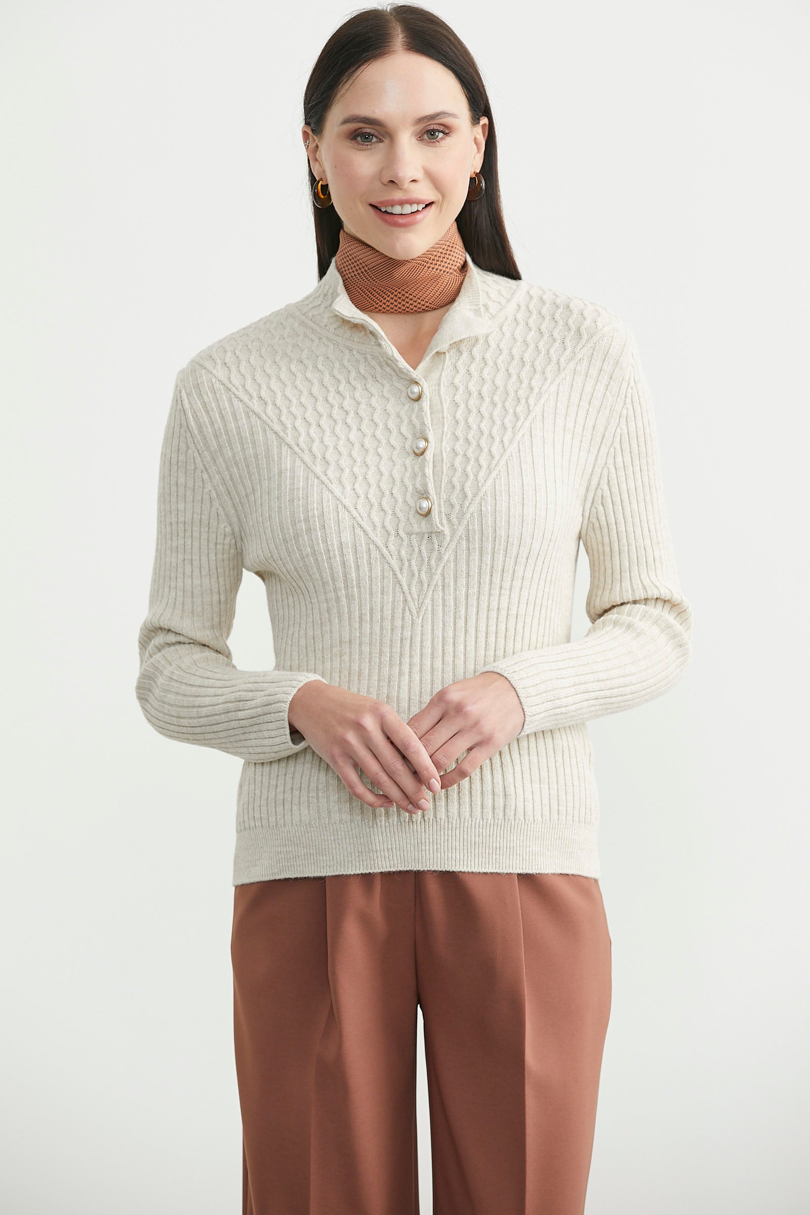 Bej rengi kuzu desenli polo yaka kazak da, kadın triko kazak ürünleri arasında adeta bir inci gibi parlıyor. Özellikle kış aylarında hayvan desenli kazakların sık tercih edildiği biliniyor. Bu desenler, sıcak, samimi ve sevimli bir hava oluşturduklarından çok beğeniliyor.