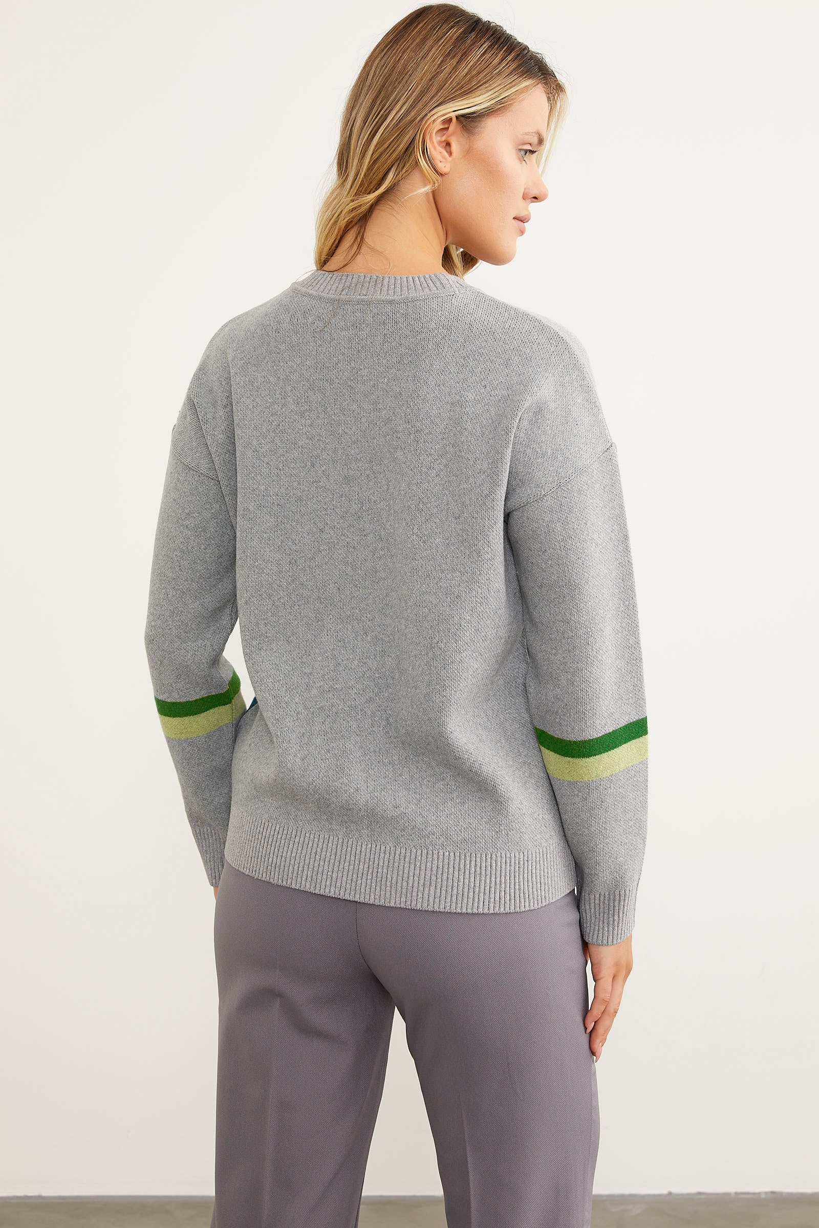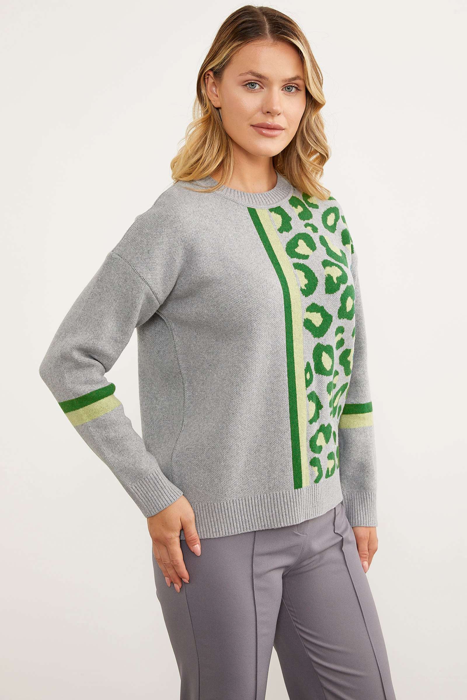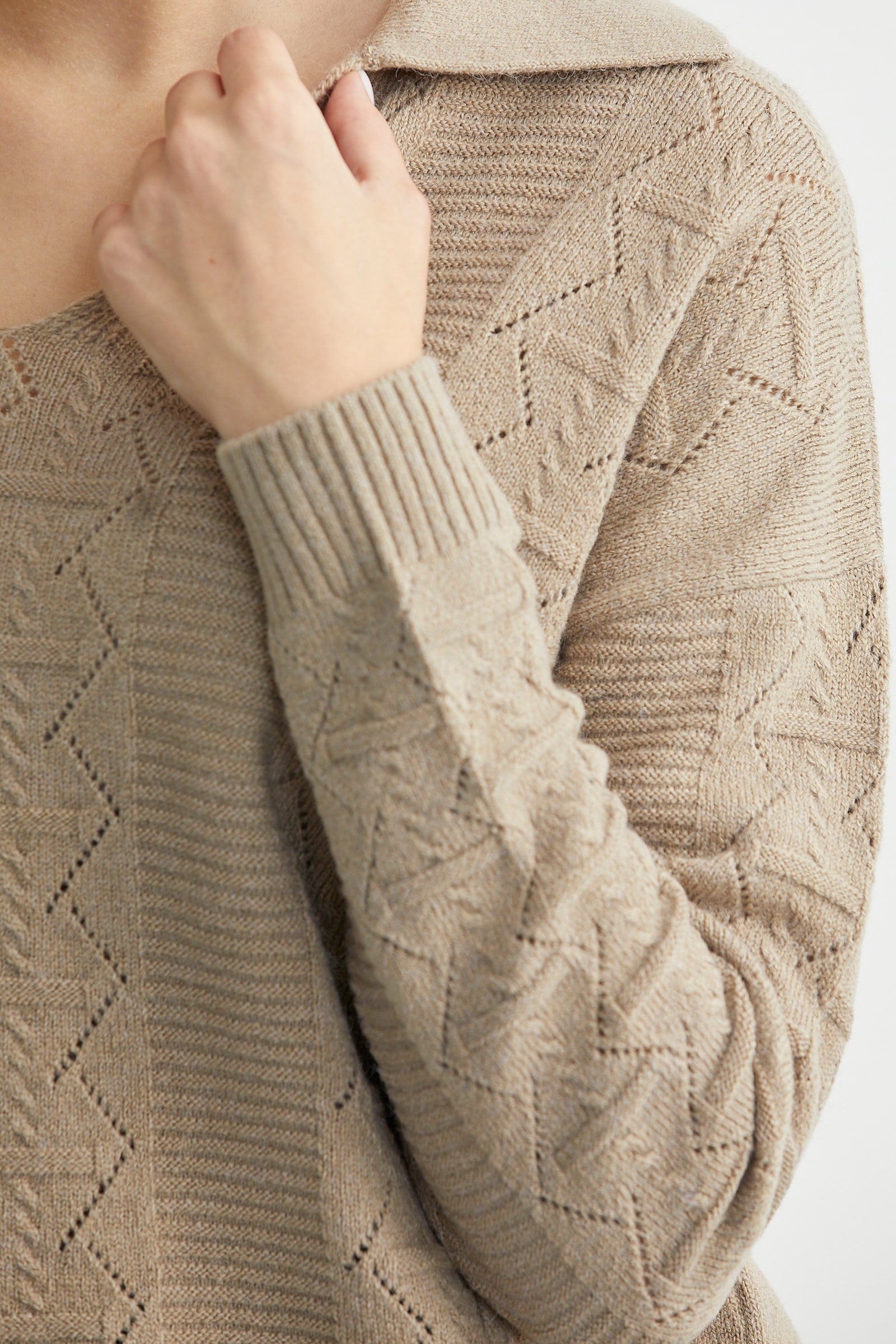 Bej rengi kuzu desenli polo yaka kazak da, kadın triko kazak ürünleri arasında adeta bir inci gibi parlıyor. Özellikle kış aylarında hayvan desenli kazakların sık tercih edildiği biliniyor. Bu desenler, sıcak, samimi ve sevimli bir hava oluşturduklarından çok beğeniliyor.
