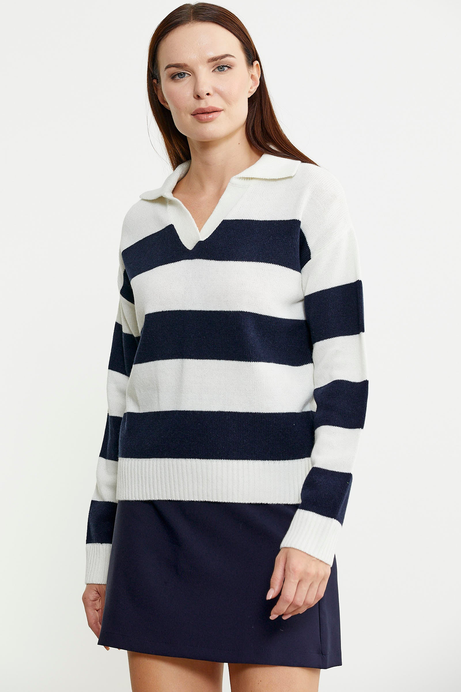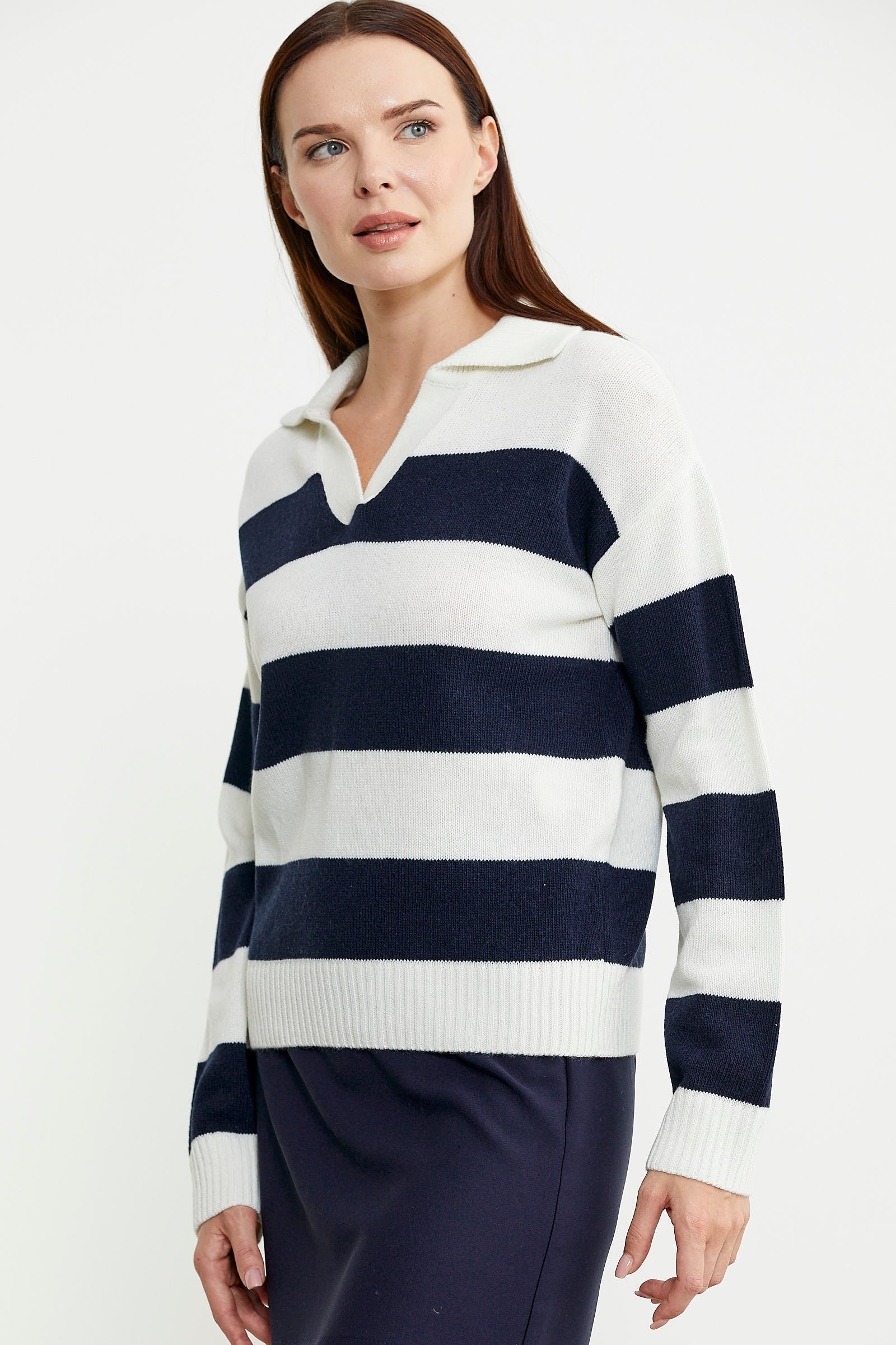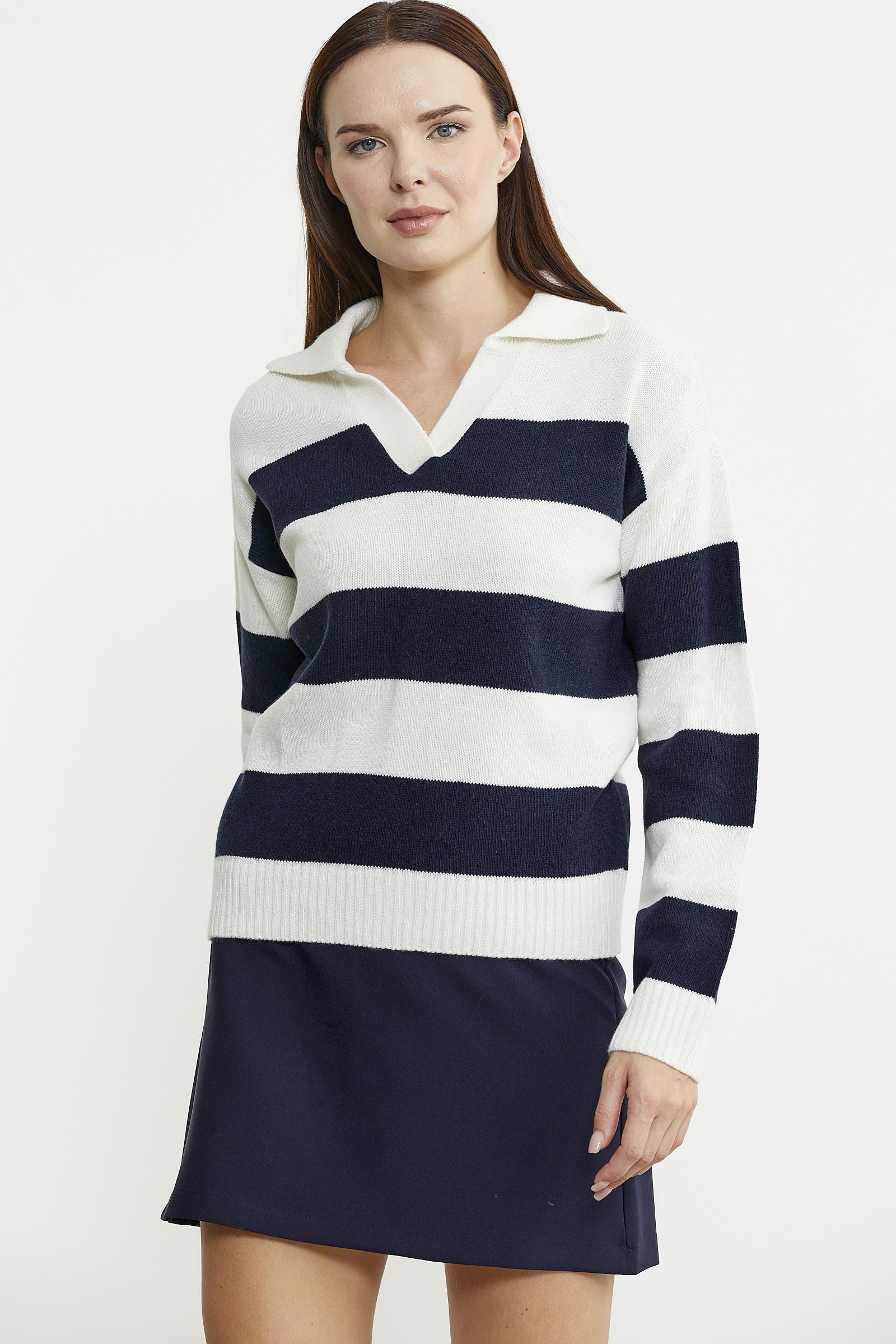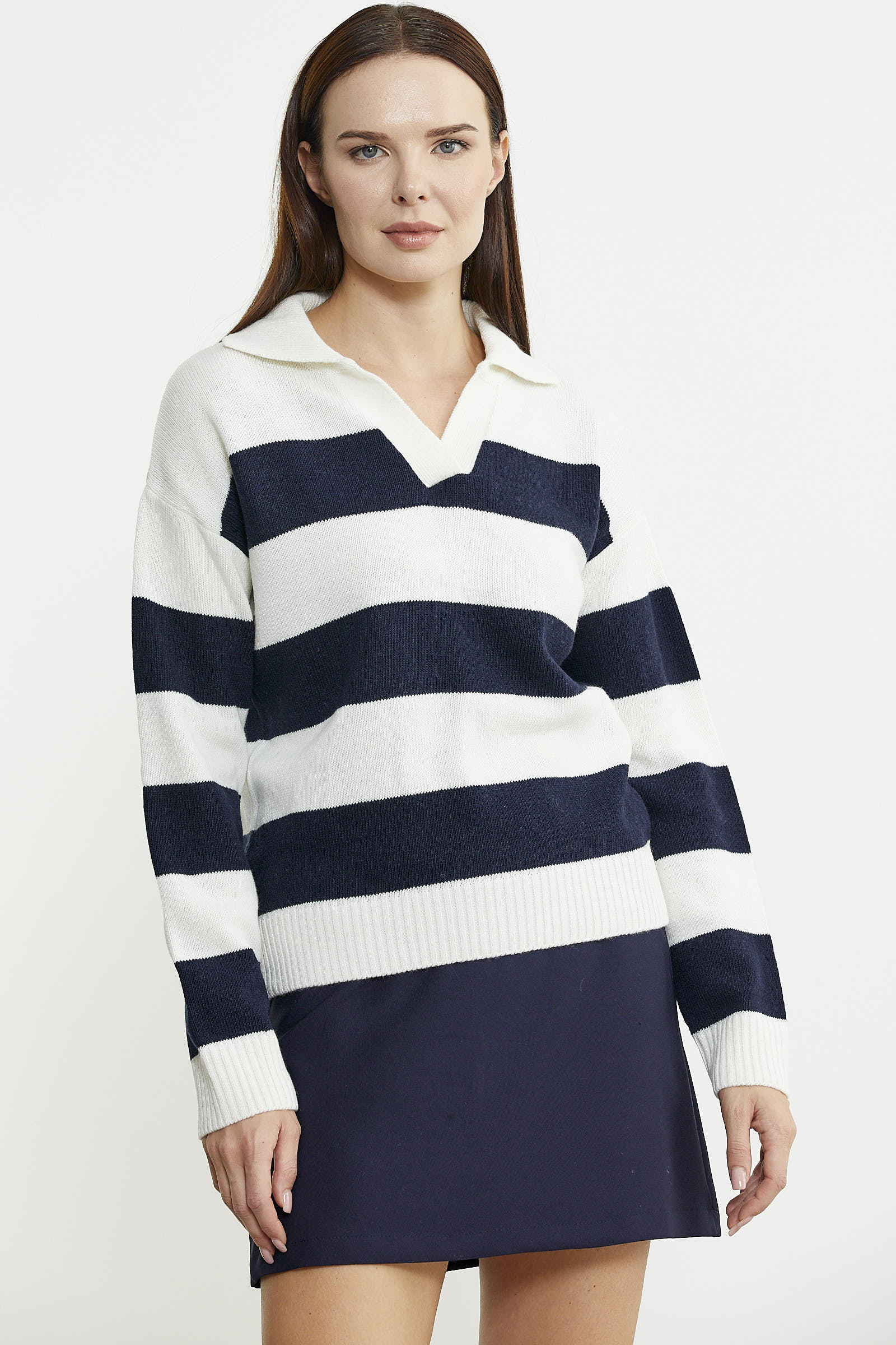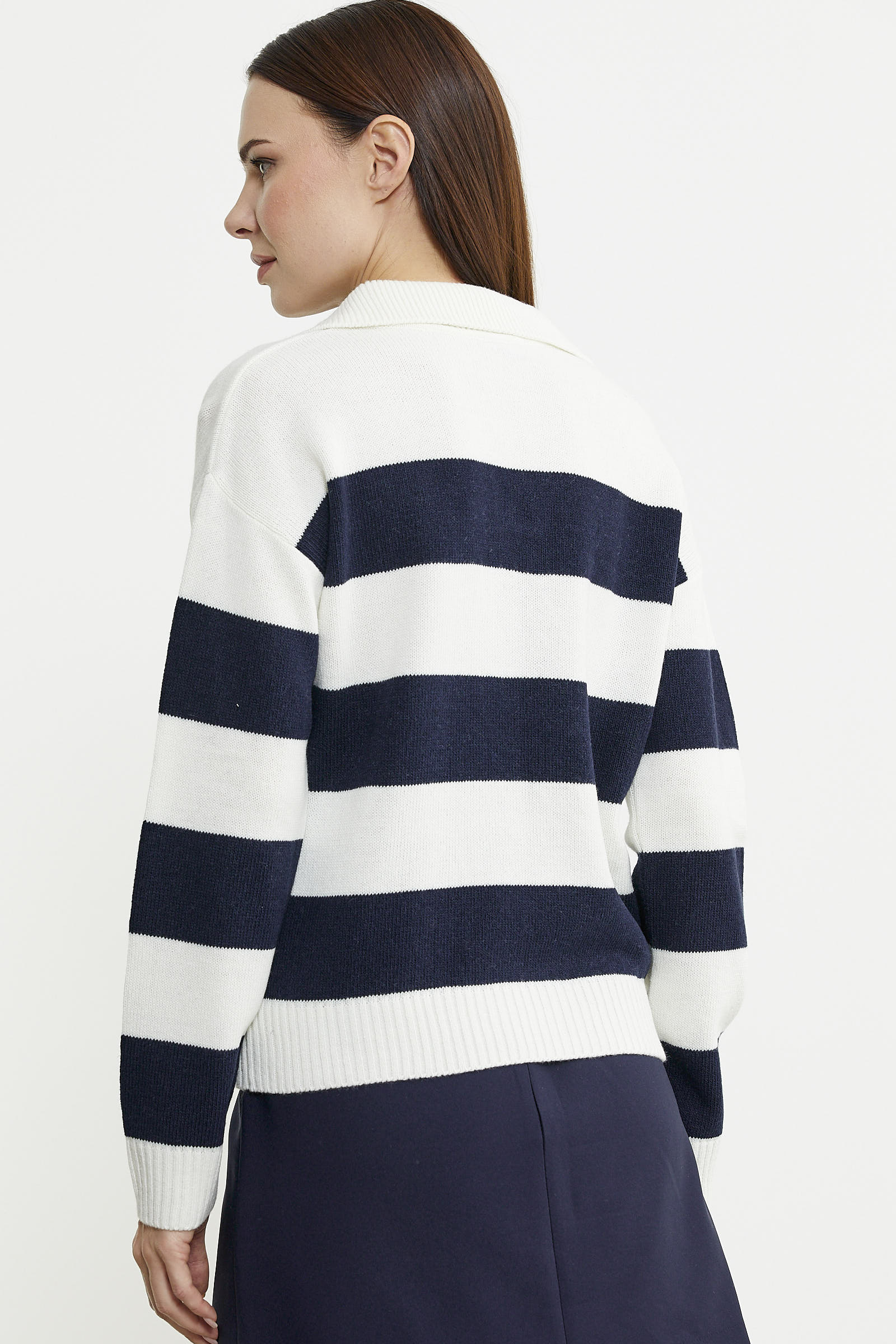 Açık polo yaka olarak tasarlanmış triko kazak, yüksek oranda yün içermektedir. Rahat kalıbı ve çizgili tasarımıyla kullanım kolaylığı sağlamaktadır.