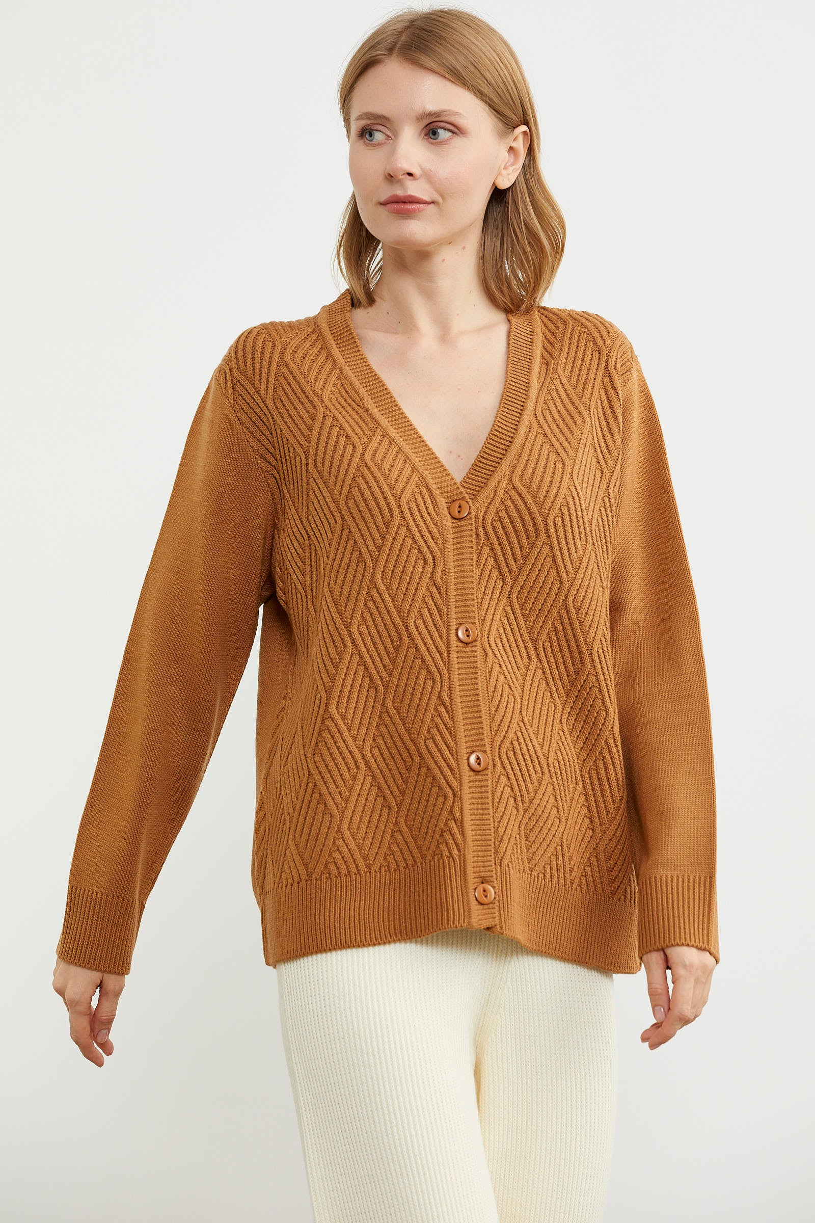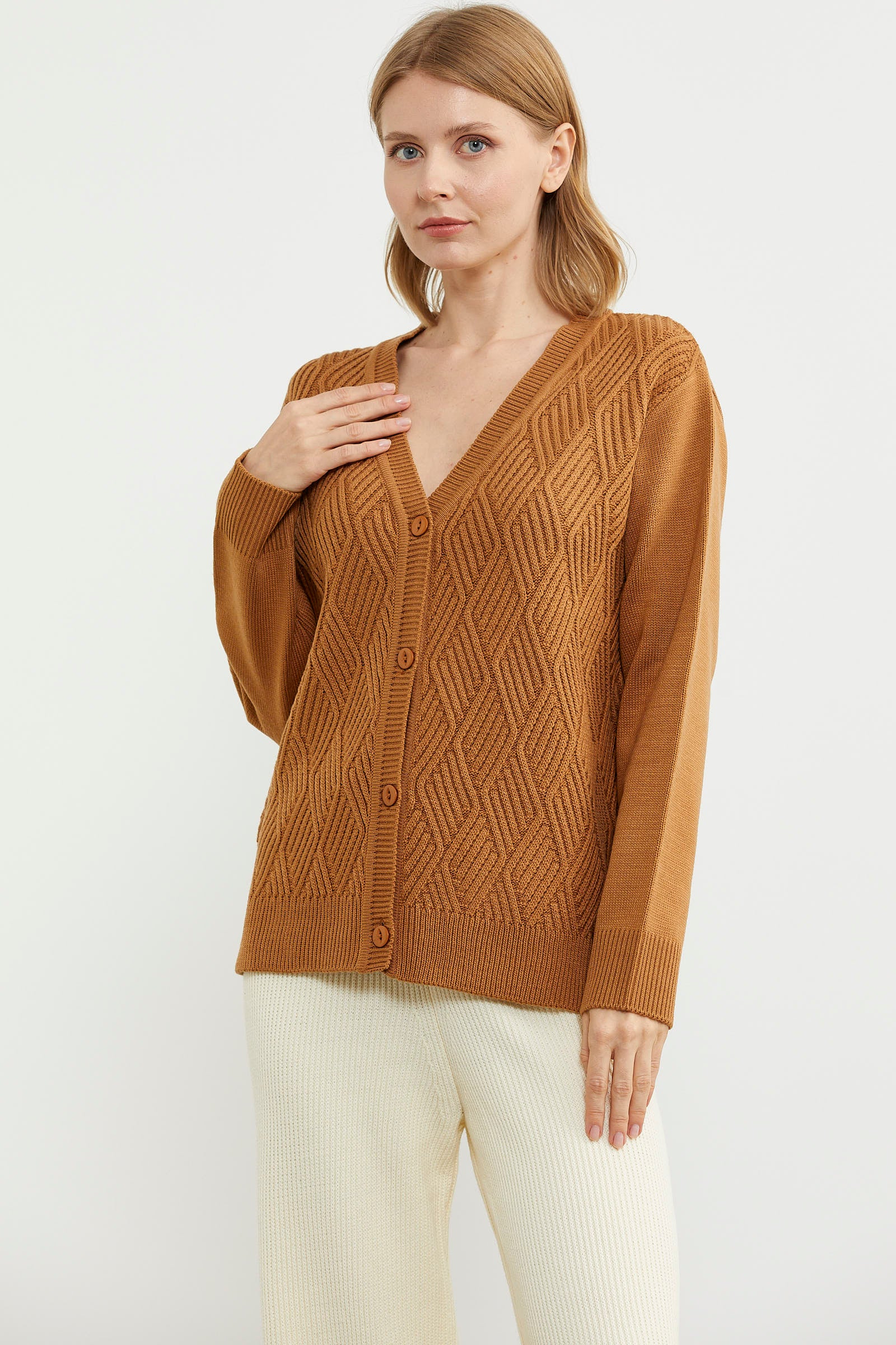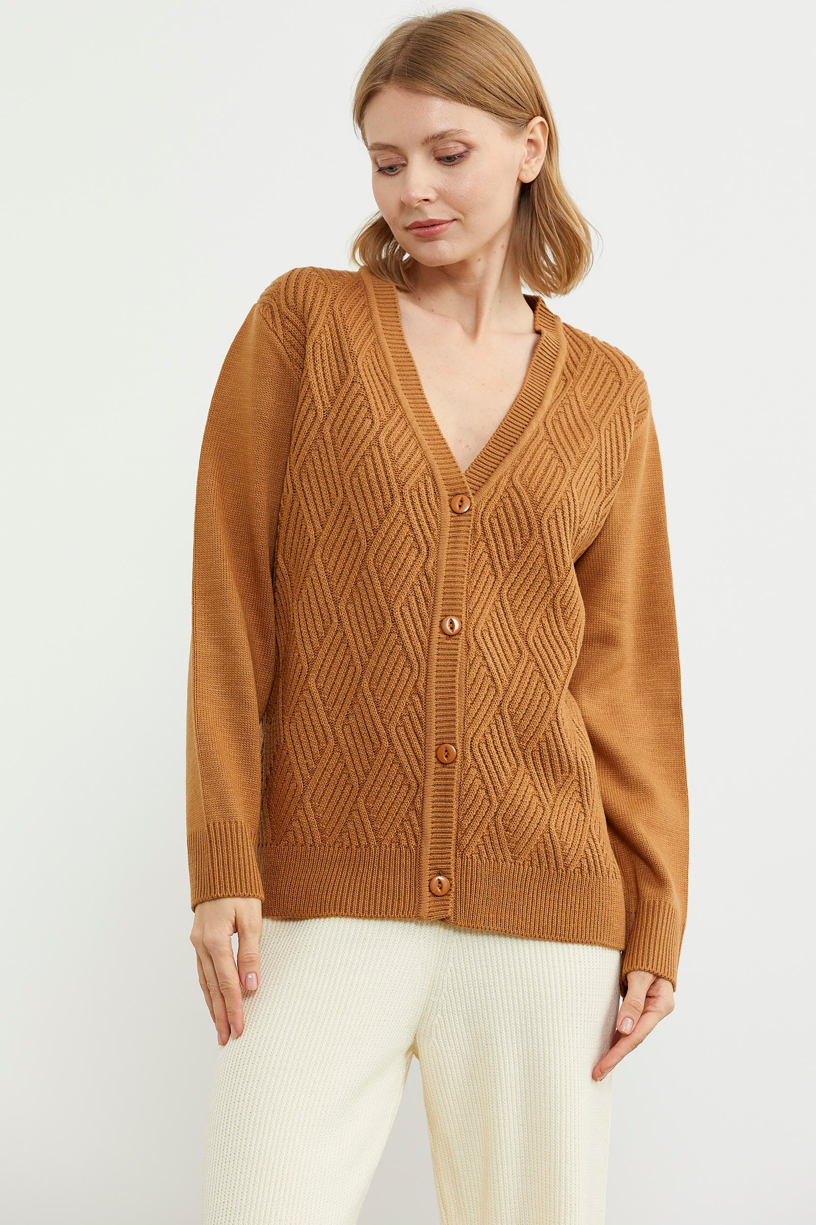 Ajurlu Düğmeli Triko Hırka - Kamel