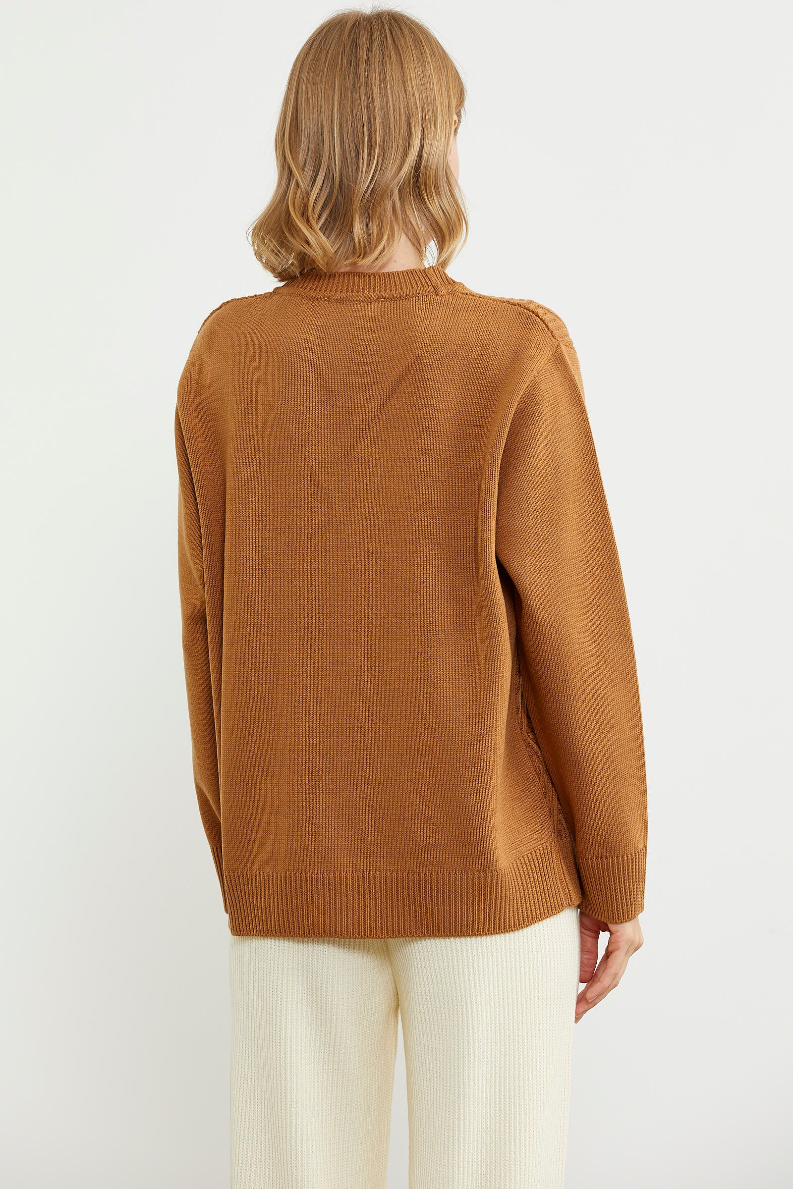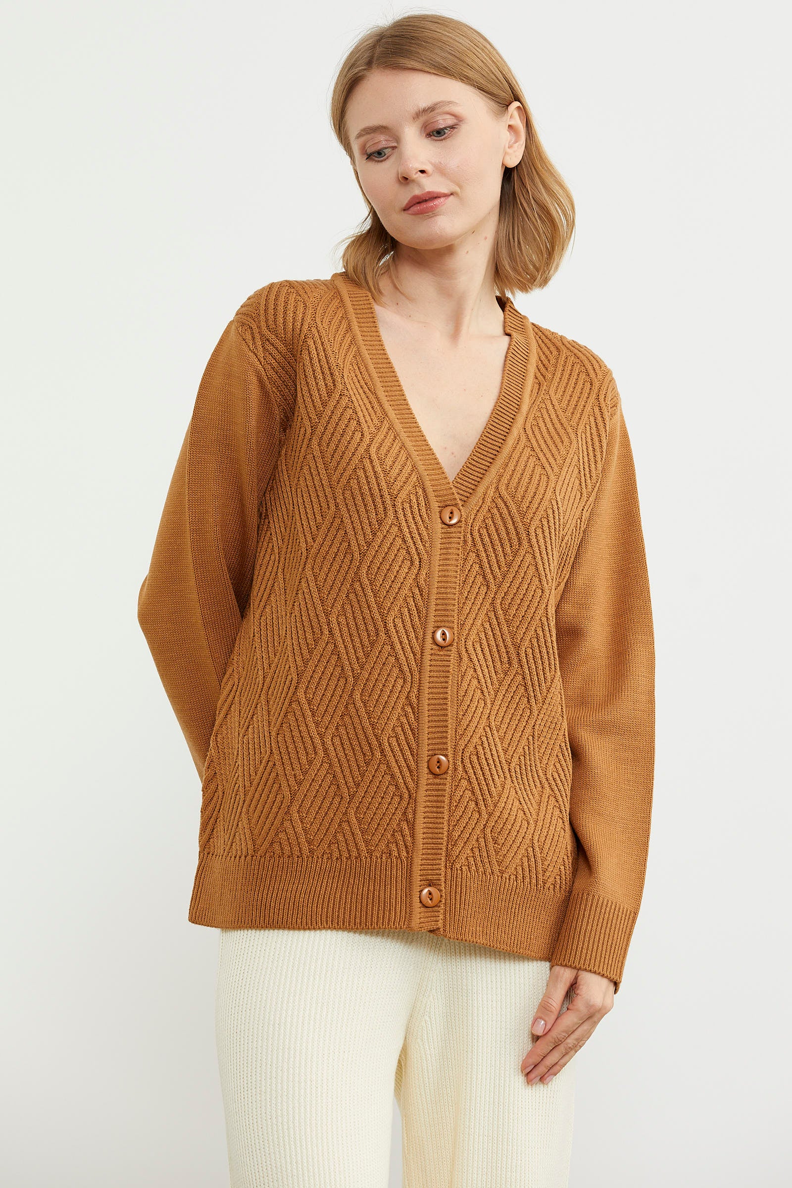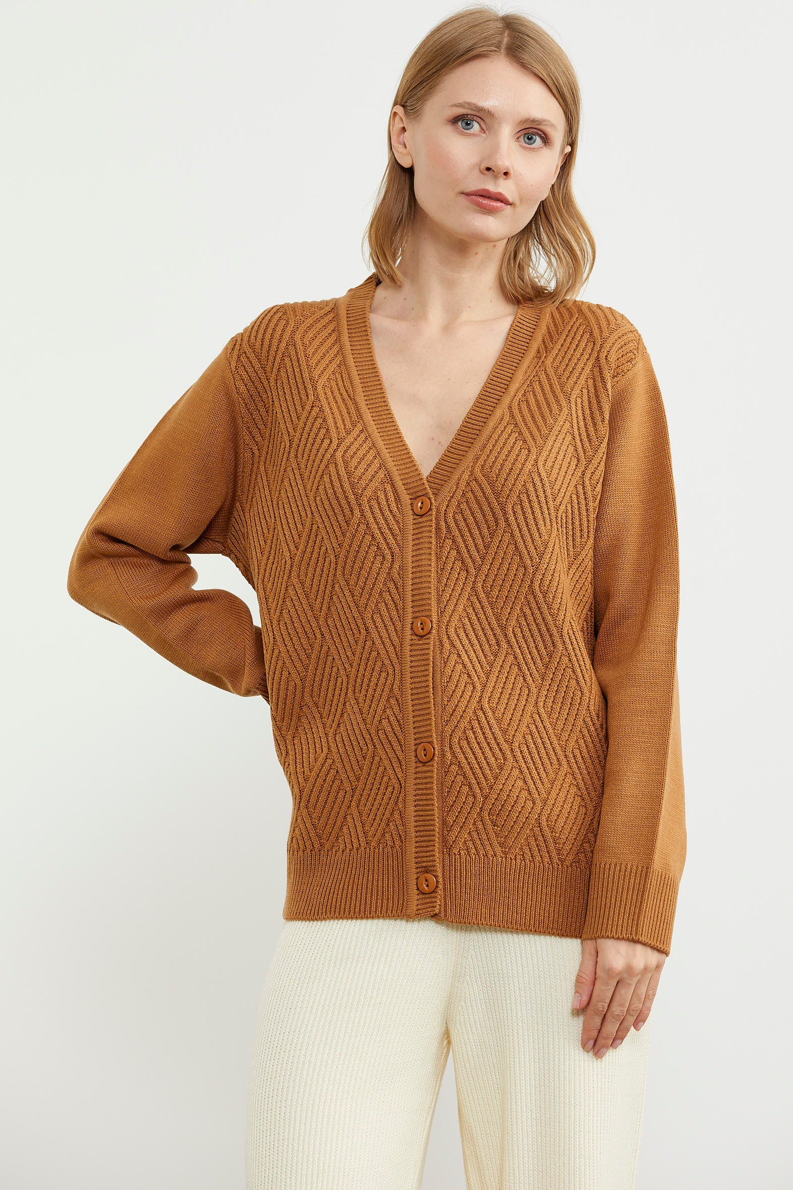 Ajurlu Düğmeli Triko Hırka - Kamel