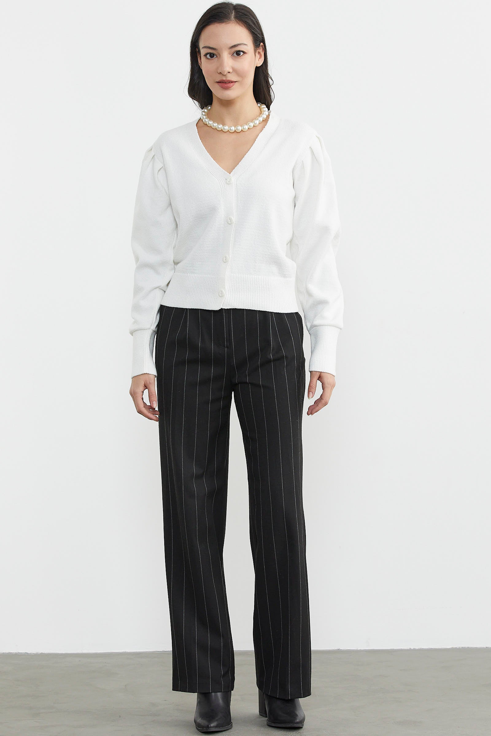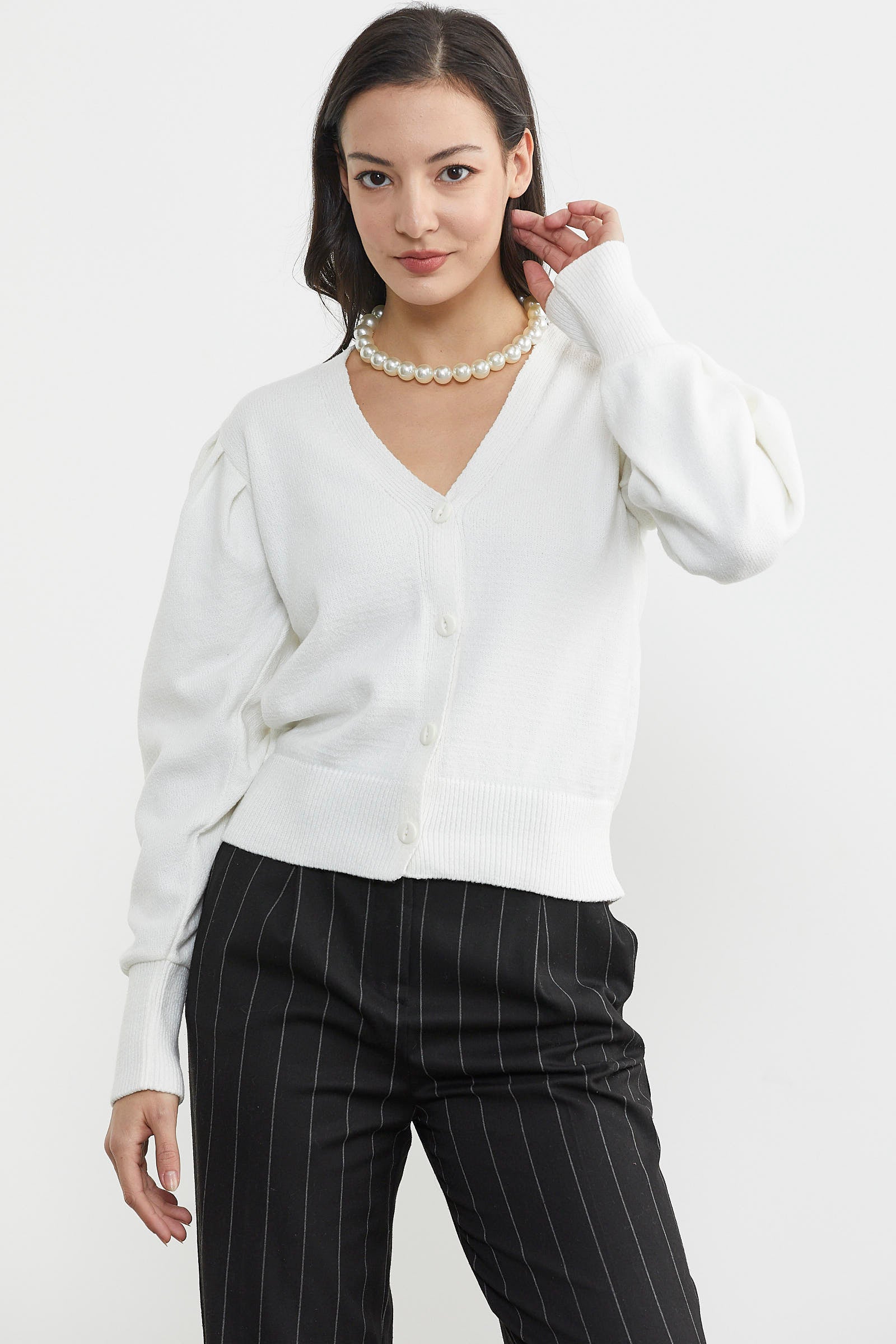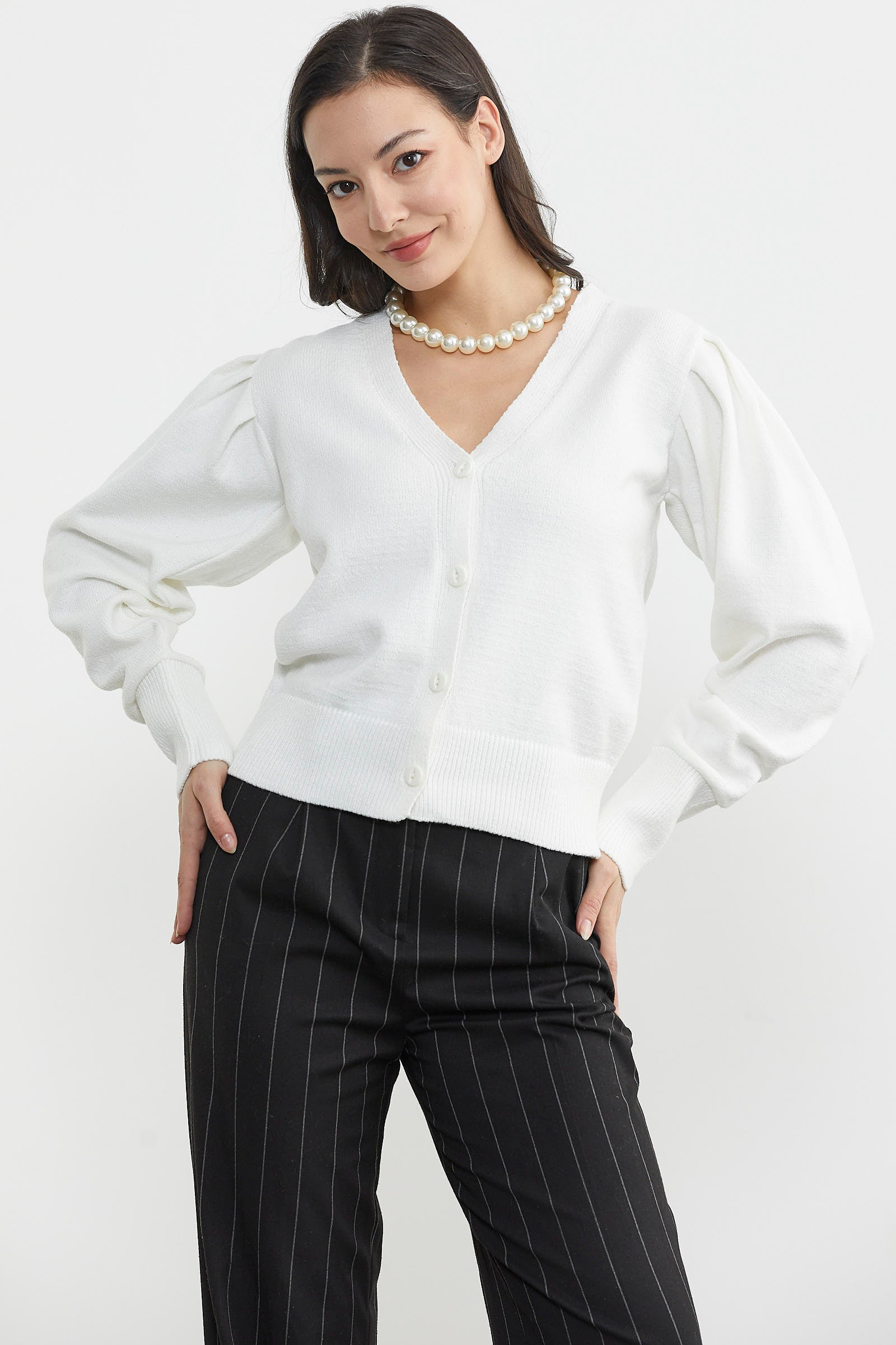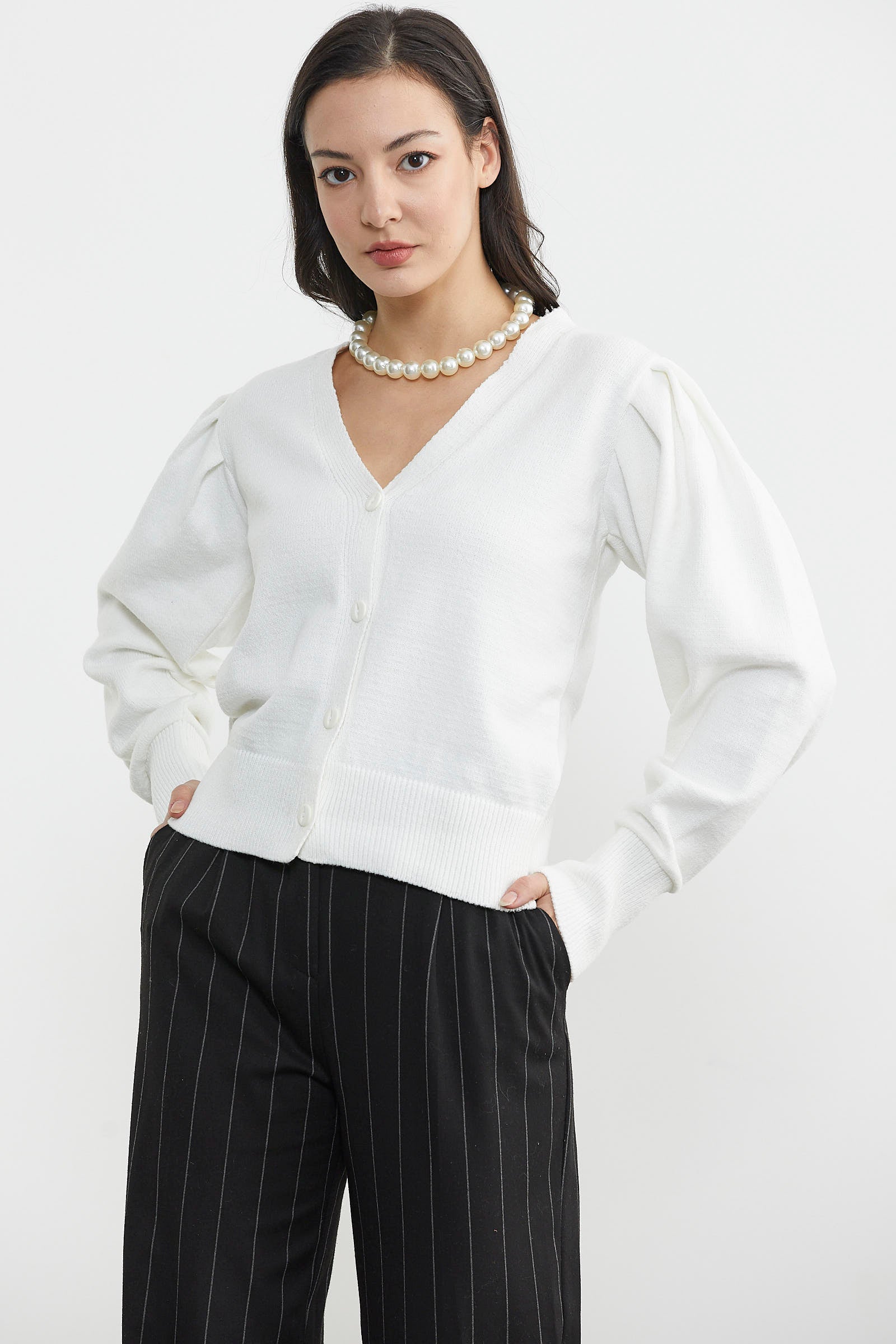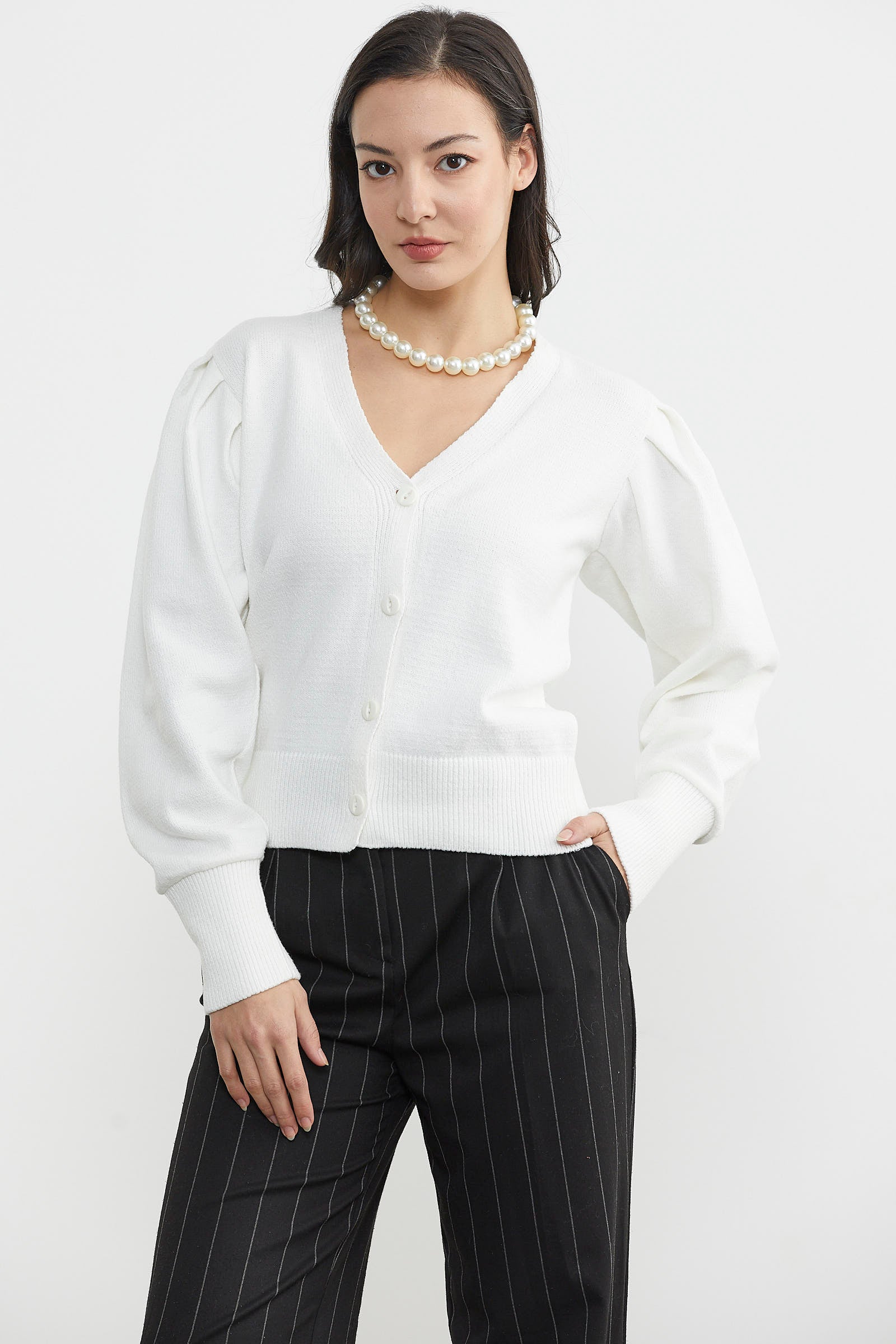 Balon kol detayı ile sıradanlıktan uzaklaşan önden düğmeli V yaka esnek dokusu ile cildinize hassas davranan etek ucu ve kol ağızı lastikli basic triko hırka günlük kullanımınıza uygundur