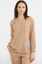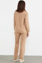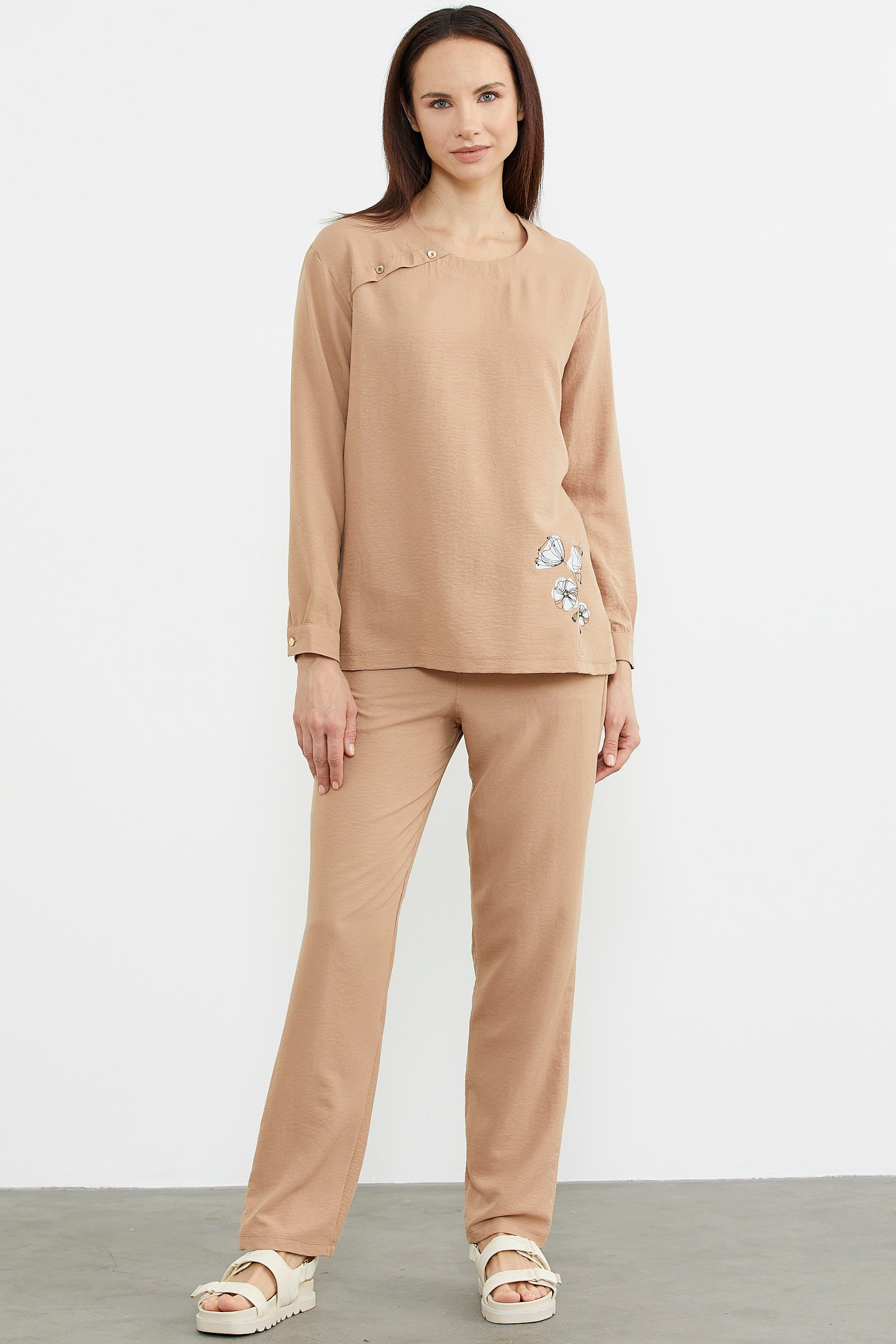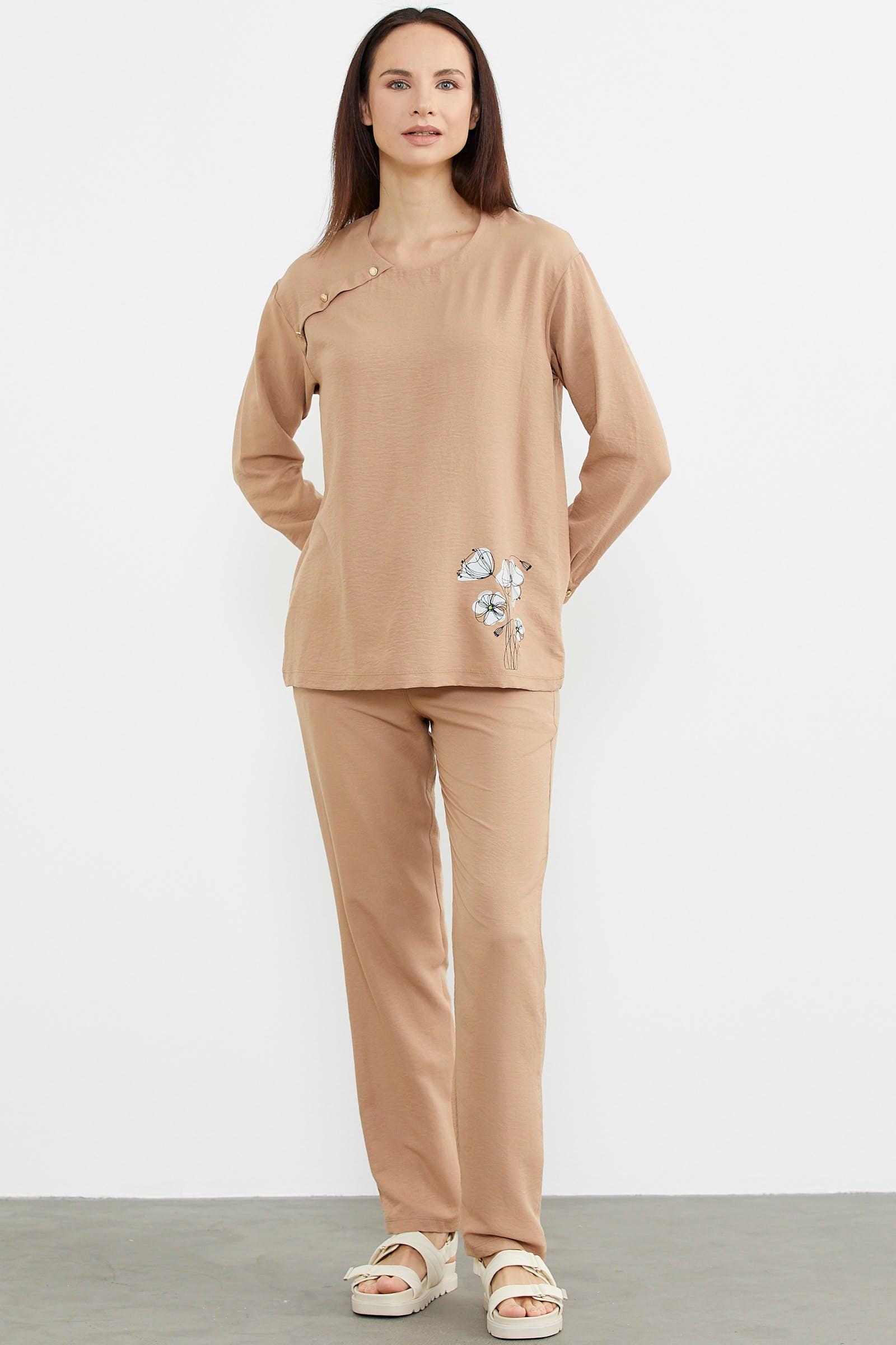 Baskı Detaylı Uzun Kol Krep Takım - Kamel