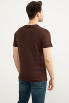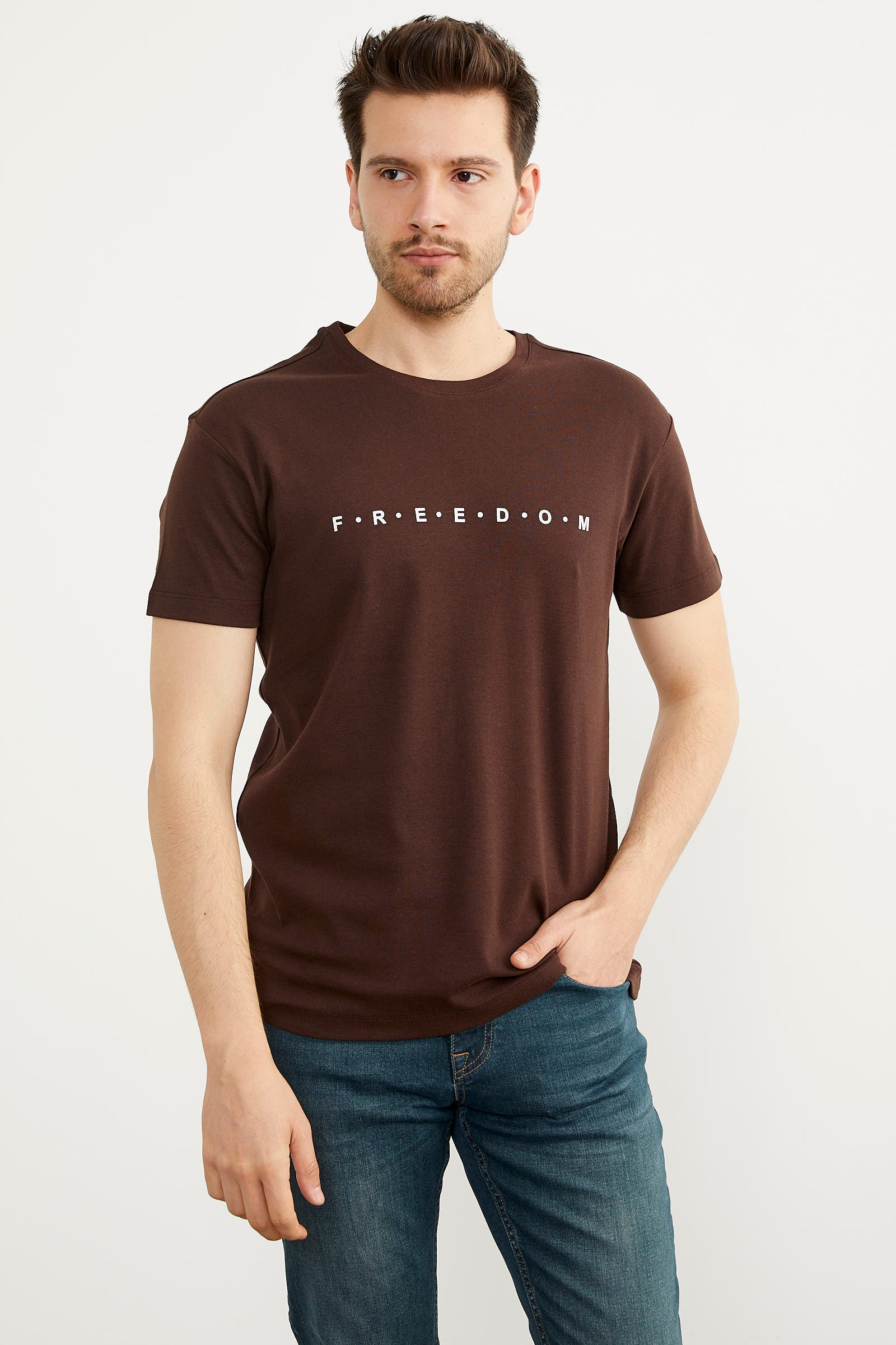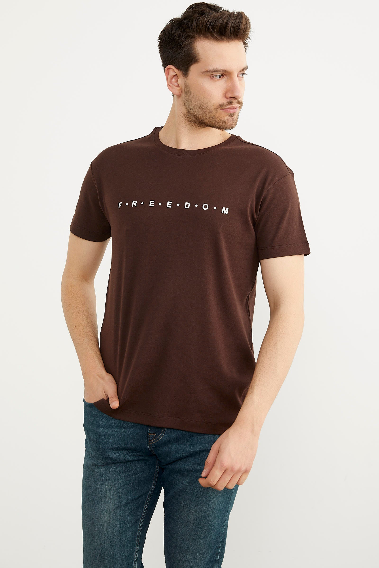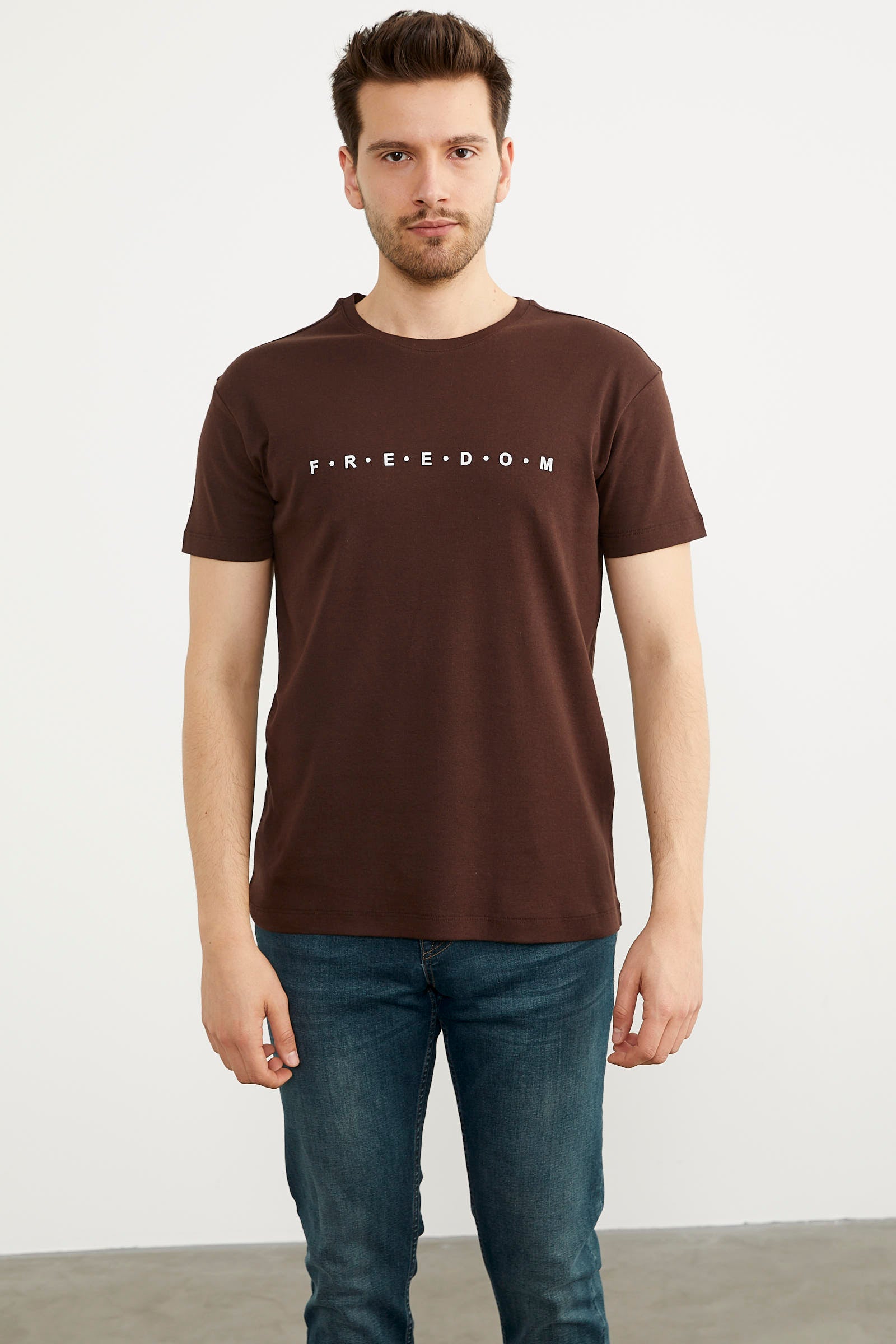 Baskılı Sıfır Yaka Pamuk Tişört - Kahve