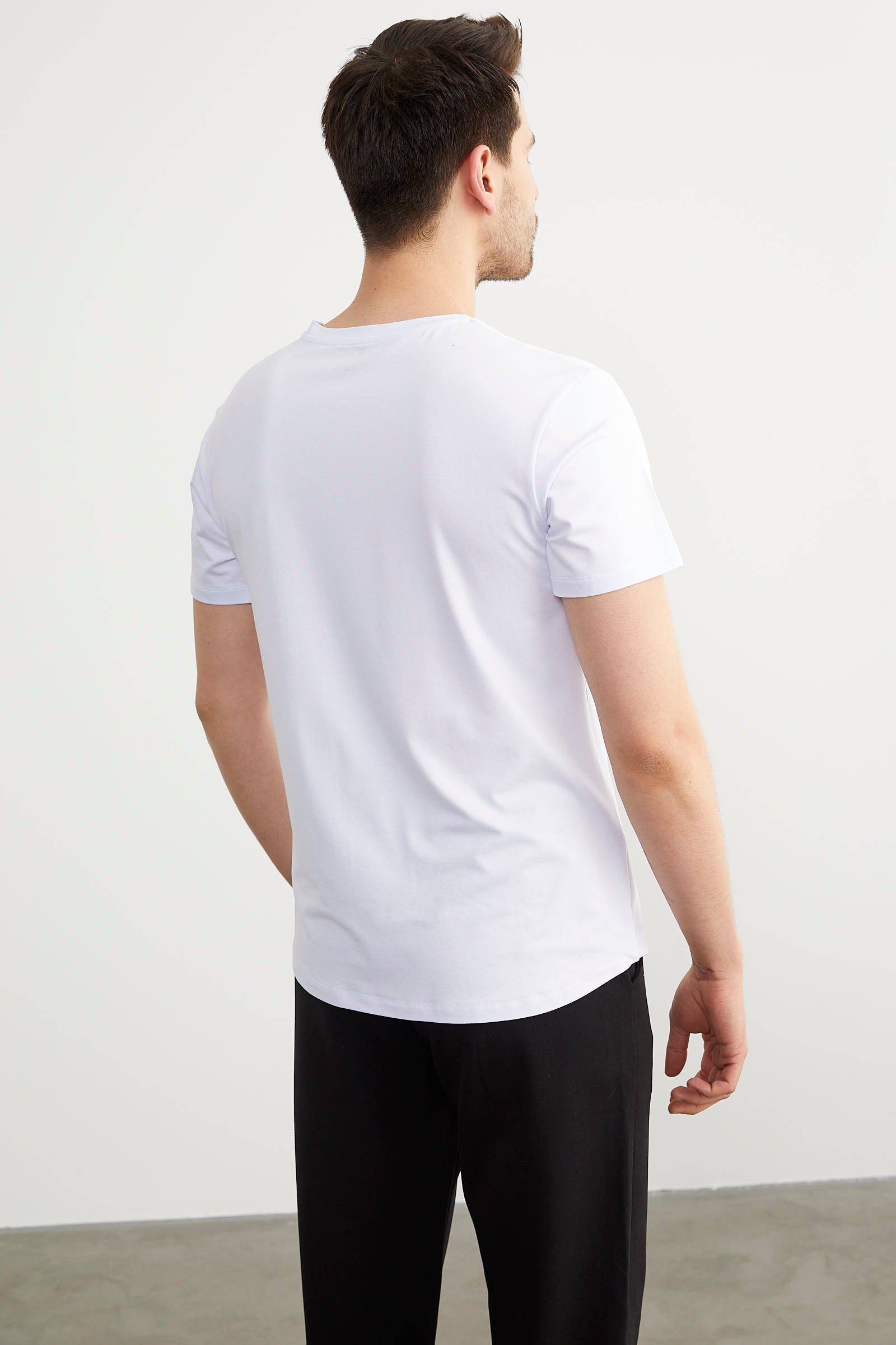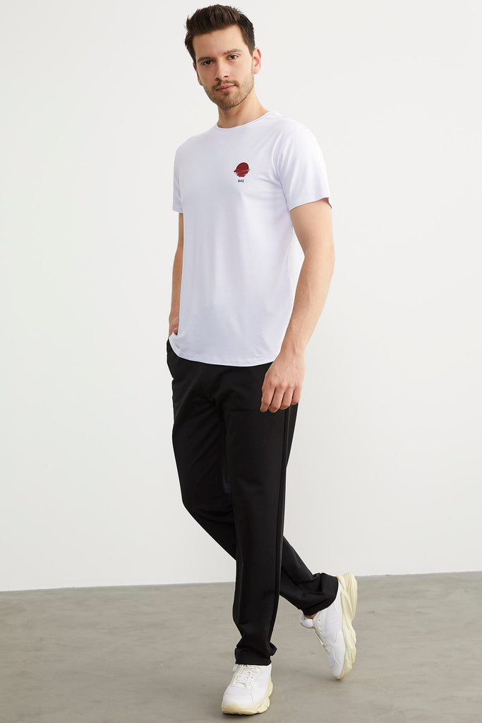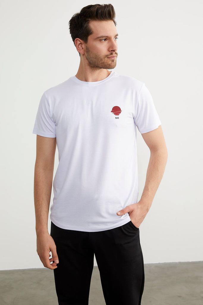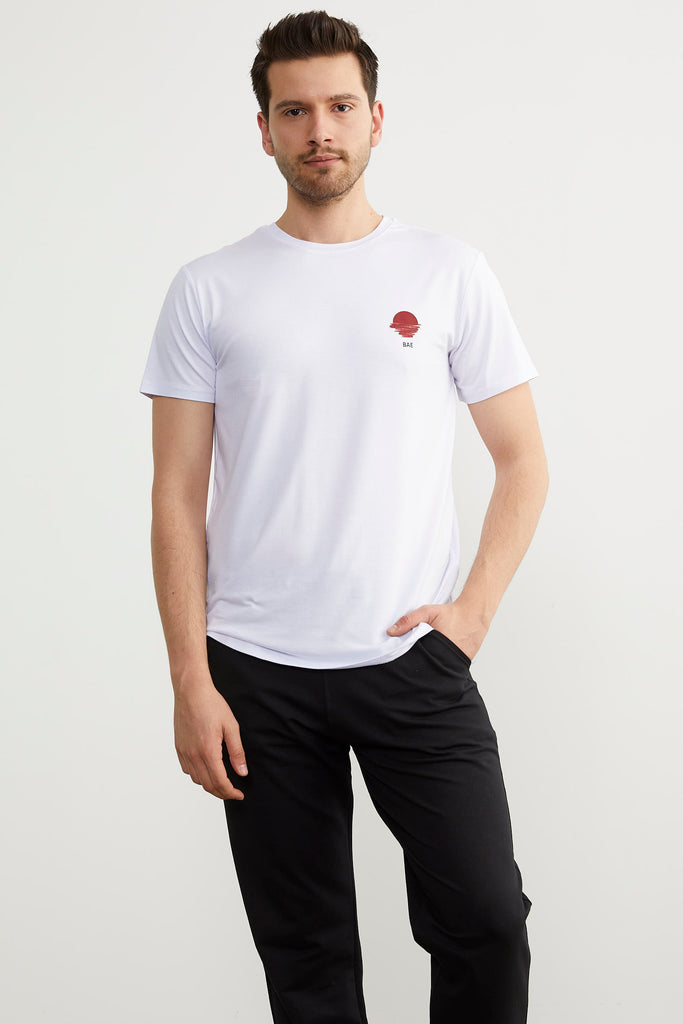 Baskılı Sıfır Yaka Penye Tişört - Beyaz